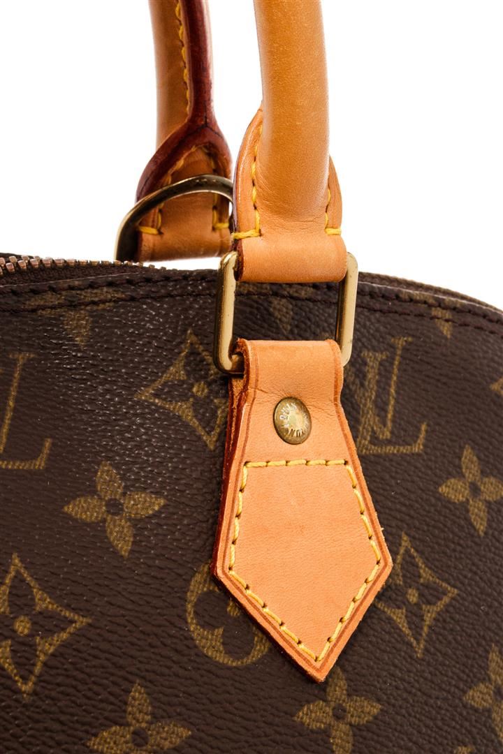 Louis Vuitton Brown Monogram Canvas Leather Alma Satchel Bag. All available information is listed in the description and shown in the photos. Louis Vuitton Brown Monogram Canvas Leather Alma Satchel Bag with brown coated canvas, monogram pattern, brass hardware, leather trim, rolled handles, leather trim embellishment, canvas lining & single interior pocket, zip closure at top. Height: 9" Width: 12.75" Depth: 6.25", Handle Drop: 3" / 22.86 x 32.38 x 15.87 cm