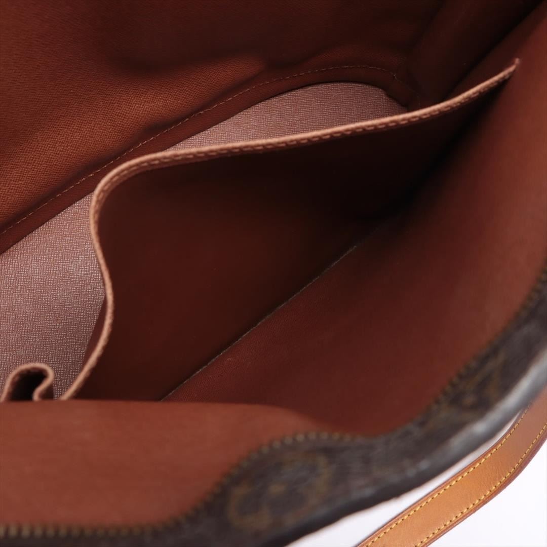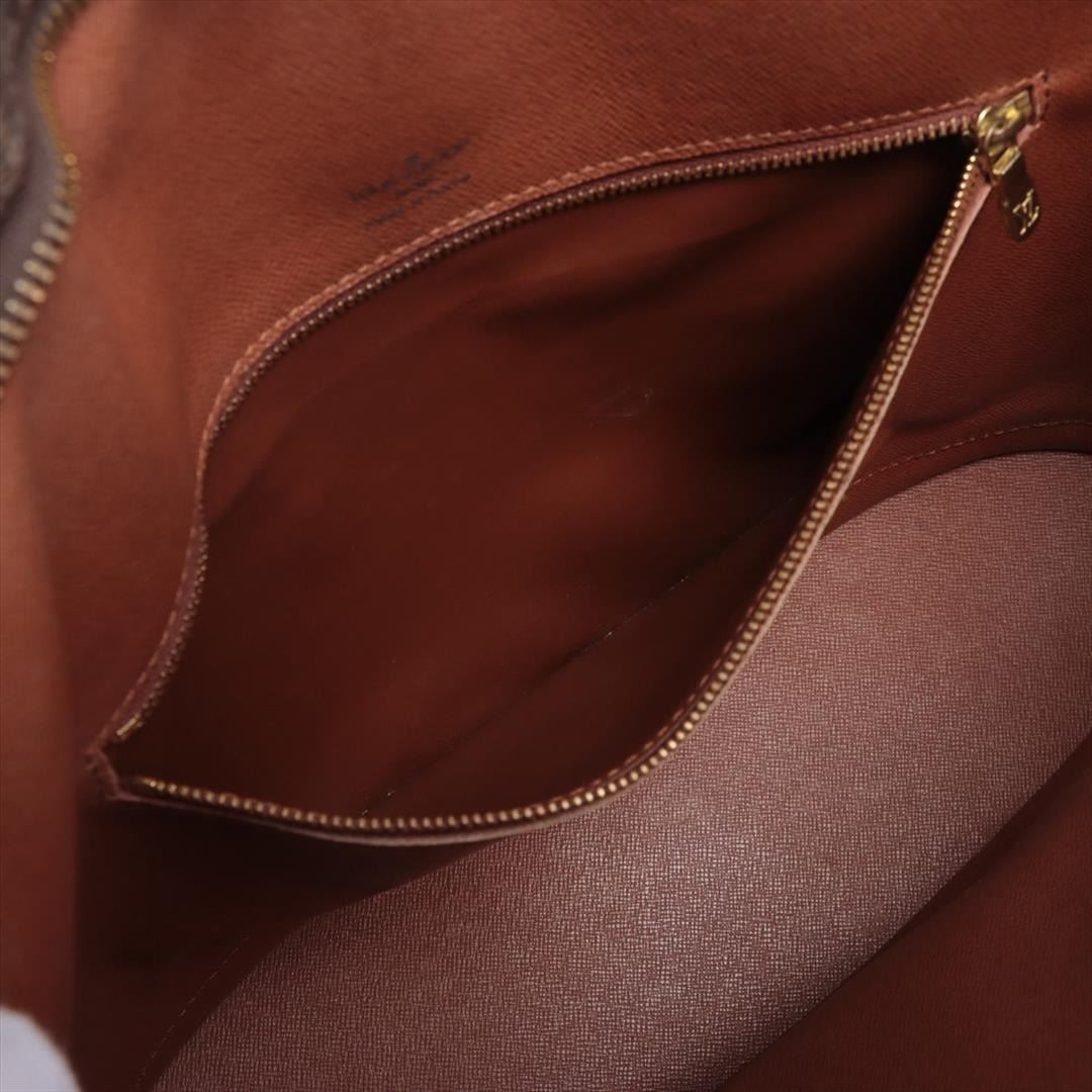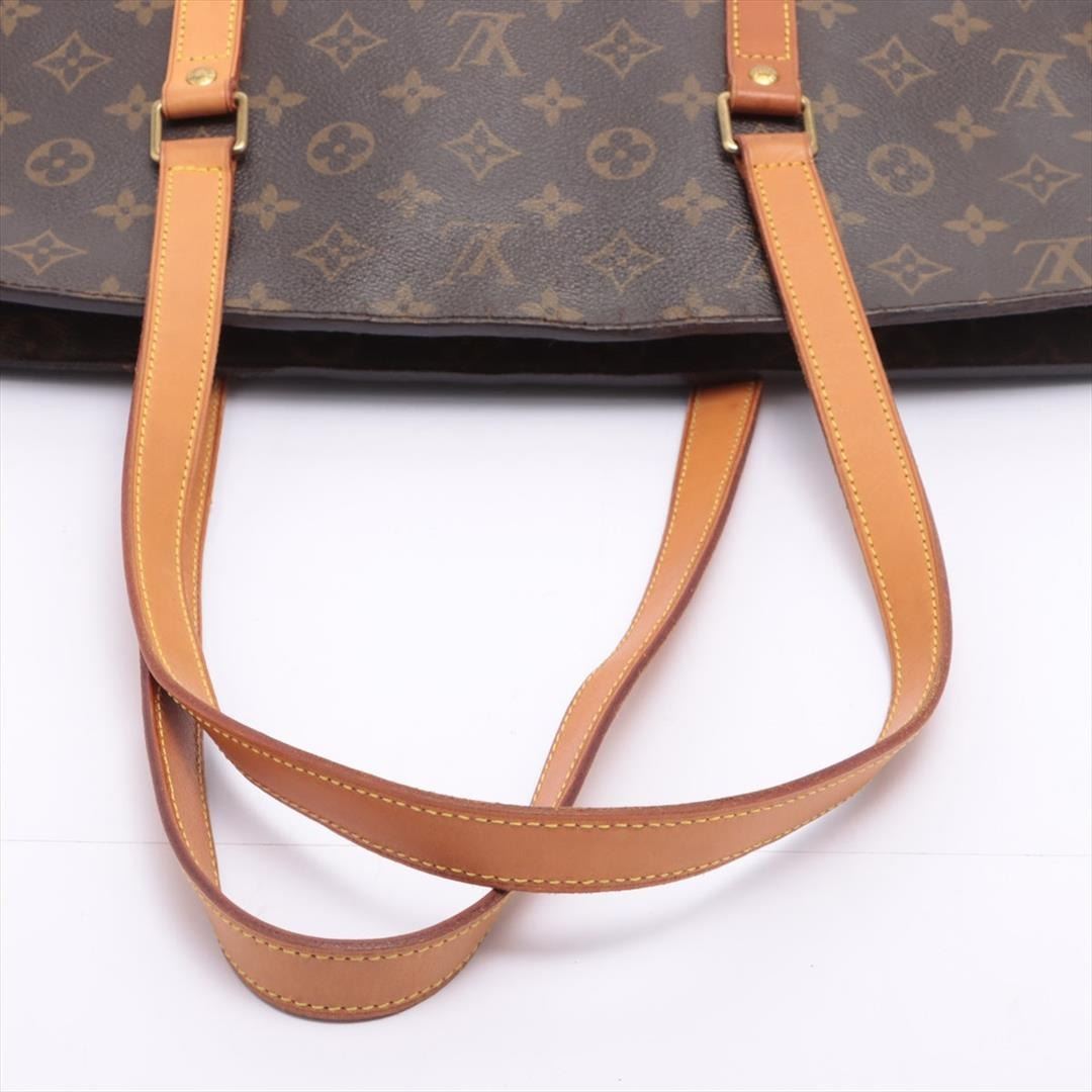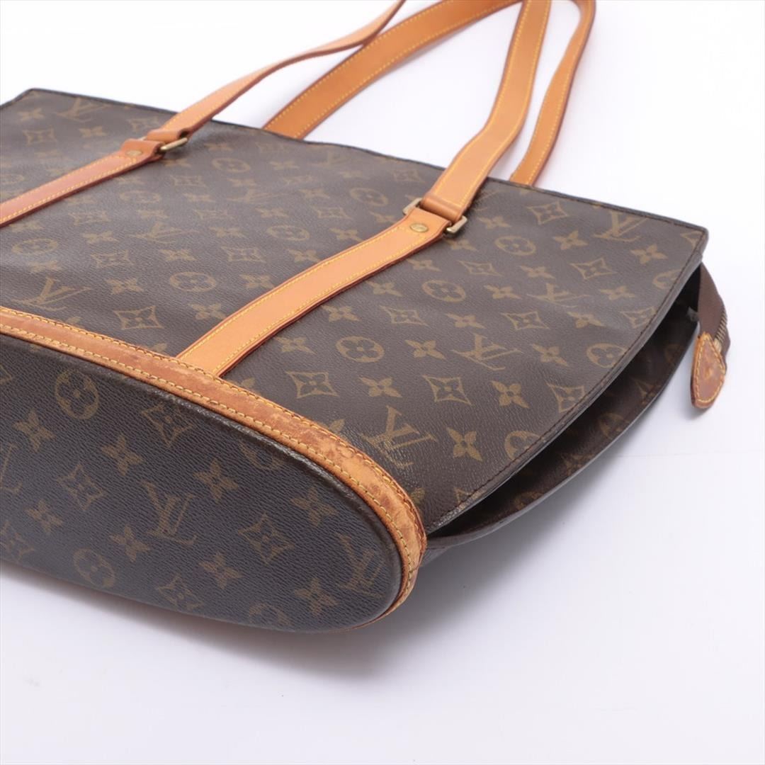Brown and tan monogram coated canvas Louis Vuitton Babylone tote with brass hardware, tan vachetta leather trim, dual flat shoulder straps, beige Alcantara lining, dual pockets at interior walls; one with zip closure and zip closure at top. 6 15.5"
