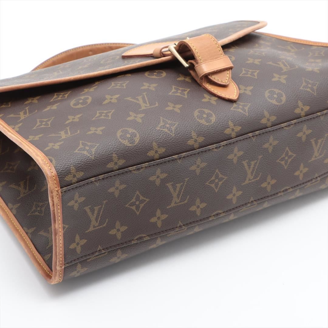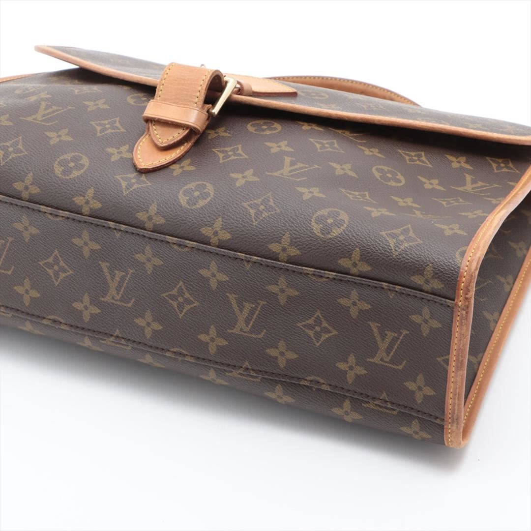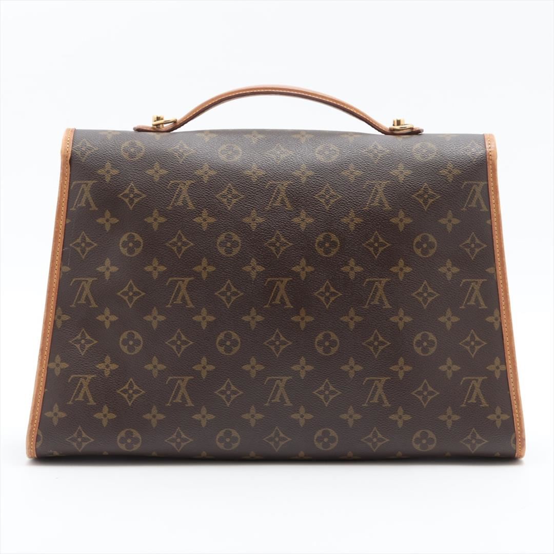 Brown monogram coated canvas Louis Vuitton Beverly GM briefcase with gold-tone hardware, tan leather trim, single flat handle & single optional adjustable shoulder strap, brown canvas lining & single interior pocket and flap with buckle closures at front.
