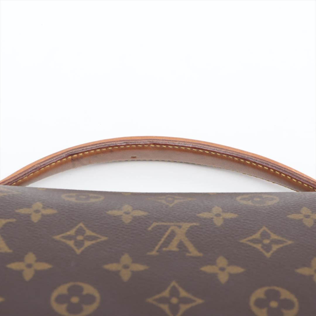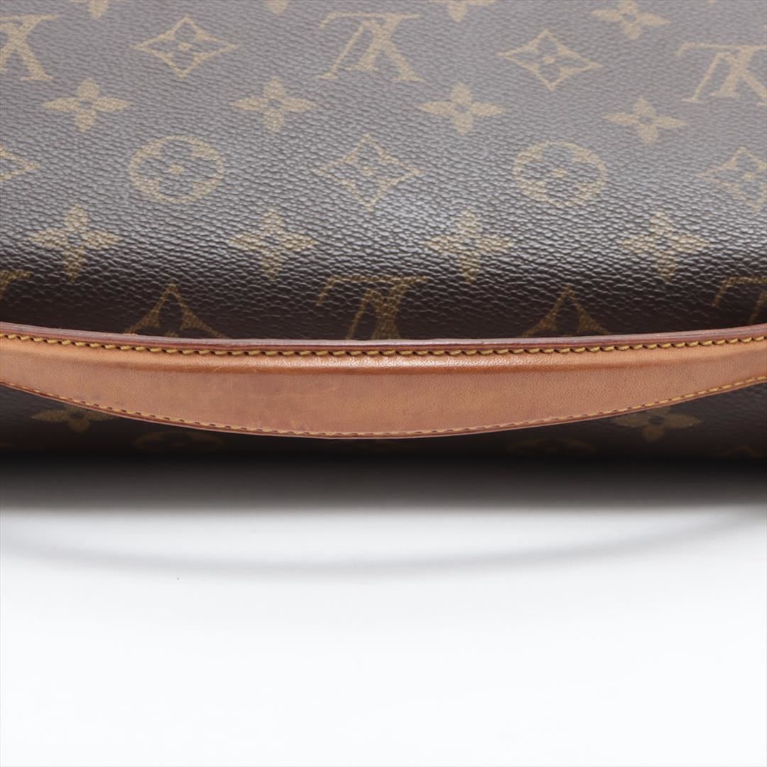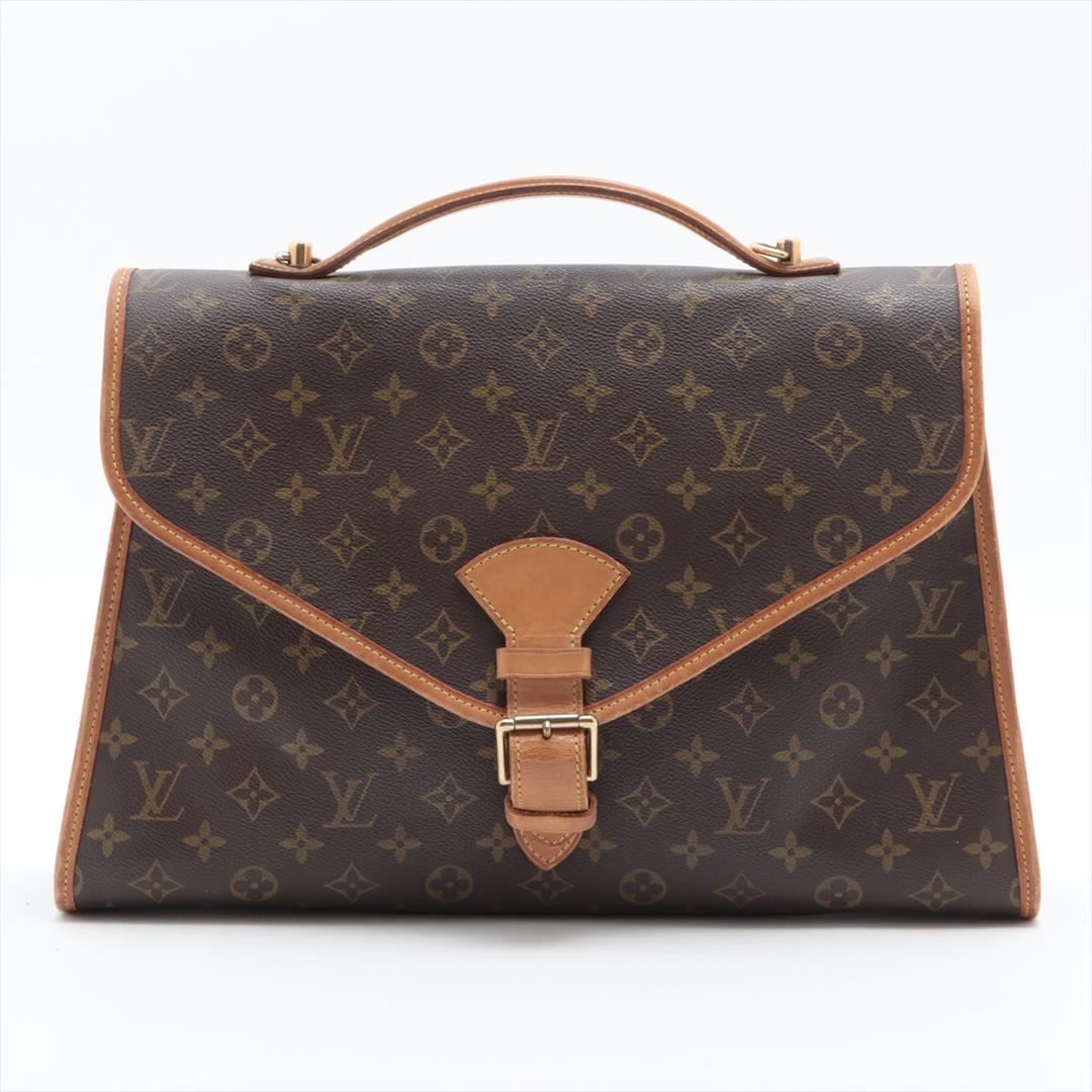Brown monogram coated canvas Louis Vuitton Beverly GM briefcase with gold-tone hardware, tan leather trim, single flat handle & single optional adjustable shoulder strap, brown canvas lining & single interior pocket and flap with buckle closures at front.