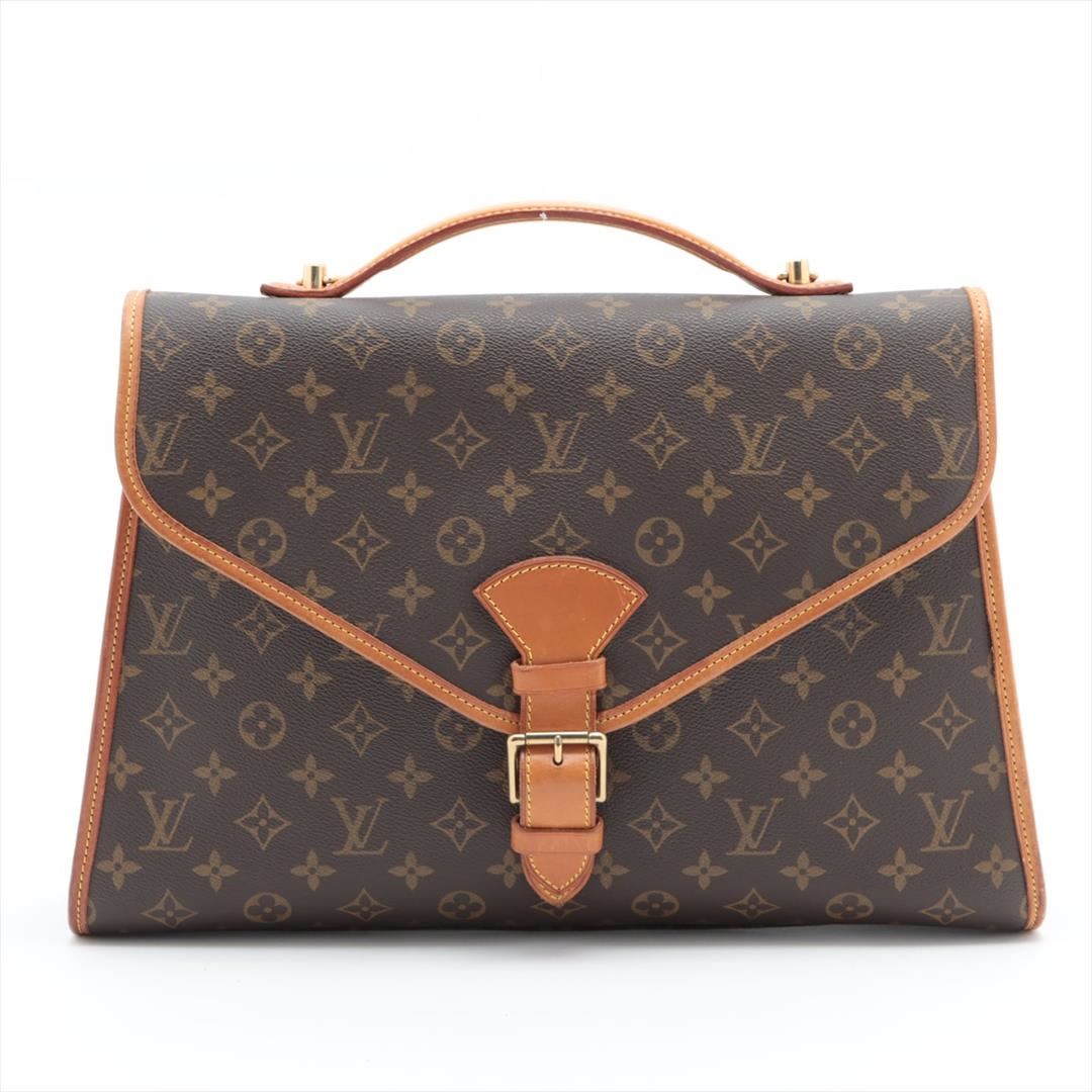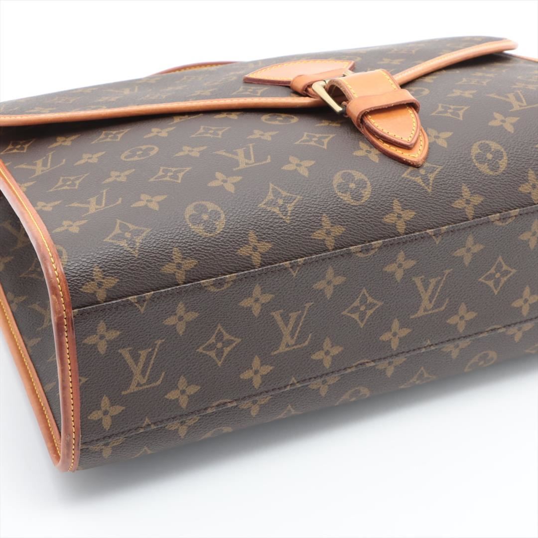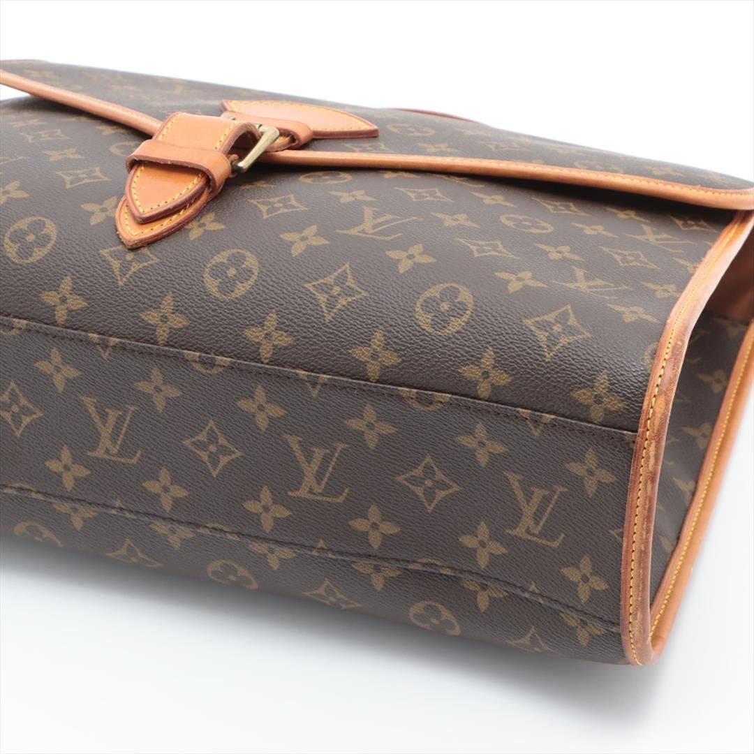 Brown monogram coated canvas Louis Vuitton Beverly GM briefcase with gold-tone hardware, tan leather trim, single flat handle & single optional adjustable shoulder strap, brown canvas lining & single interior pocket and flap with buckle closures at front.