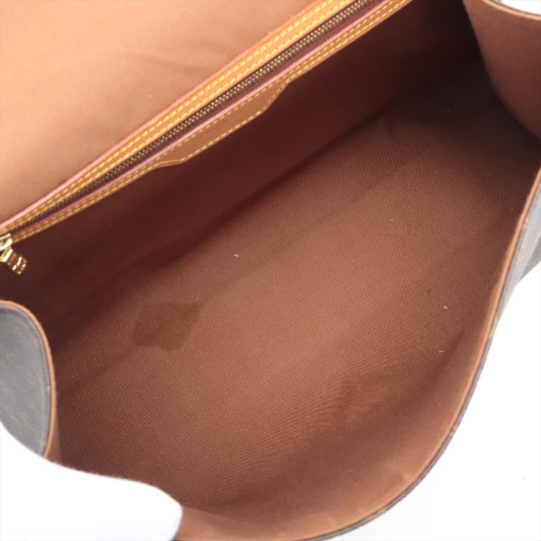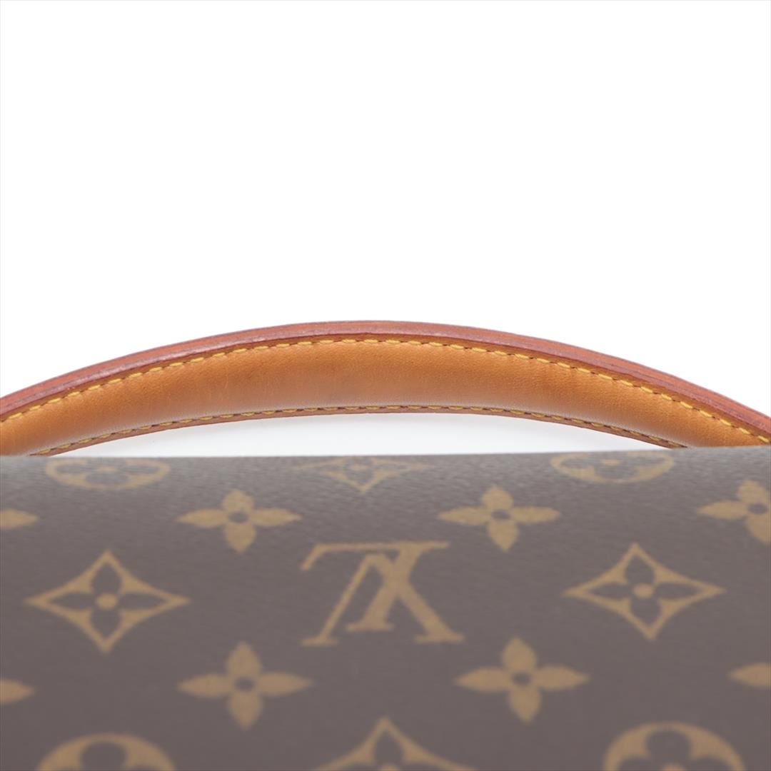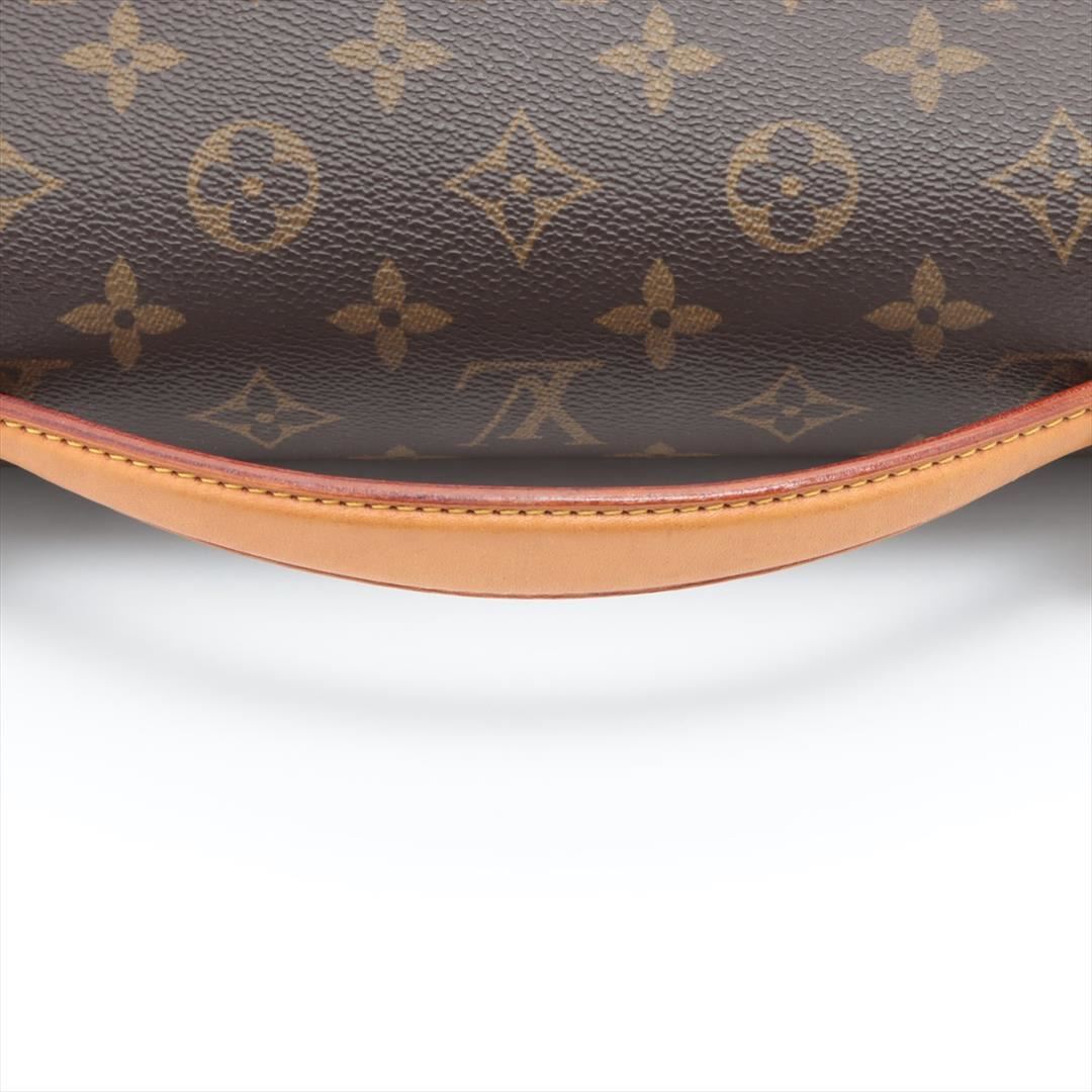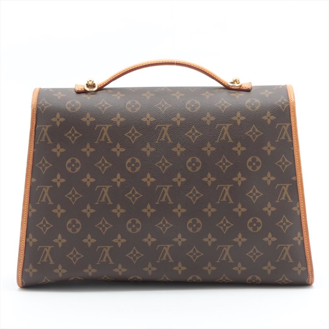 Brown monogram coated canvas Louis Vuitton Beverly GM briefcase with gold-tone hardware, tan leather trim, single flat handle & single optional adjustable shoulder strap, brown canvas lining & single interior pocket and flap with buckle closures at front.
