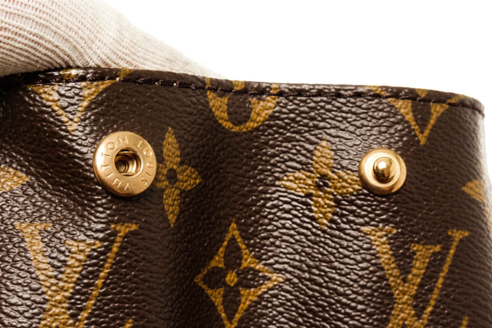 One Louis Vuitton Brown Monogram Canvas Leather Beverly GM Shoulder Bag. Item is sold AS-IS. All available information is listed in the description and shown in the photo. Brown and tan monogram coated canvas Louis Vuitton Beverly GM with gold-tone hardware, tan vachetta leather accents, dual flat shoulder straps, exterior pocket at back, beige Alcantara lining, dual pockets at interior walls; one with snap closure and push-lock closure at front flap.