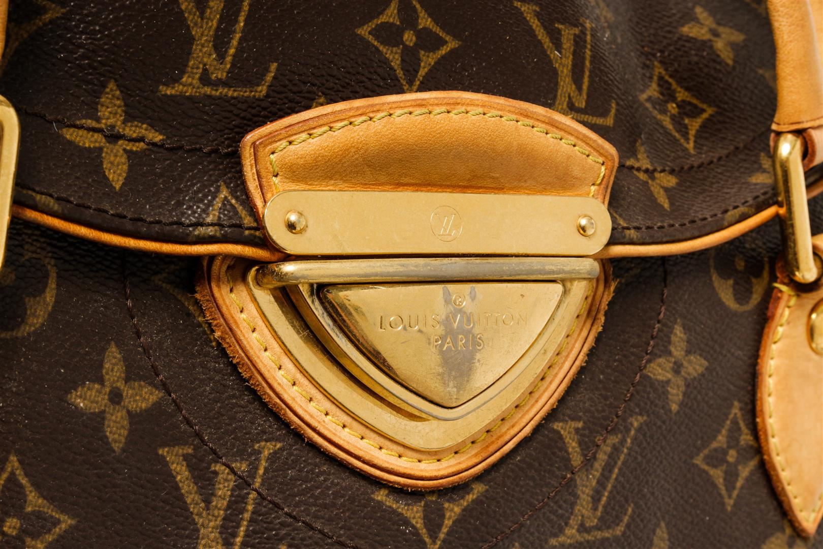 One Louis Vuitton Brown Monogram Canvas Leather Beverly GM Shoulder Bag. Item is sold AS-IS. All available information is listed in the description and shown in the photo. Brown and tan monogram coated canvas Louis Vuitton Beverly GM with gold-tone hardware, tan vachetta leather accents, dual flat shoulder straps, exterior pocket at back, beige Alcantara lining, dual pockets at interior walls; one with snap closure and push-lock closure at front flap.