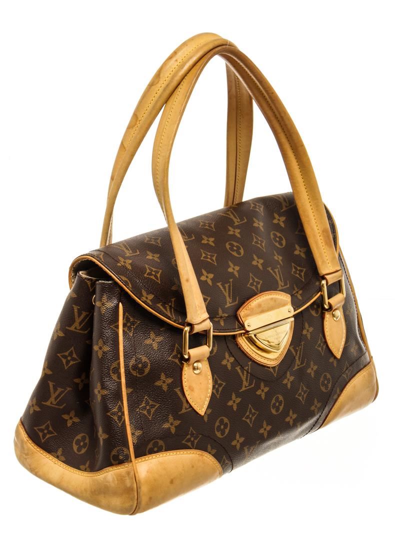 One Louis Vuitton Brown Monogram Canvas Leather Beverly GM Shoulder Bag. Item is sold AS-IS. All available information is listed in the description and shown in the photo. Brown and tan monogram coated canvas Louis Vuitton Beverly GM with gold-tone hardware, tan vachetta leather accents, dual flat shoulder straps, exterior pocket at back, beige Alcantara lining, dual pockets at interior walls; one with snap closure and push-lock closure at front flap.