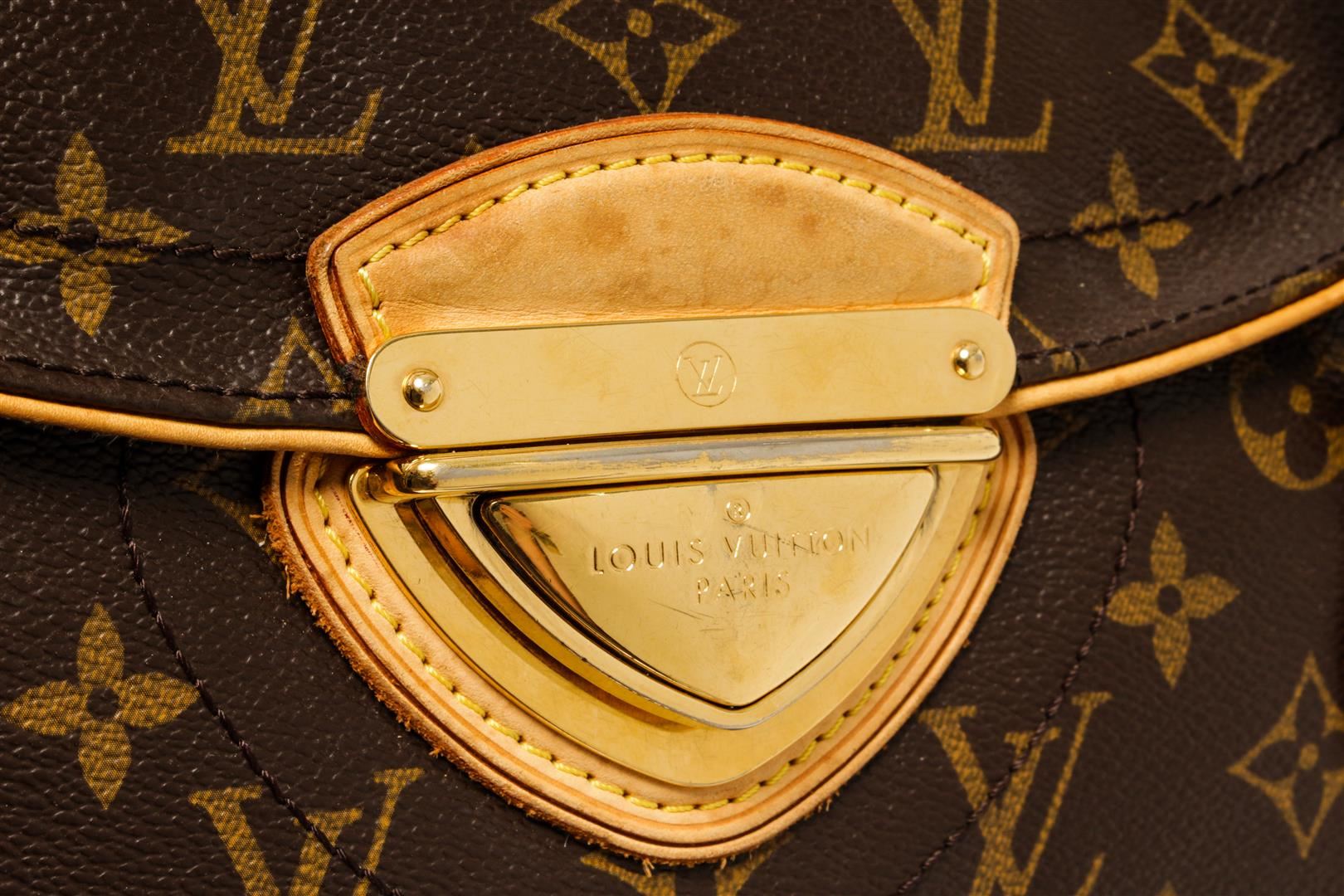 One Louis Vuitton Brown Monogram Canvas Leather Beverly GM Shoulder Bag. Item is sold AS-IS. All available information is listed in the description and shown in the photo. Brown and tan monogram coated canvas Louis Vuitton Beverly GM with gold-tone hardware, tan vachetta leather accents, dual flat shoulder straps, exterior pocket at back, beige Alcantara lining, dual pockets at interior walls; one with snap closure and push-lock closure at front flap.