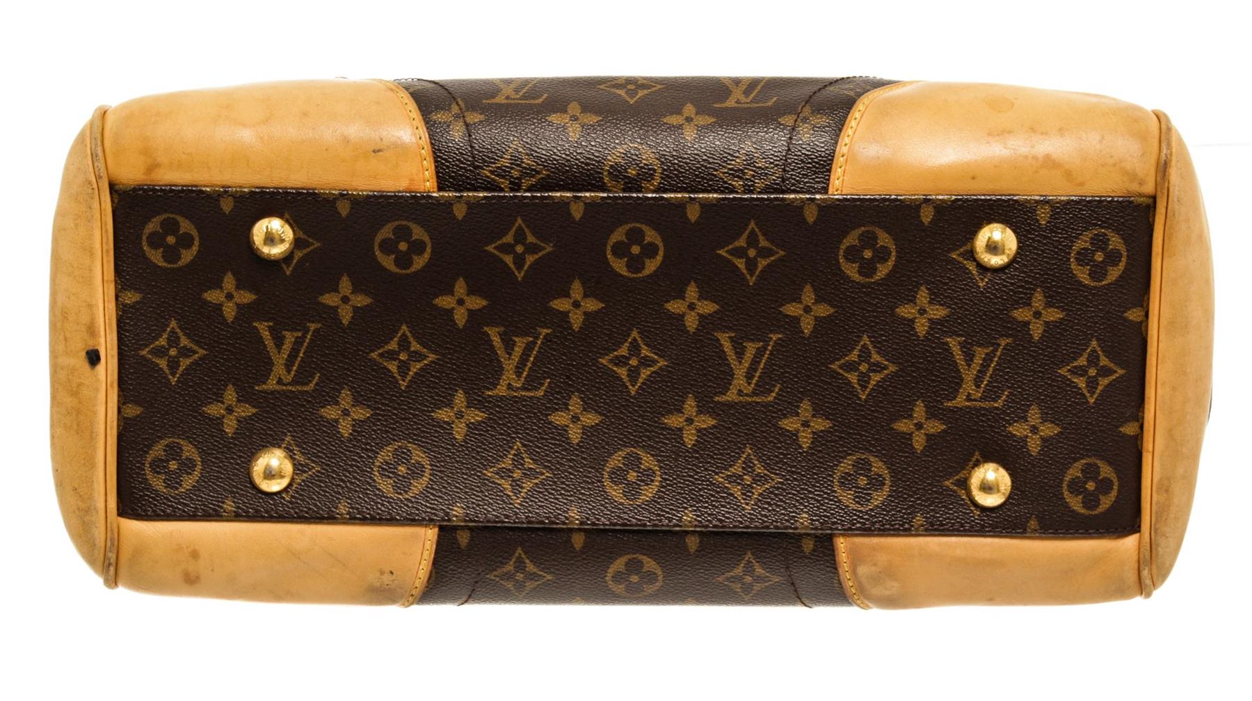 One Louis Vuitton Brown Monogram Canvas Leather Beverly GM Shoulder Bag. Item is sold AS-IS. All available information is listed in the description and shown in the photo. Brown and tan monogram coated canvas Louis Vuitton Beverly GM with gold-tone hardware, tan vachetta leather accents, dual flat shoulder straps, exterior pocket at back, beige Alcantara lining, dual pockets at interior walls; one with snap closure and push-lock closure at front flap.