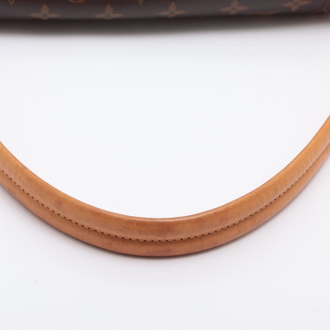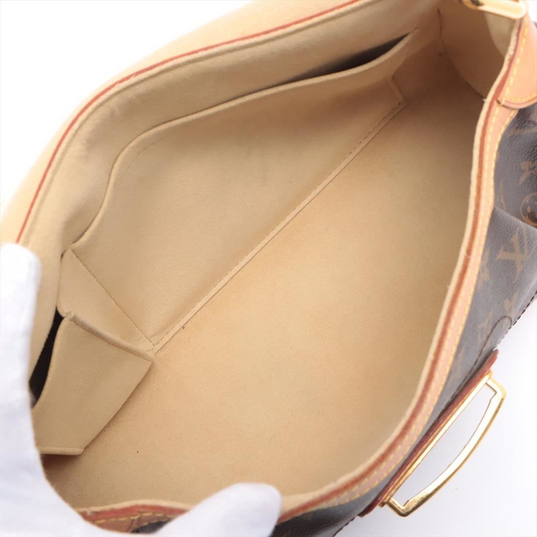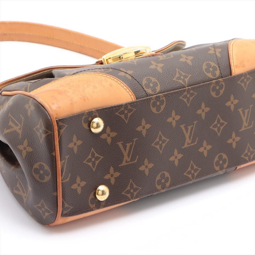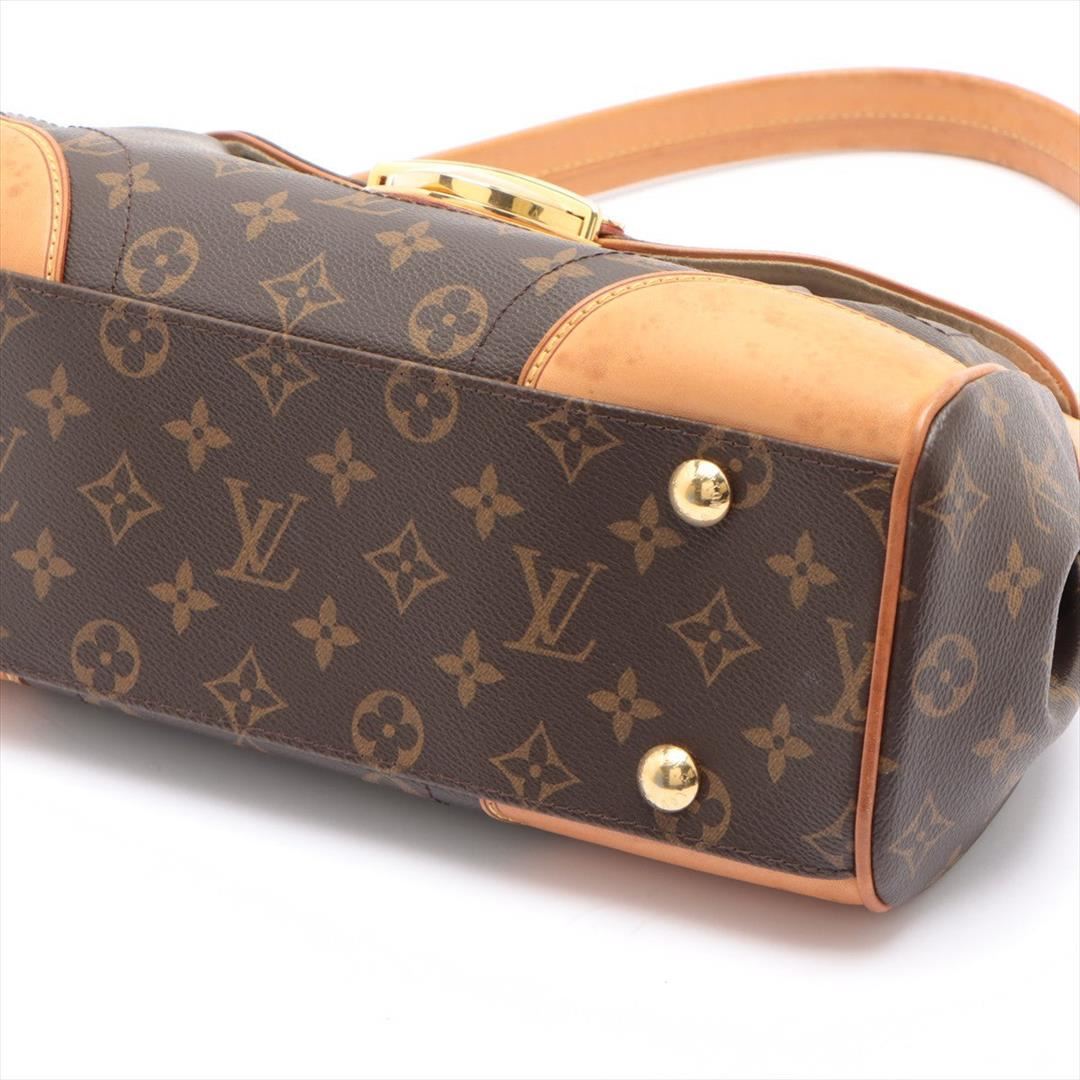 Brown and tan monogram coated canvas Louis Vuitton Beverly MM with gold-tone hardware, tan vachetta leather trim, single flat shoulder strap, single slit pocket at back, protective feet at base, creme Alcantara lining, dual slit pockets at interior wall and push-lock closure at front flap. 13"x5"x9" Shoulder Drop:7.5"/33.02cmx12.70cmx22.86cmx Shoulder Drop:19.05cm