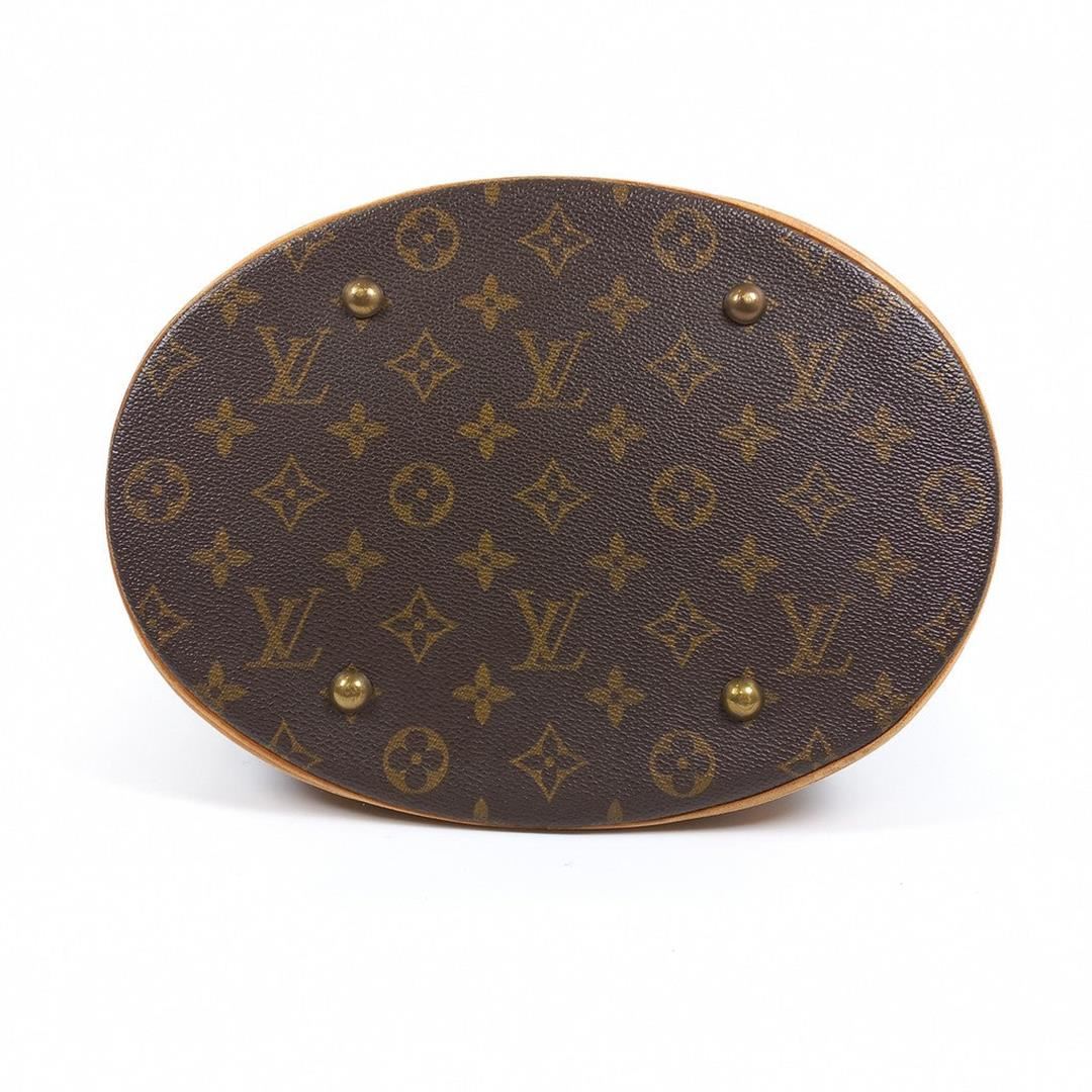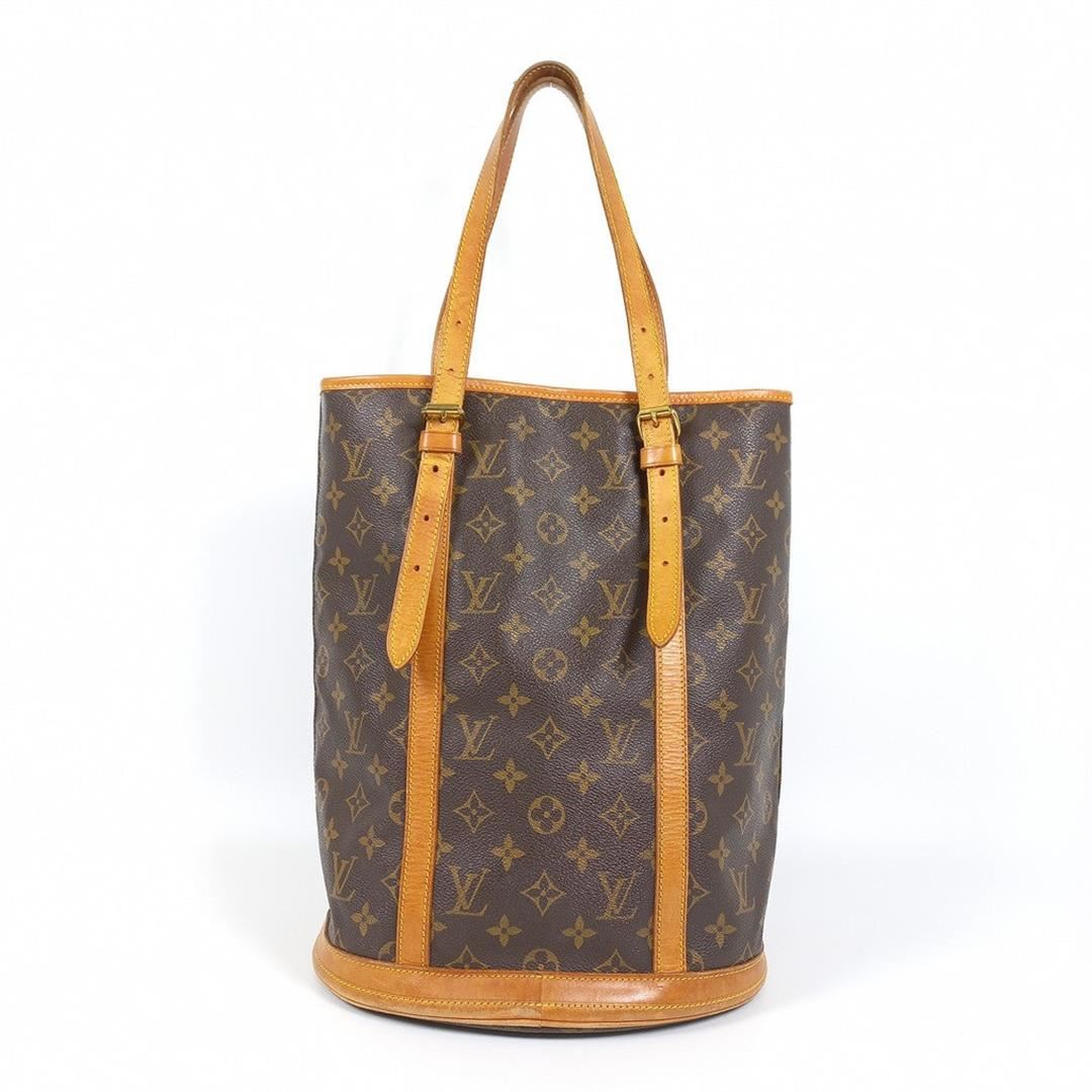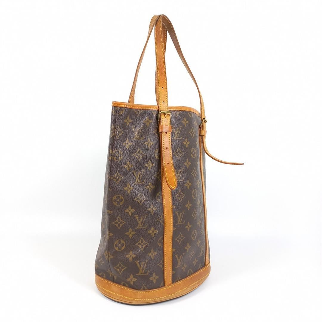 Brown and tan monogram Louis Vuitton Bucket GM with gold-tone hardware, tan vachetta leather accents, dual flat shoulder straps, beige Taiga leather interior and dual pockets; one with zip closure at interior walls. 3 10.75"x8"x13.5"xStrap Drop:9"