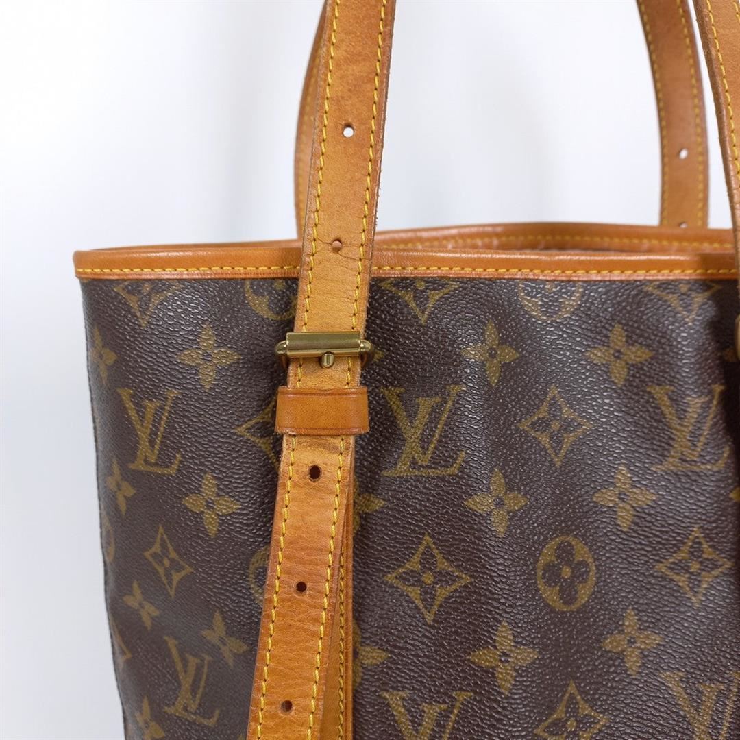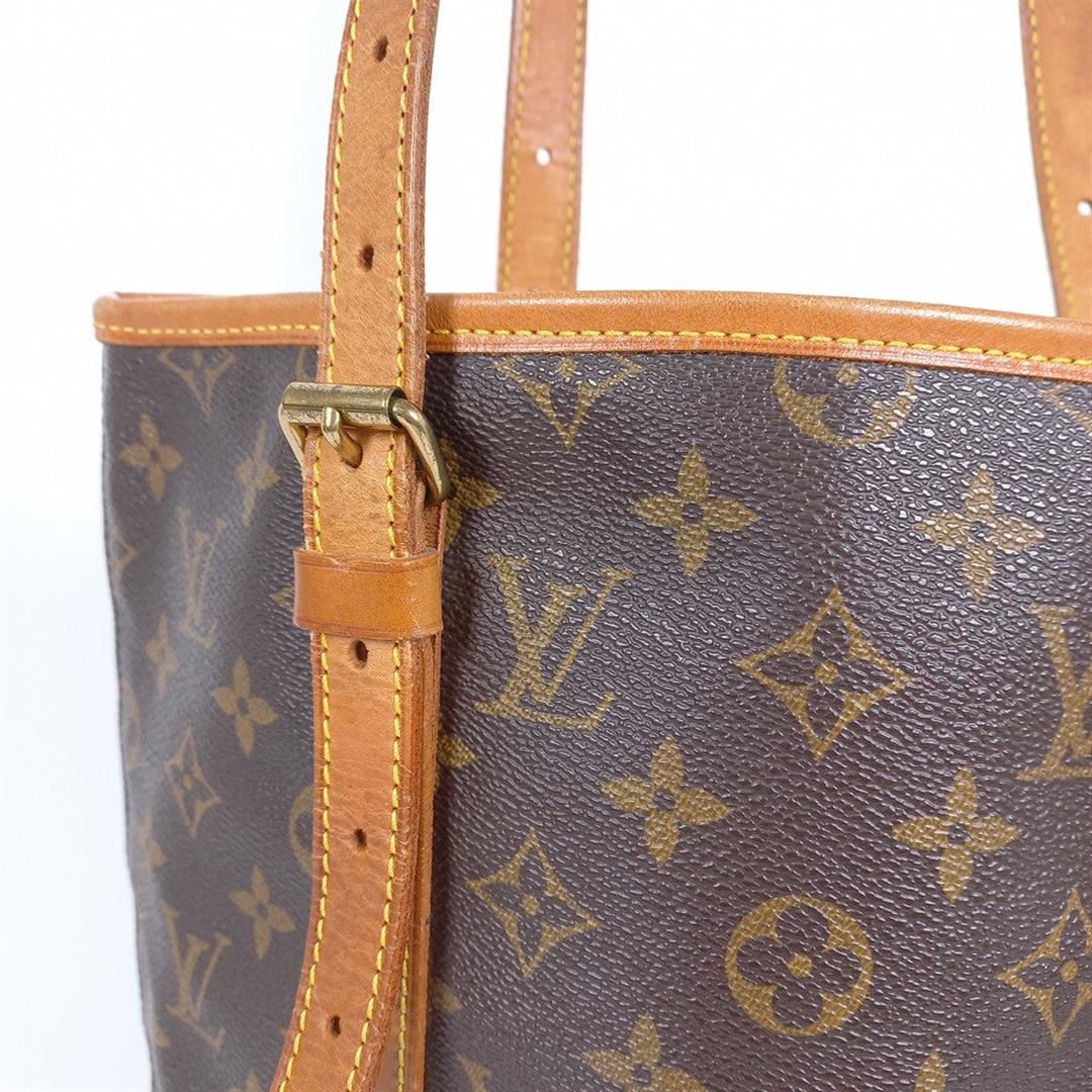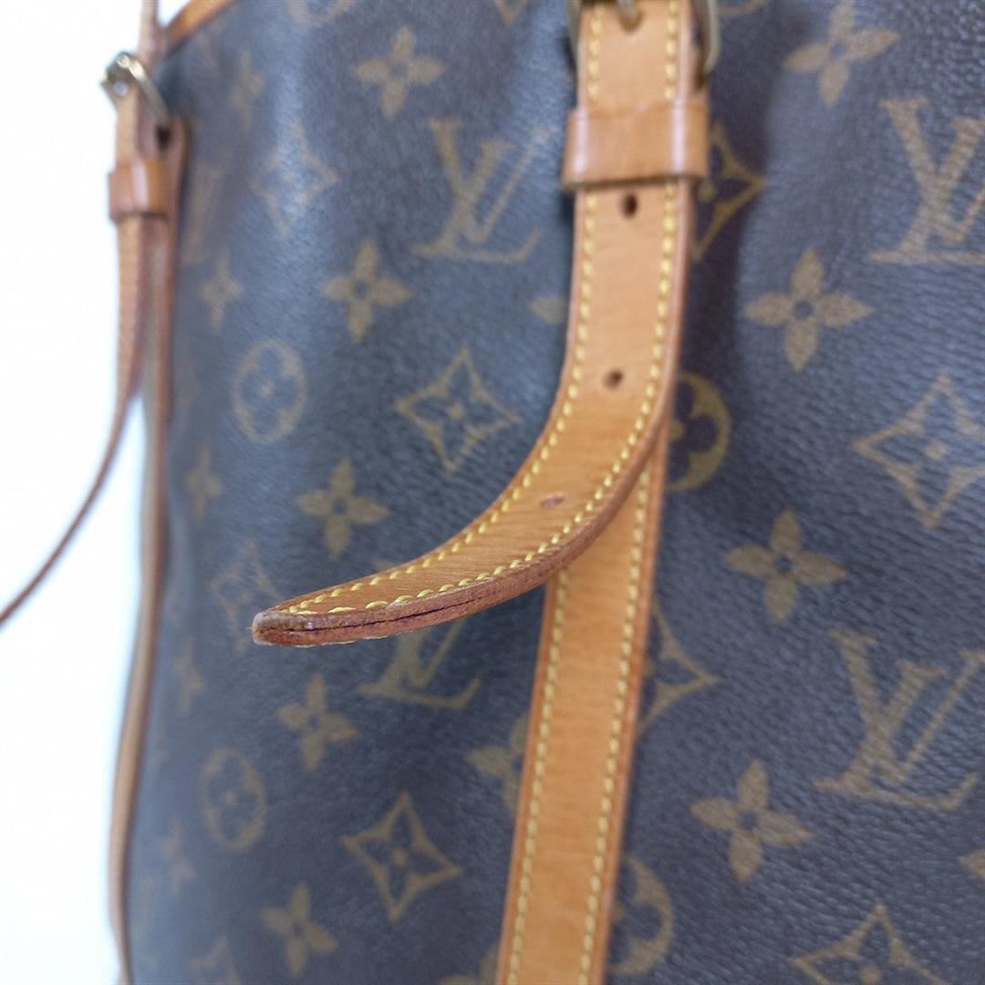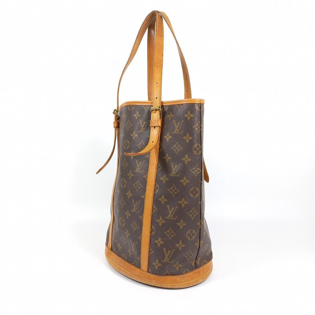 Brown and tan monogram Louis Vuitton Bucket GM with gold-tone hardware, tan vachetta leather accents, dual flat shoulder straps, beige Taiga leather interior and dual pockets; one with zip closure at interior walls. 3 10.75"x8"x13.5"xStrap Drop:9"