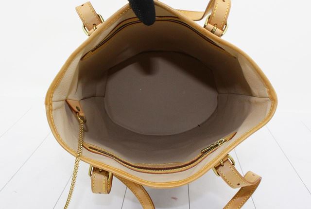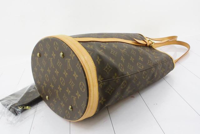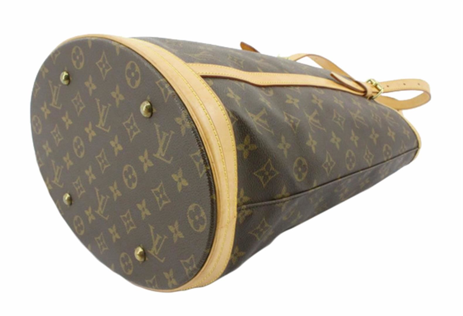 Brown and tan monogram Louis Vuitton Bucket GM with gold-tone hardware, tan vachetta leather accents, dual flat shoulder straps, beige coated canvas interior and dual pockets; one with zip closure at interior walls. 10.75"x8"x13.5"xStrap Drop:9"/27.3cm