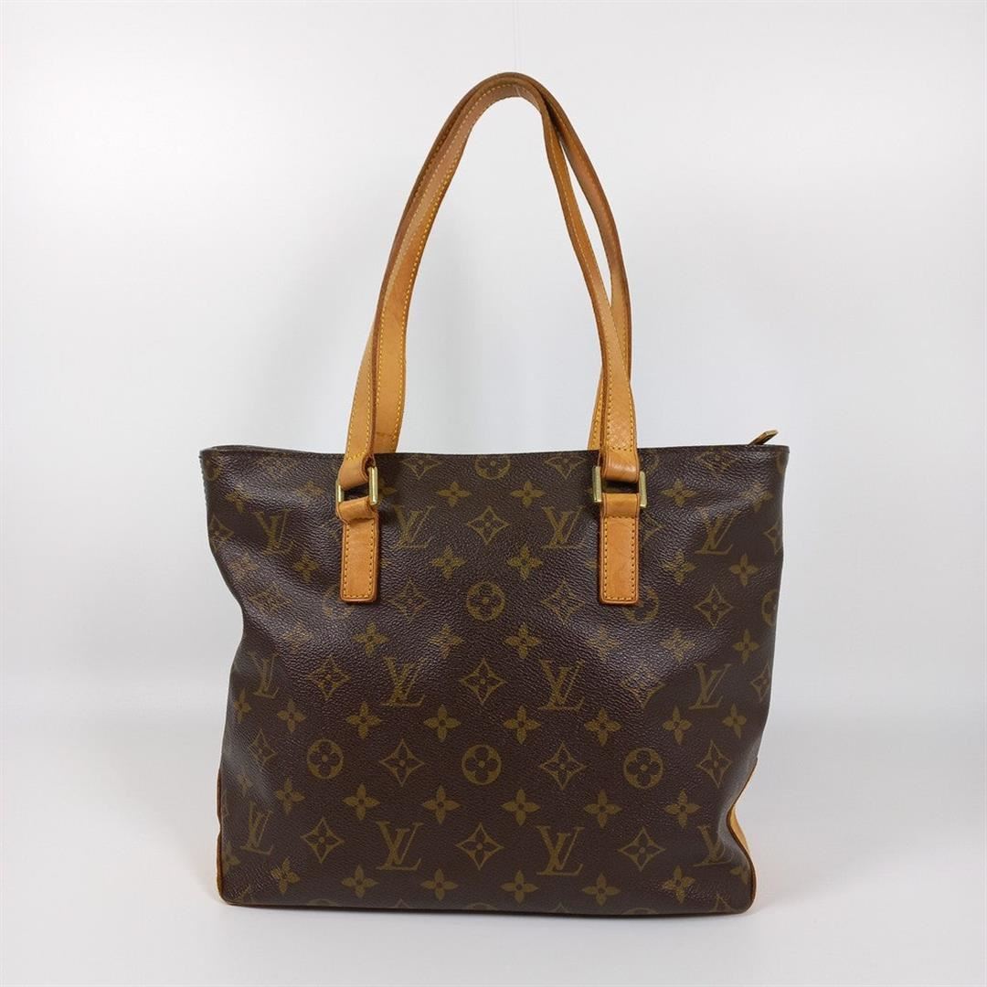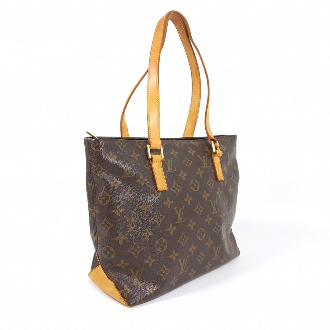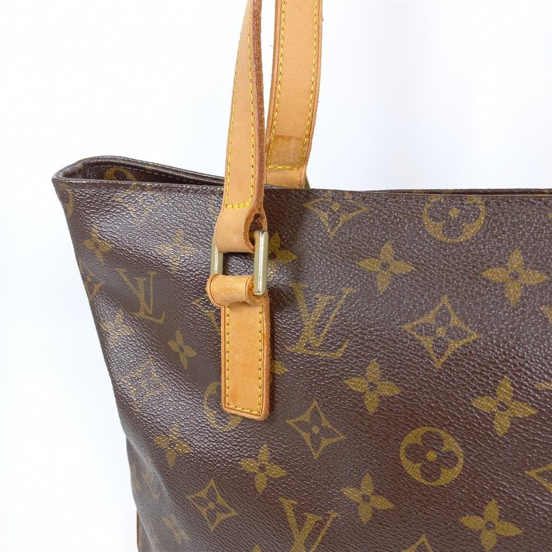Brown and tan monogram coated canvas Louis Vuitton Cabas Mezzo tote bag with gold-tone hardware, tan vachetta leather trim, dual flat shoulder straps, brown canvas lining, dual interior wall pockets; one with zip closure and zip closure at top. 3
