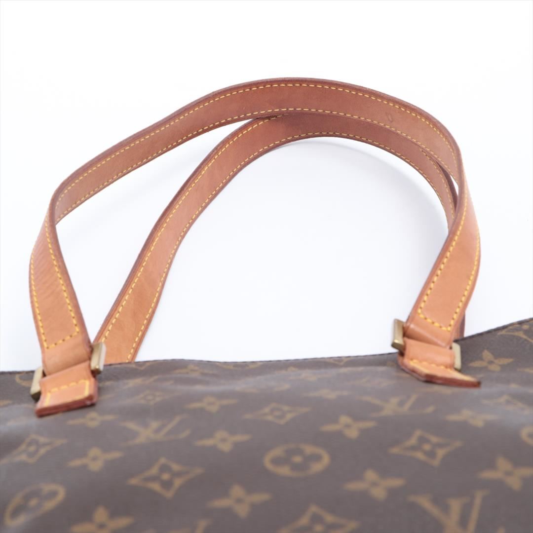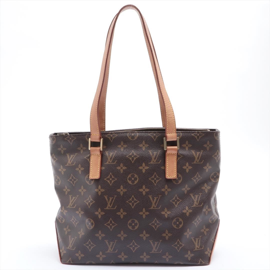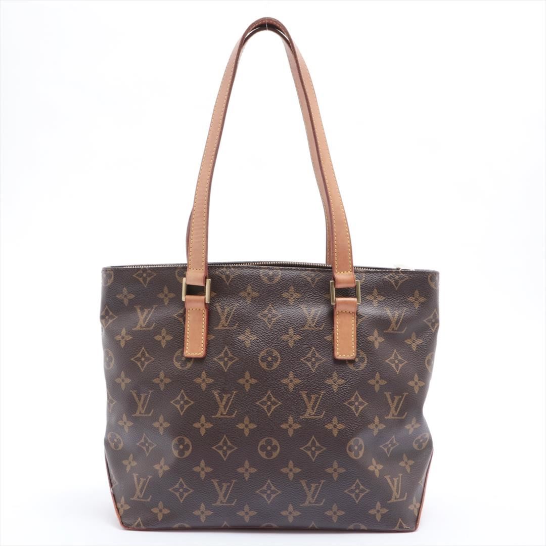 Brown and tan monogram coated canvas Louis Vuitton Cabas Piano tote with gold-tone hardware, tan vachetta leather trim, dual flat shoulder straps, brown canvas lining, dual pockets at interior wall; one with zip closure and zip closure at top. 13"x4.5"