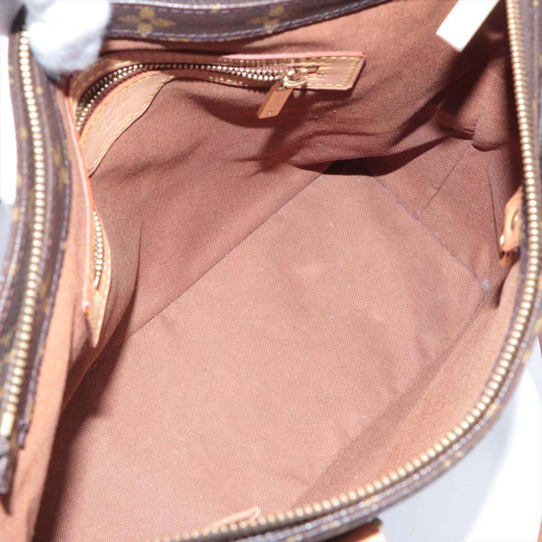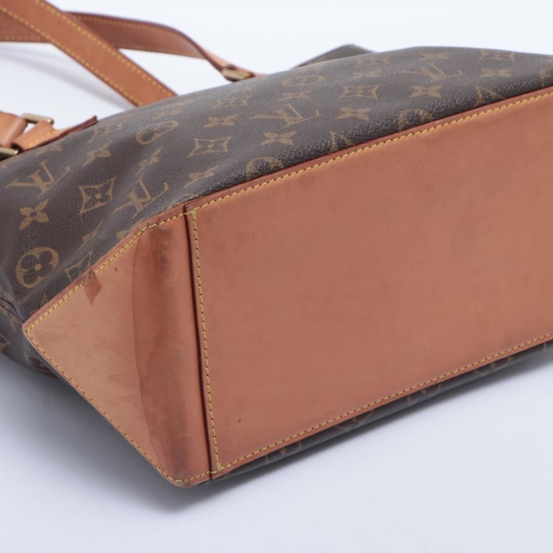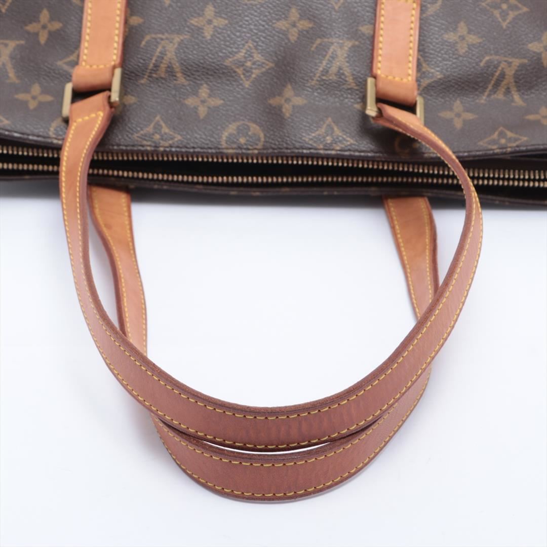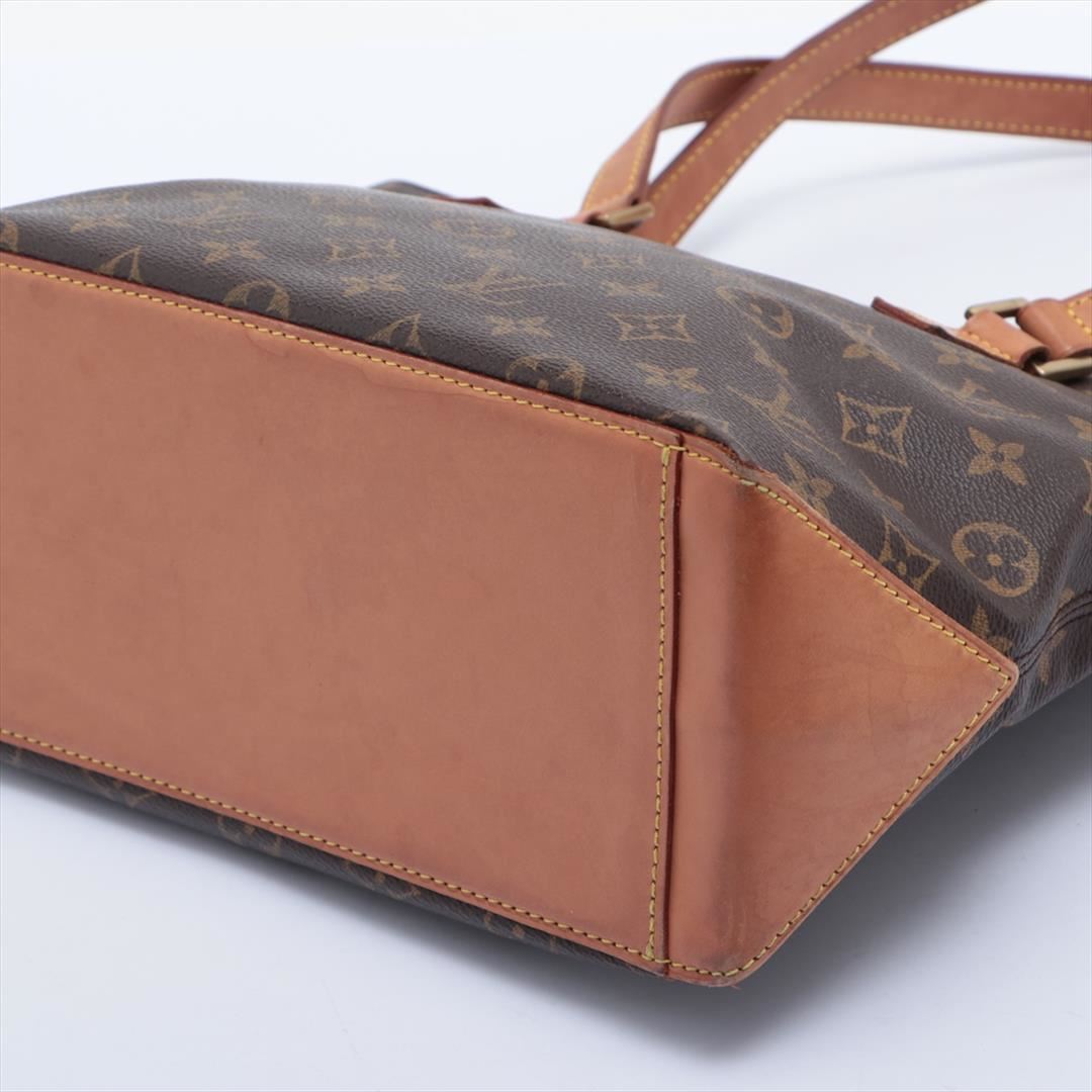 Brown and tan monogram coated canvas Louis Vuitton Cabas Piano tote with gold-tone hardware, tan vachetta leather trim, dual flat shoulder straps, brown canvas lining, dual pockets at interior wall; one with zip closure and zip closure at top. 13"x4.5"