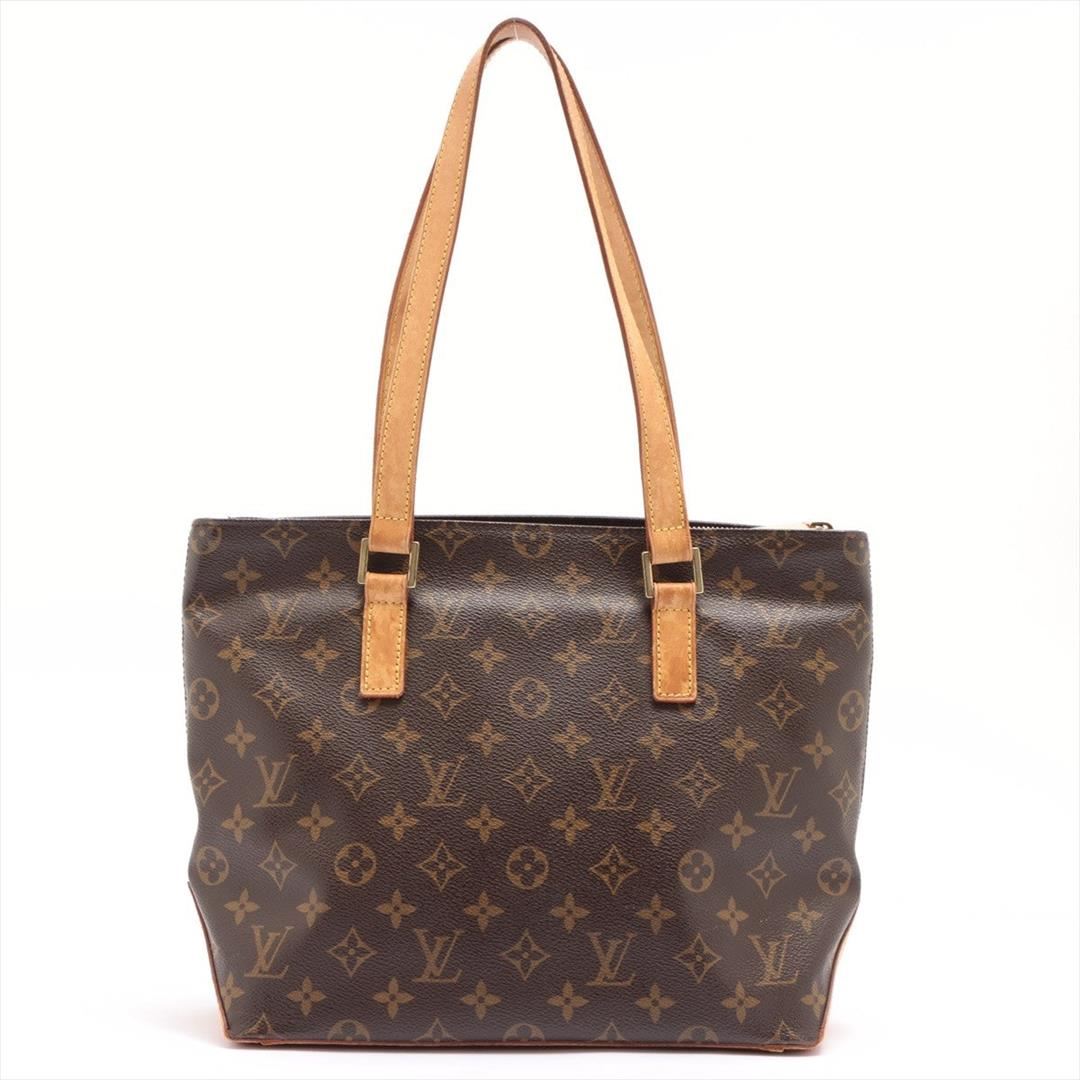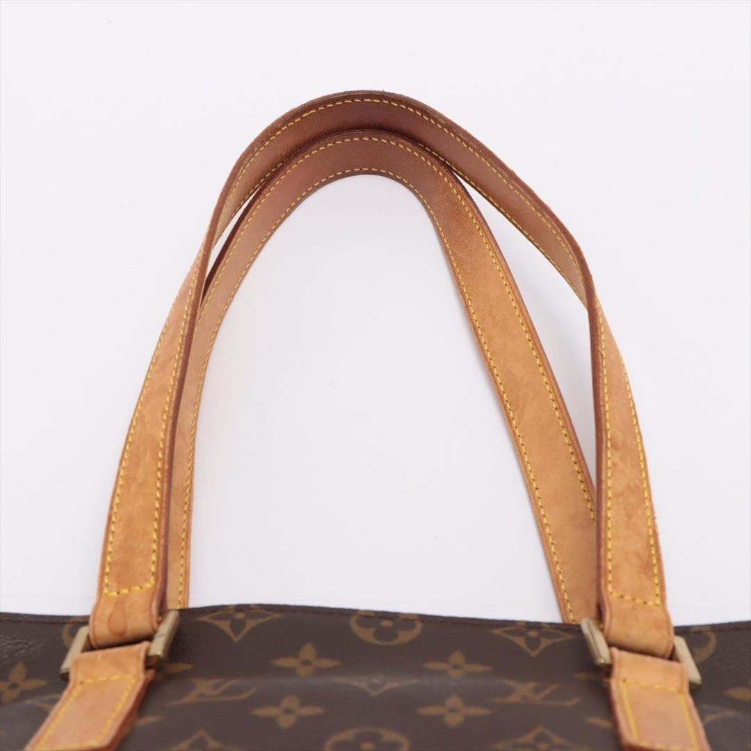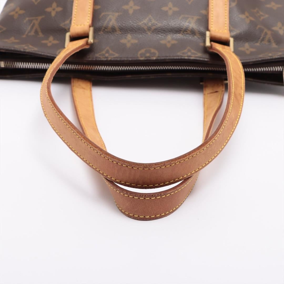 Brown and tan monogram coated canvas Louis Vuitton Cabas Piano tote with gold-tone hardware, tan vachetta leather trim, dual flat shoulder straps, brown canvas lining, dual pockets at interior wall; one with zip closure and zip closure at top. 13"x4.5"x9.5"xBag Drop:9"/33cmx11.4cmx24.1cmxBag Drop:22.8cm