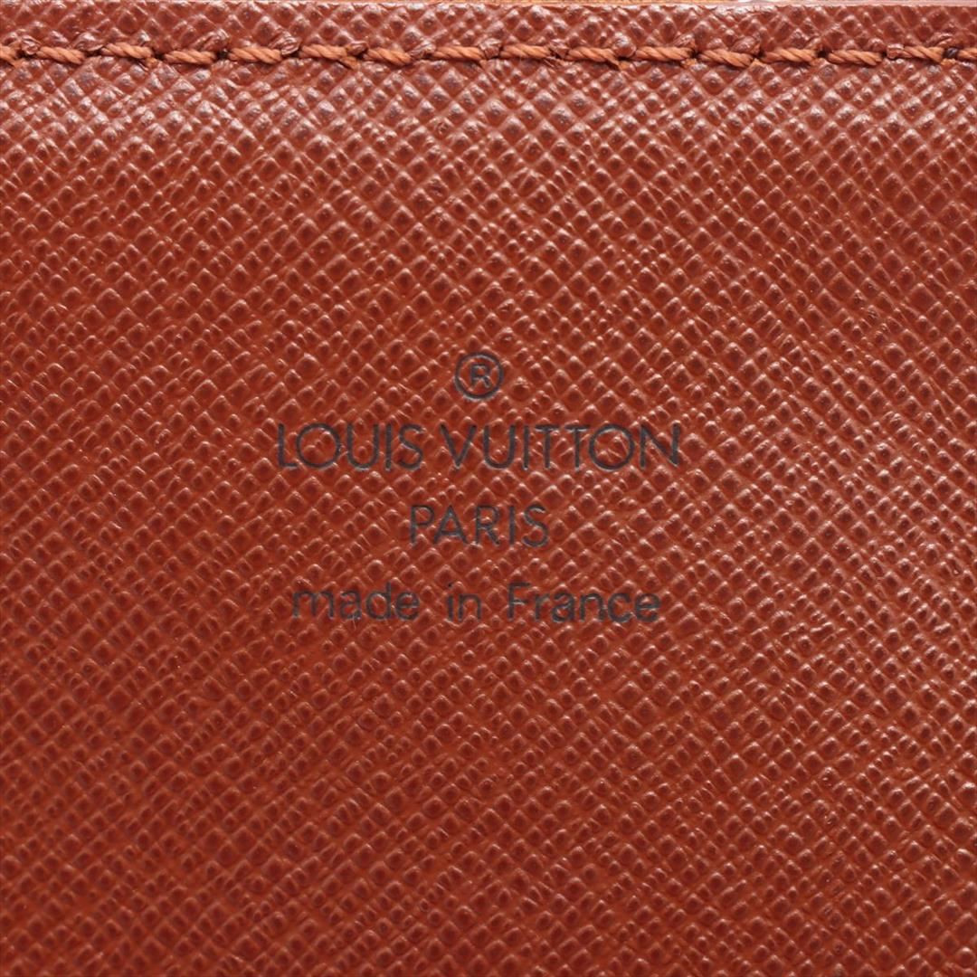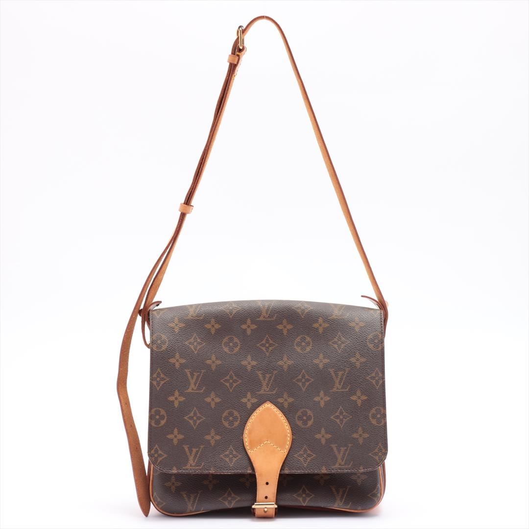 Brown and tan monogram coated canvas Louis Vuitton Cartouchiere GM with gold-tone hardware, tan vachetta leather trim, single adjustable shoulder strap, brown Taiga leather interior, dual interior compartments and flap with buckle closure at front. 10"