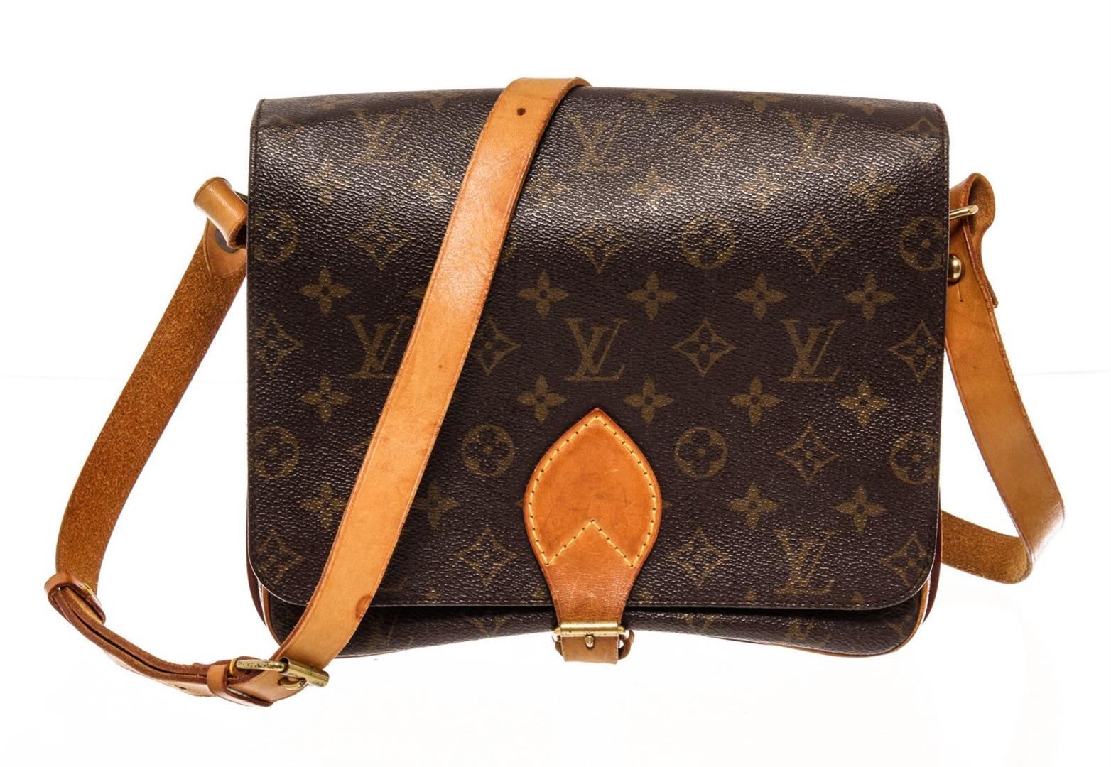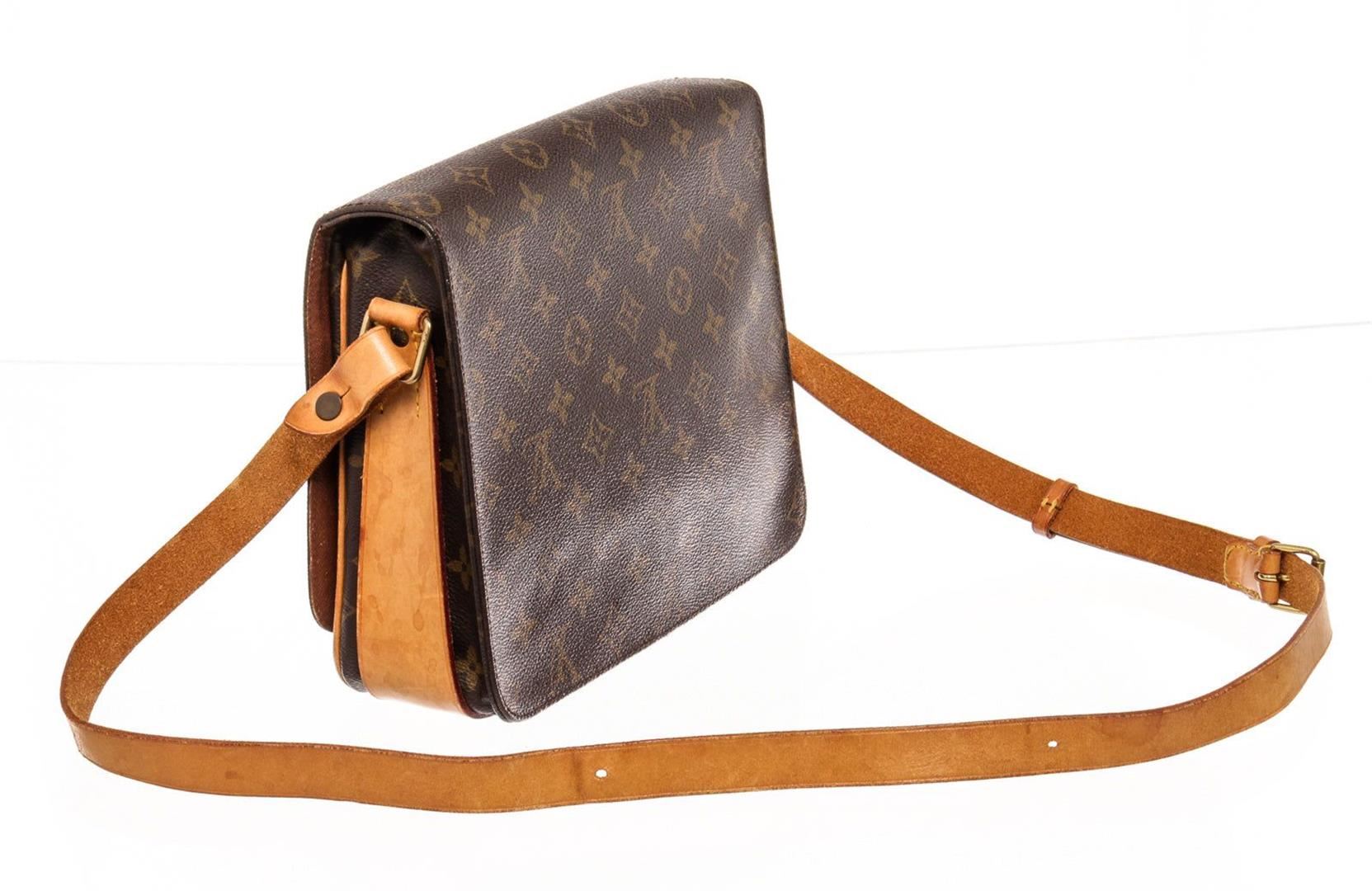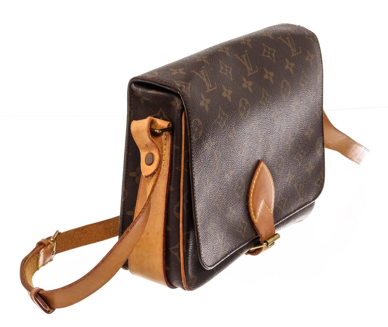 The Cartouchiere MM bag by Louis Vuitton is crafted from brown Monogram coated canvas and leather, it is detailed with gold-tone hardware and features an adjustable shoulder strap. The belted flap closure opens to reveal a leather-lined interior that will