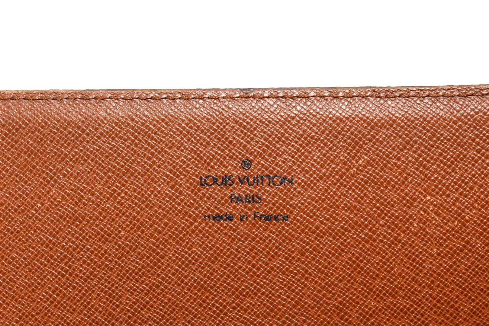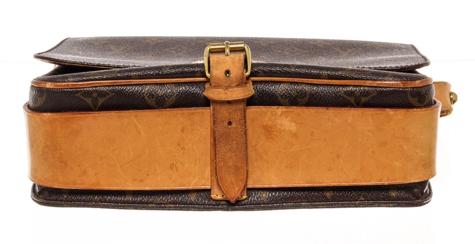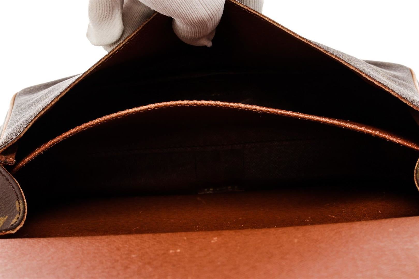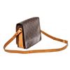 The Cartouchiere MM bag by Louis Vuitton is crafted from brown Monogram coated canvas and leather, it is detailed with gold-tone hardware and features an adjustable shoulder strap. The belted flap closure opens to reveal a leather-lined interior that will