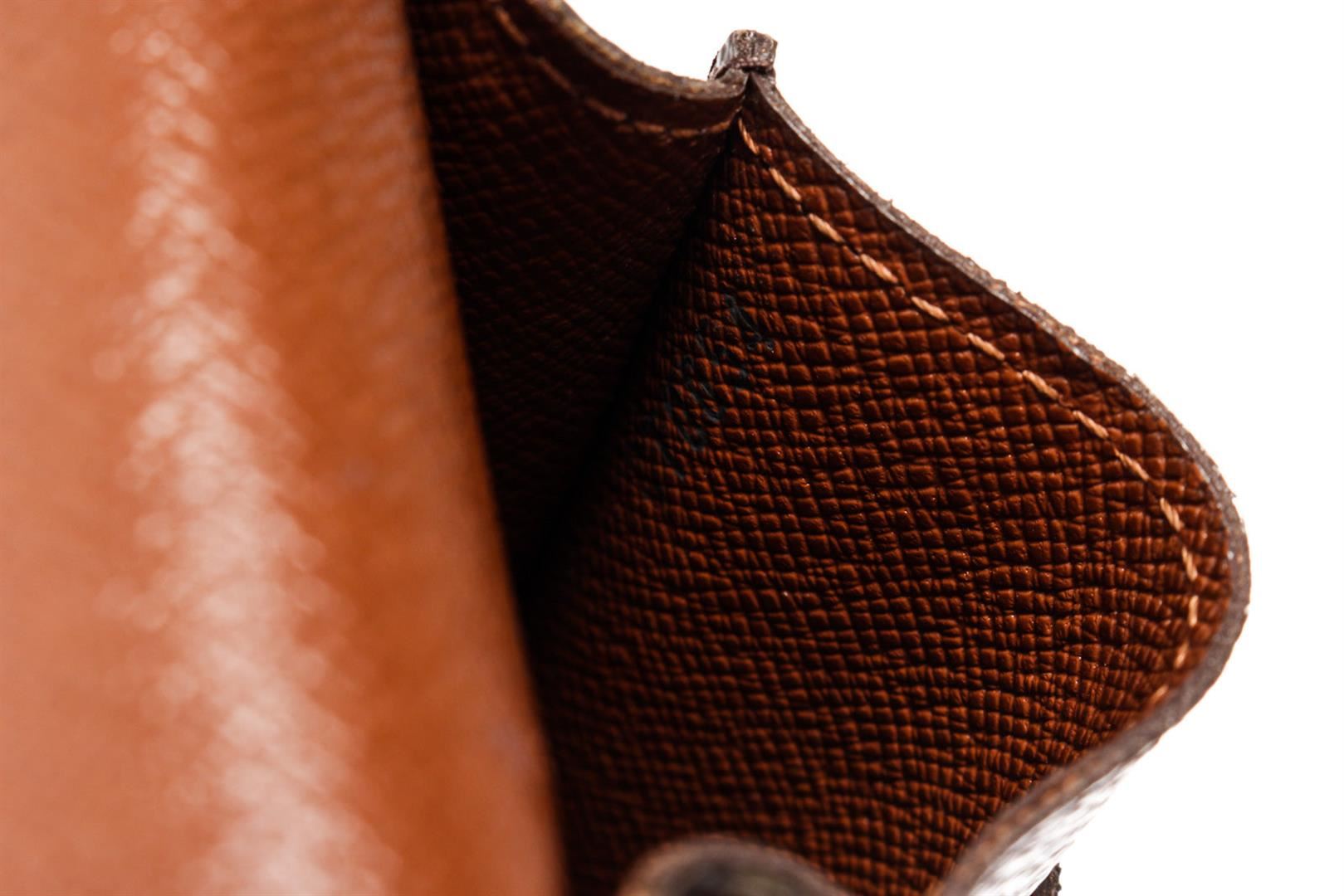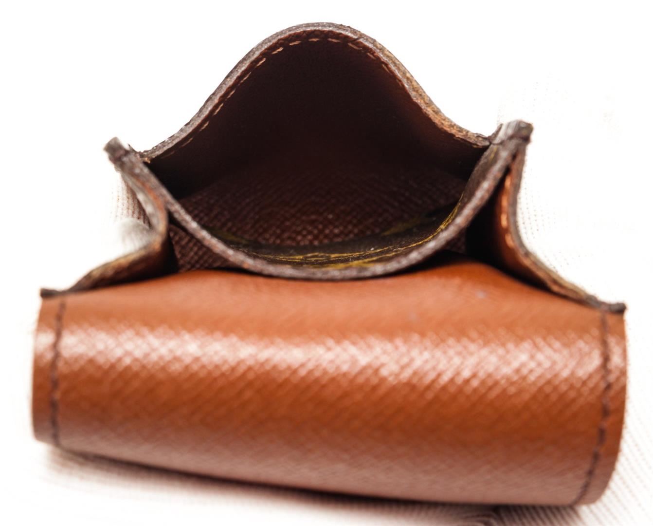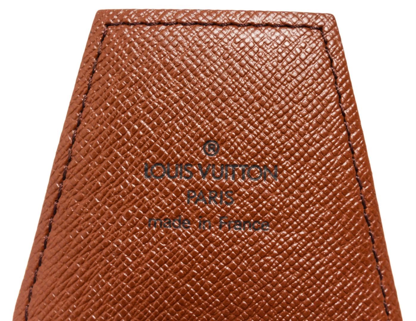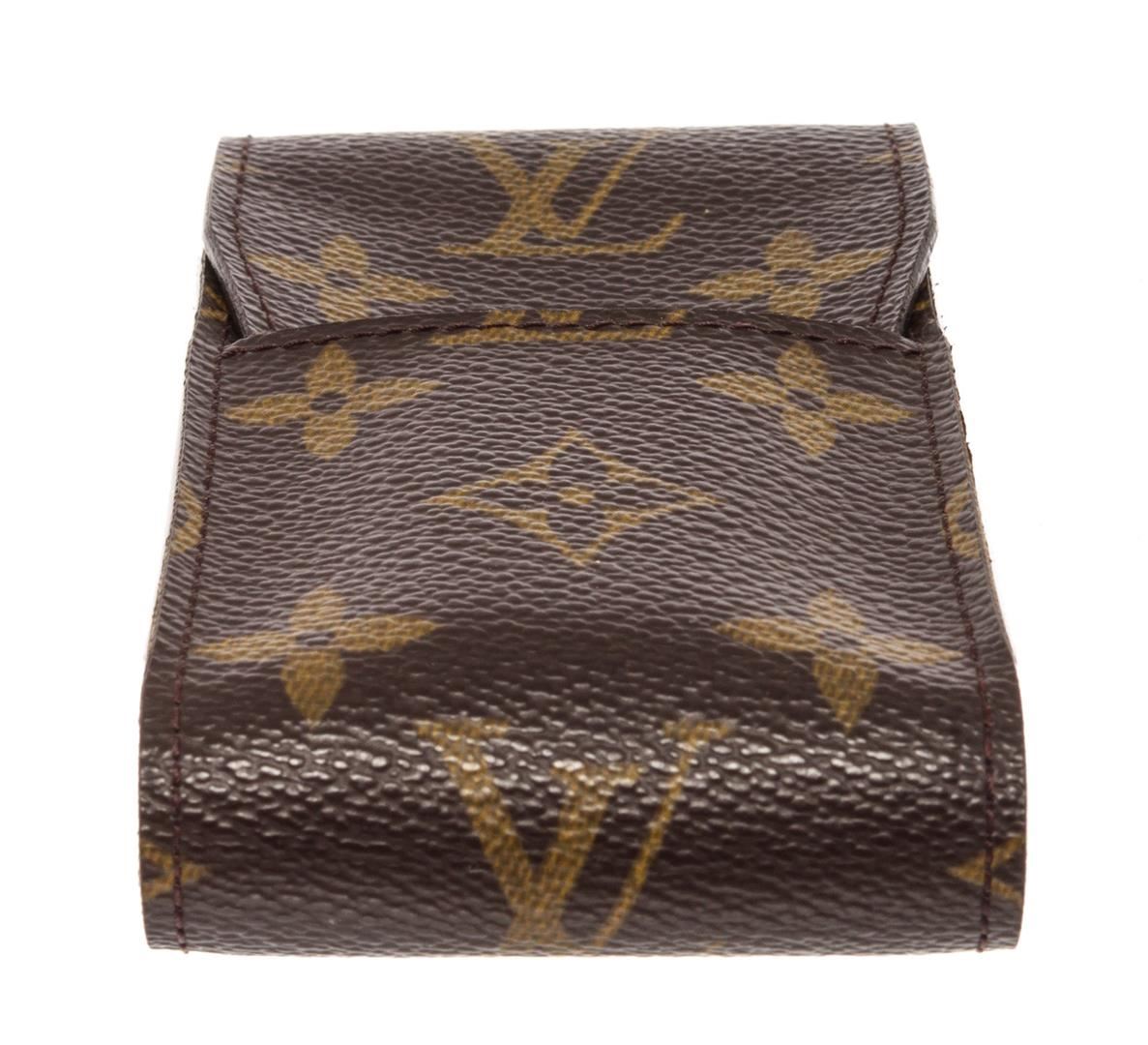 Brown and tan monogram coated canvas Louis Vuitton cigarette holder with leather lining and tab insert flap closure at front. 2.6"x4.7"x 1"/6.6cmx12cmx2.54cm
