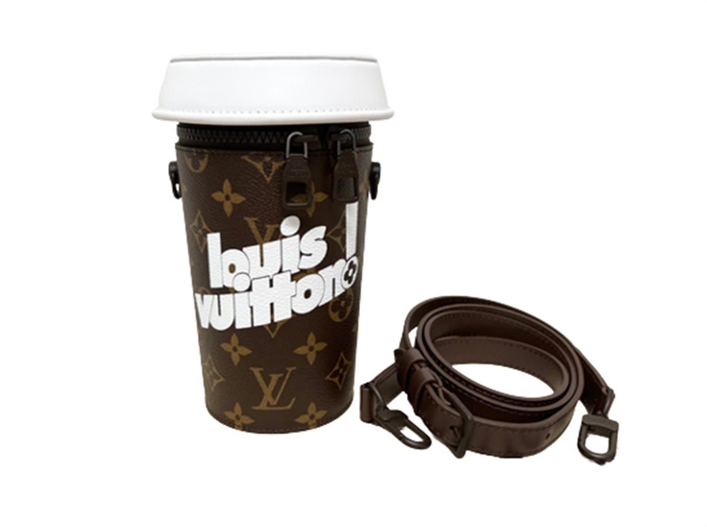Brown and tan monogram coated canvas Louis Vuitton Coffee Cup crossbody pouch bag with dark brown coated hardware, white cowhide-leather trim, black grosgrain lining, double-zip closure and a removable & adjustable shoulder strap. Strap Drop Max. : 21"