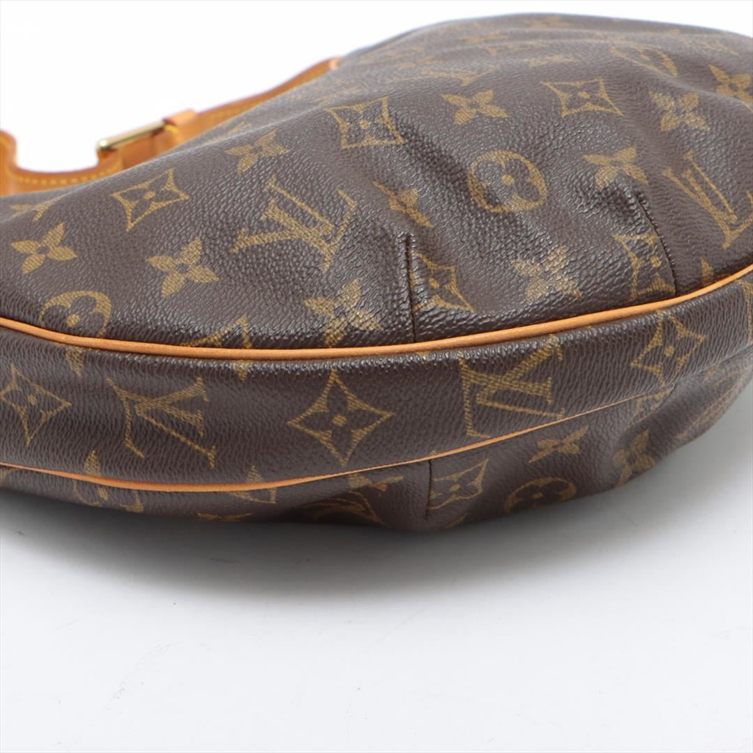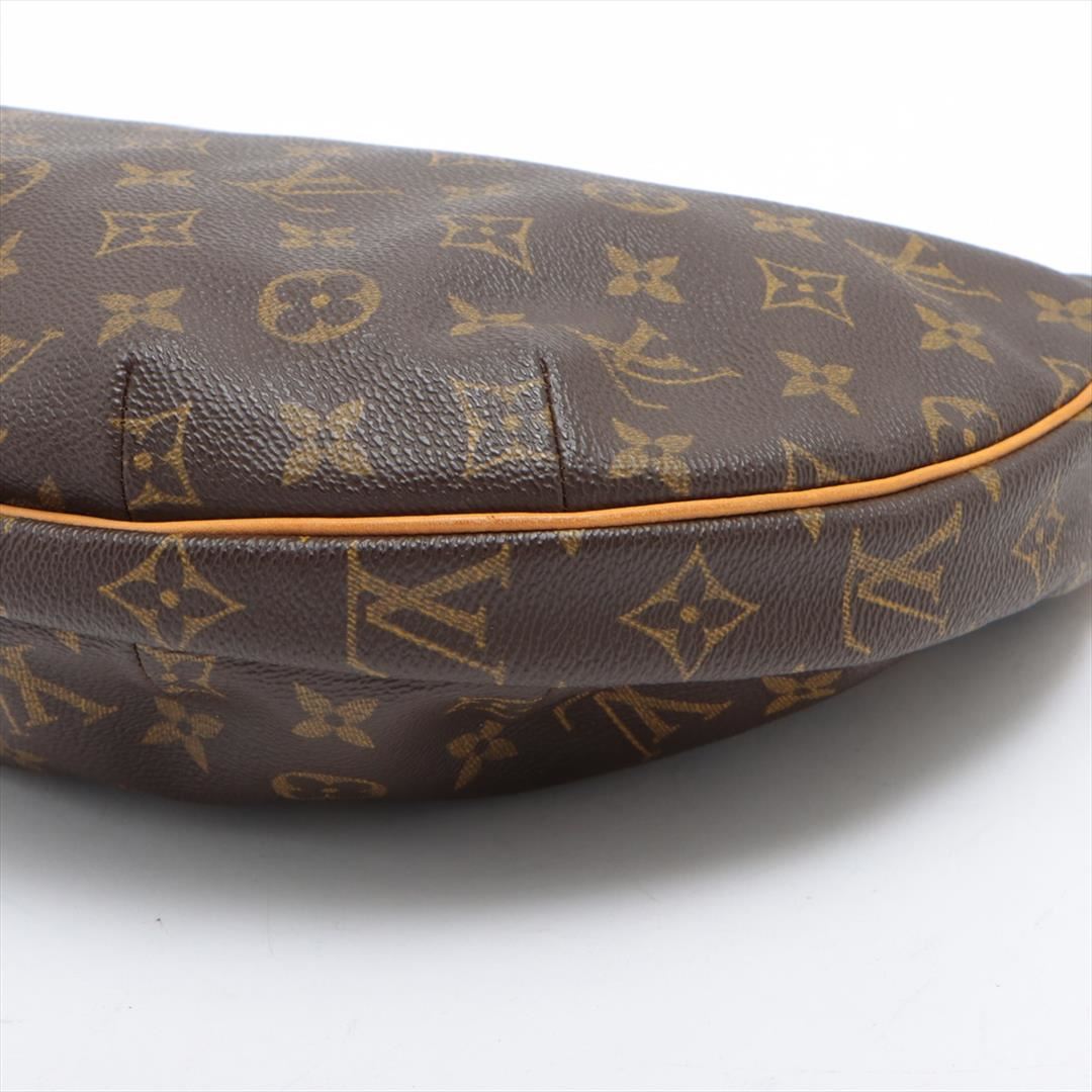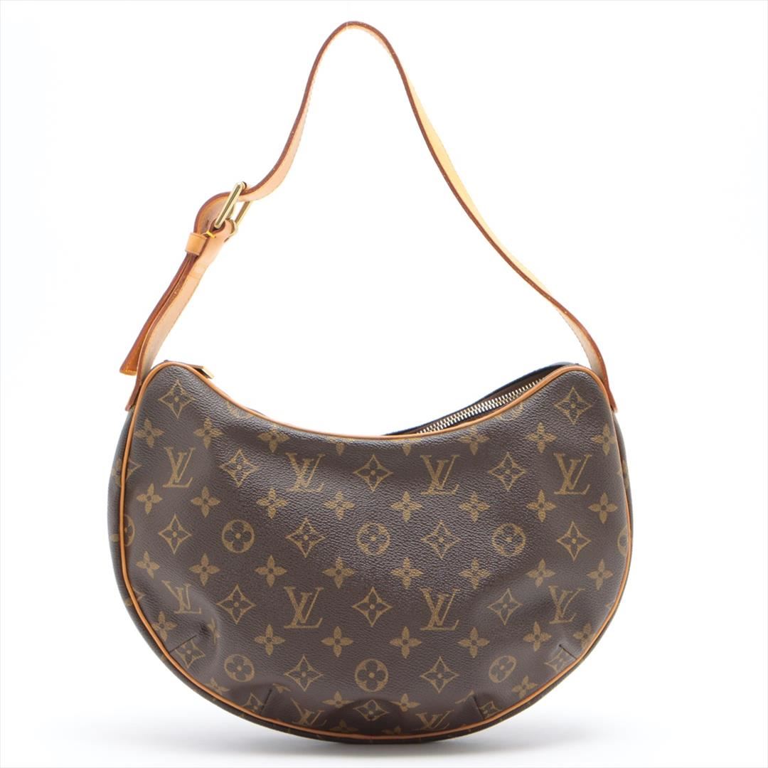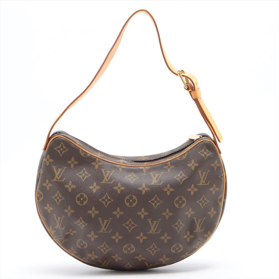 Brown and tan monogram coated canvas Louis Vuitton Croissant MM bag with gold-tone hardware, tan vachetta leather accents, flat shoulder strap, crimson Alcantara lining, dual pockets at interior walls and zip closure at top. Height: 7.5" Width: 11.5" D