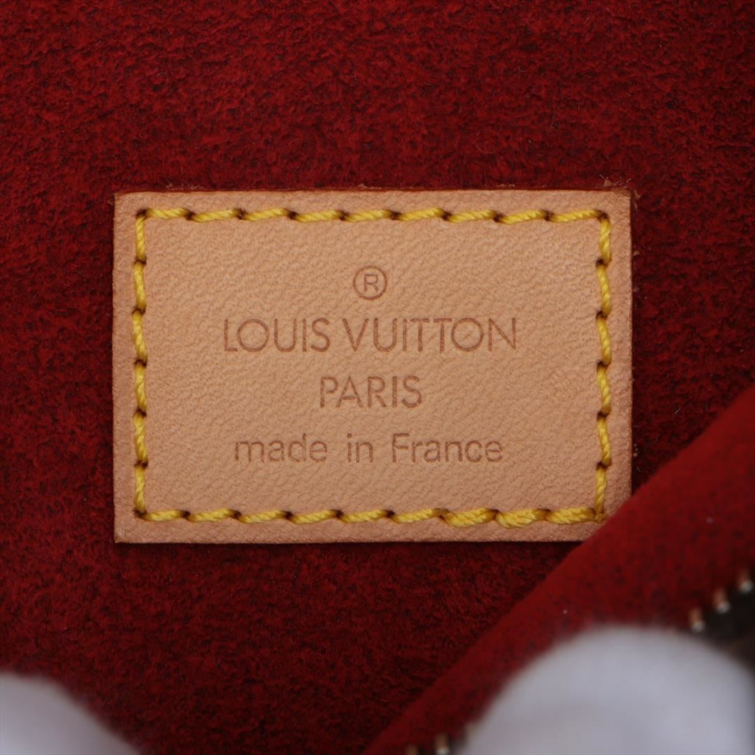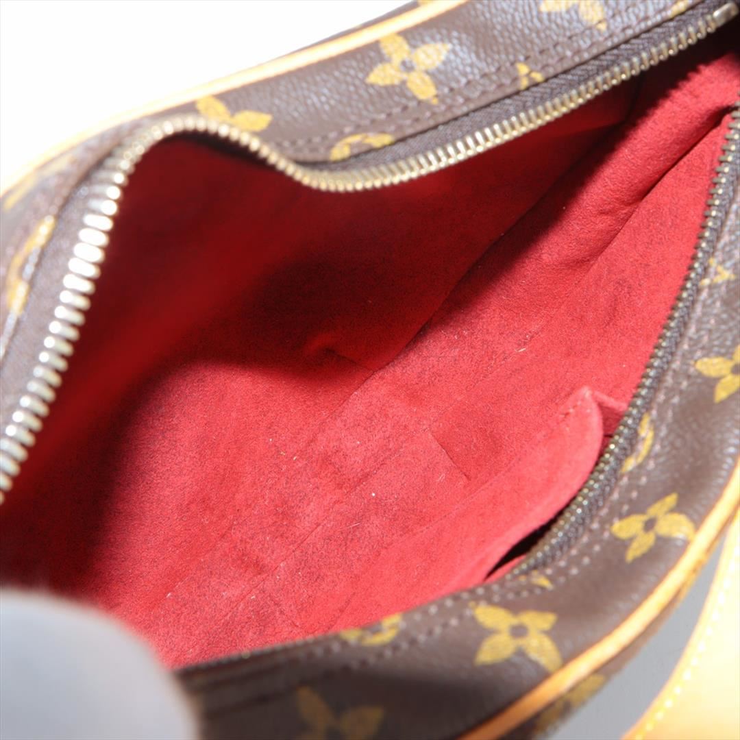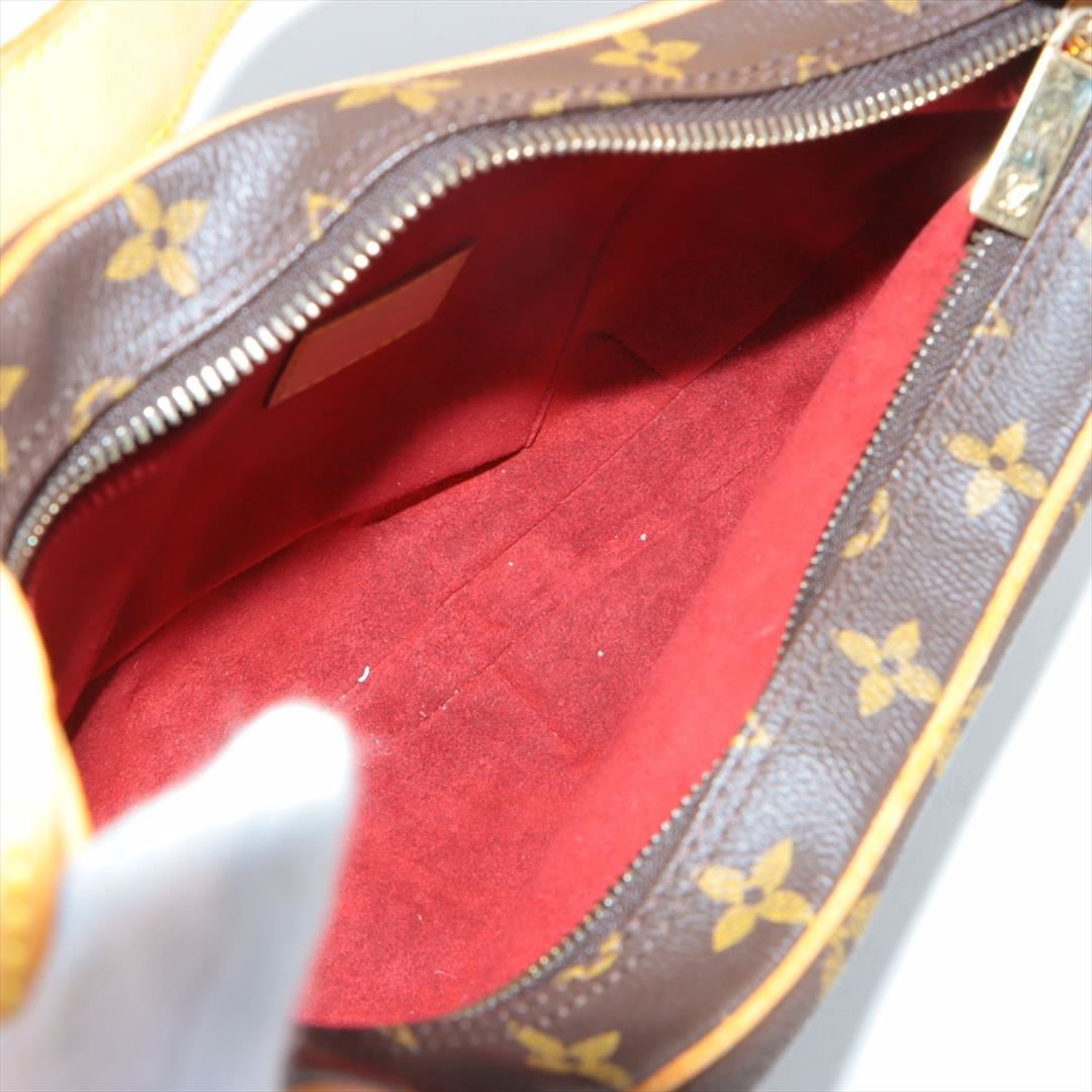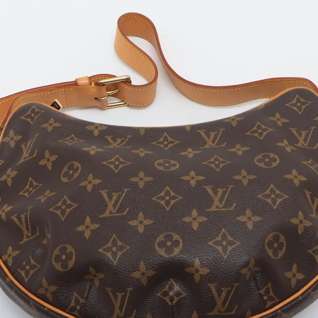 Brown and tan monogram coated canvas Louis Vuitton Croissant MM bag with gold-tone hardware, tan vachetta leather accents, flat shoulder strap, crimson Alcantara lining, dual pockets at interior walls and zip closure at top. Height: 7.5" Width: 11.5" D