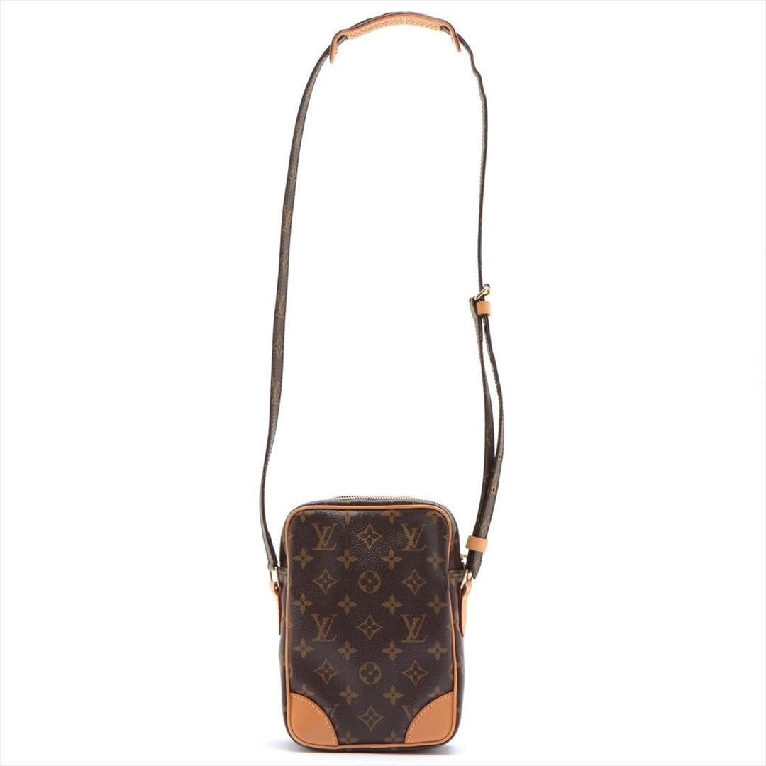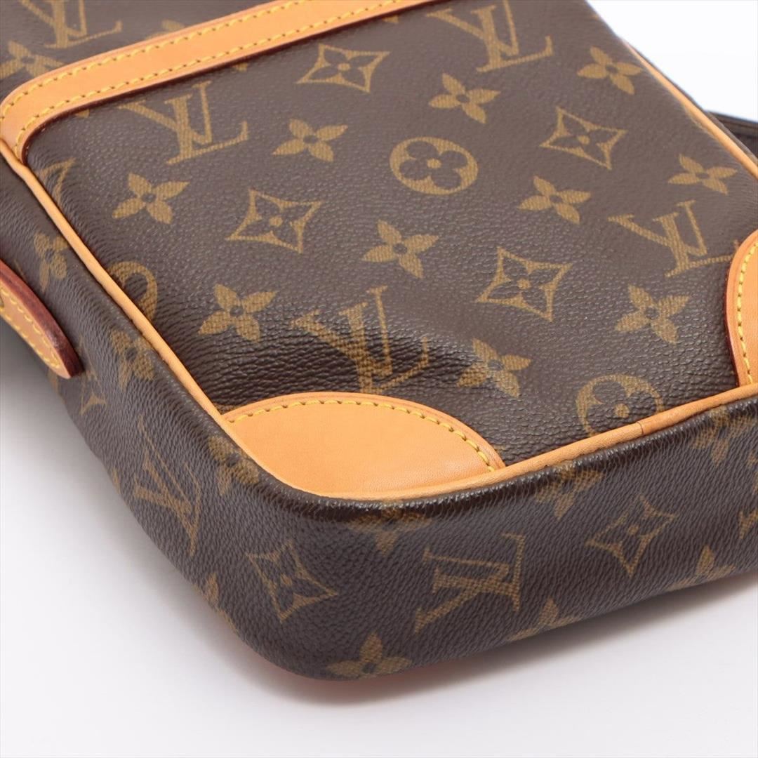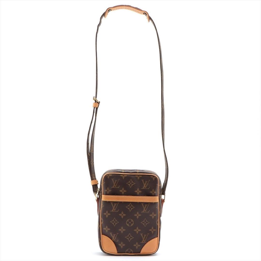 Brown and tan monogram coated canvas Louis Vuitton Danube bag with gold-tone hardware, tan vachetta leather accents, flat shoulder strap, front exterior slit pocket, brown Taiga leather lining, single open pocket at interior wall and zip closure at top.