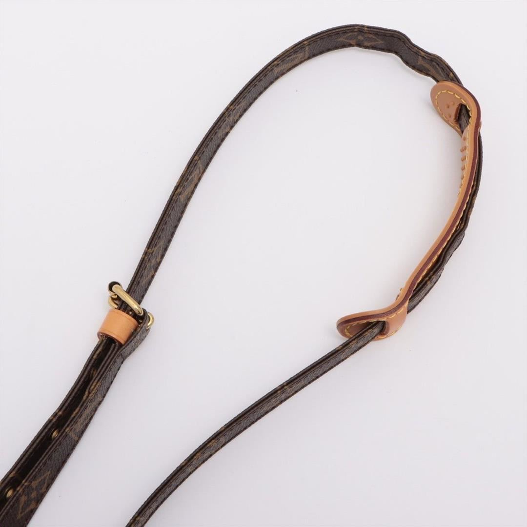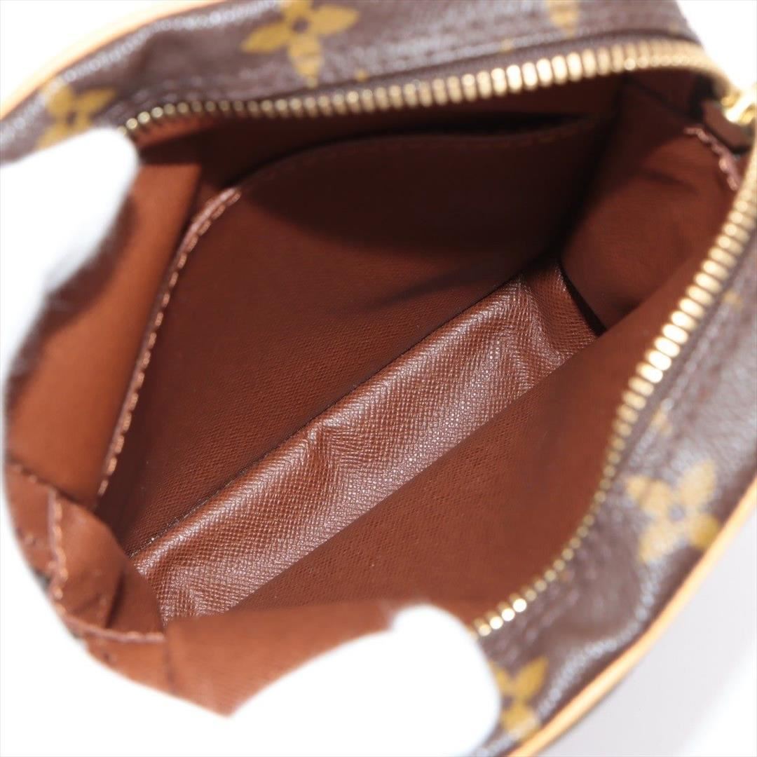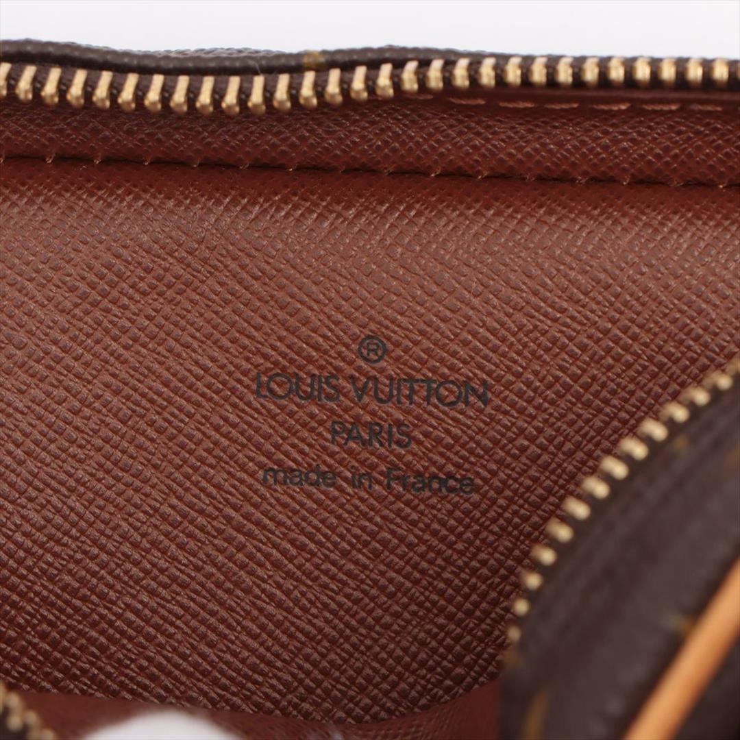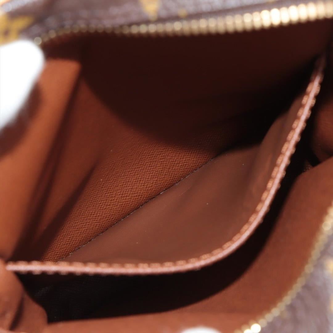 Brown and tan monogram coated canvas Louis Vuitton Danube bag with gold-tone hardware, tan vachetta leather accents, flat shoulder strap, front exterior slit pocket, brown Taiga leather lining, single open pocket at interior wall and zip closure at top.