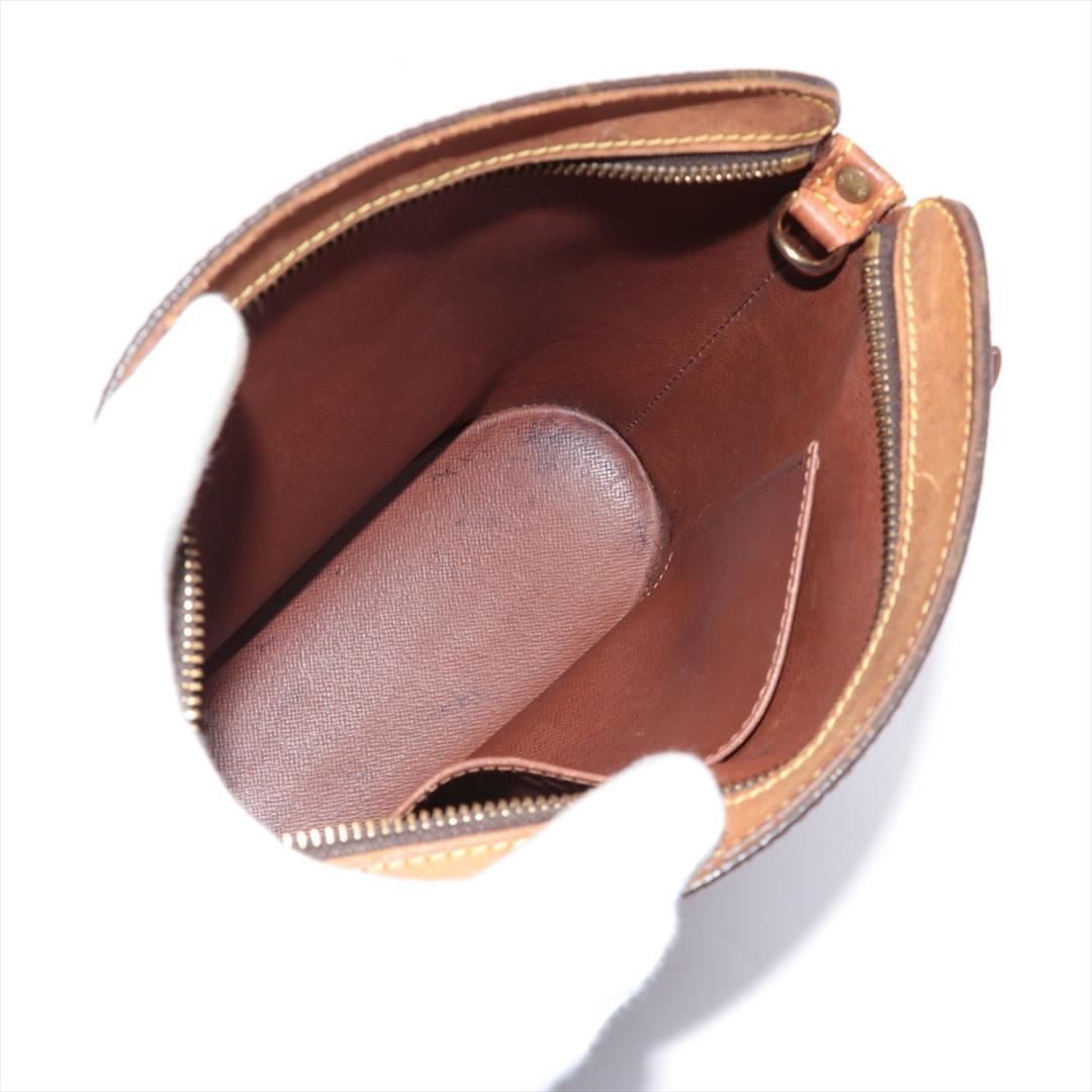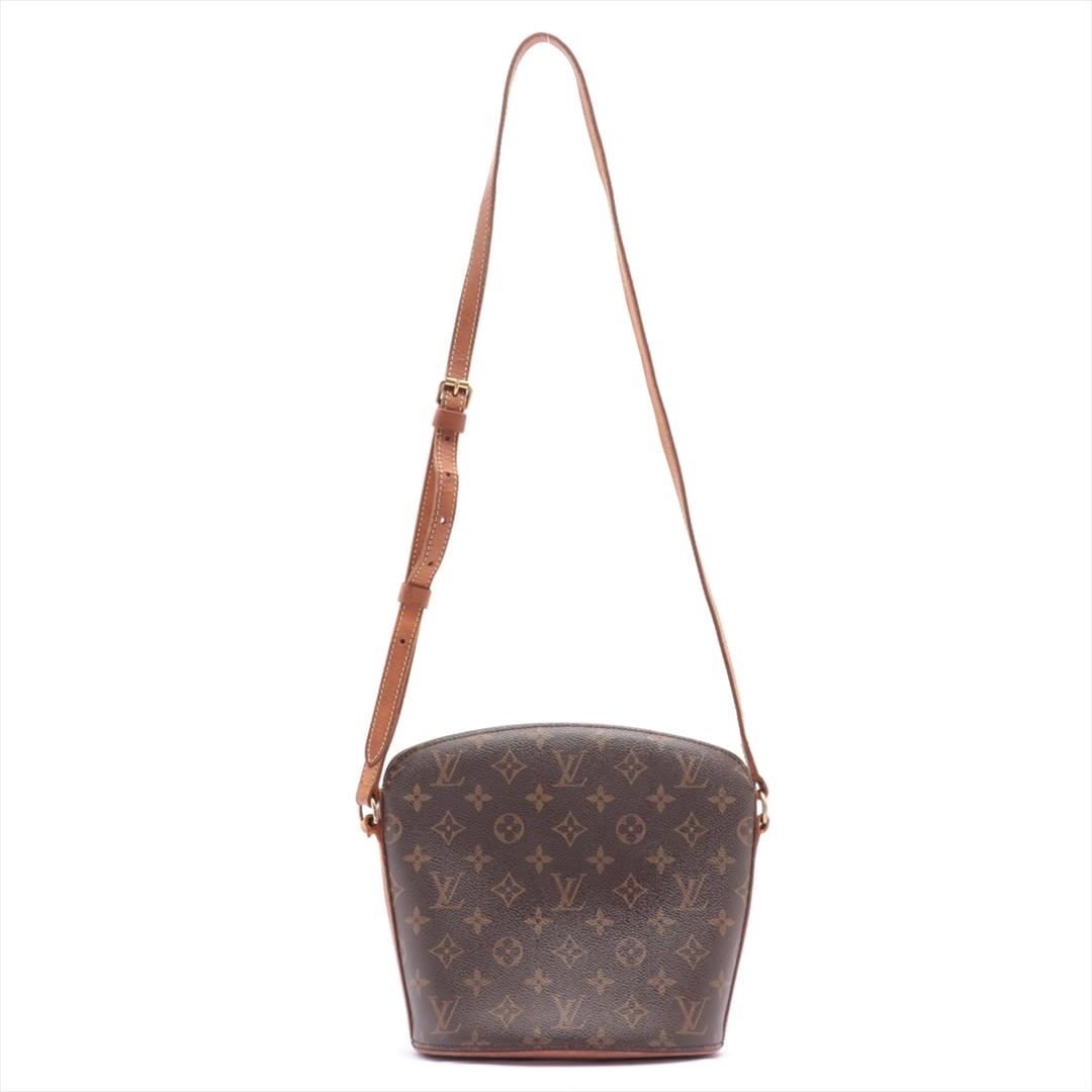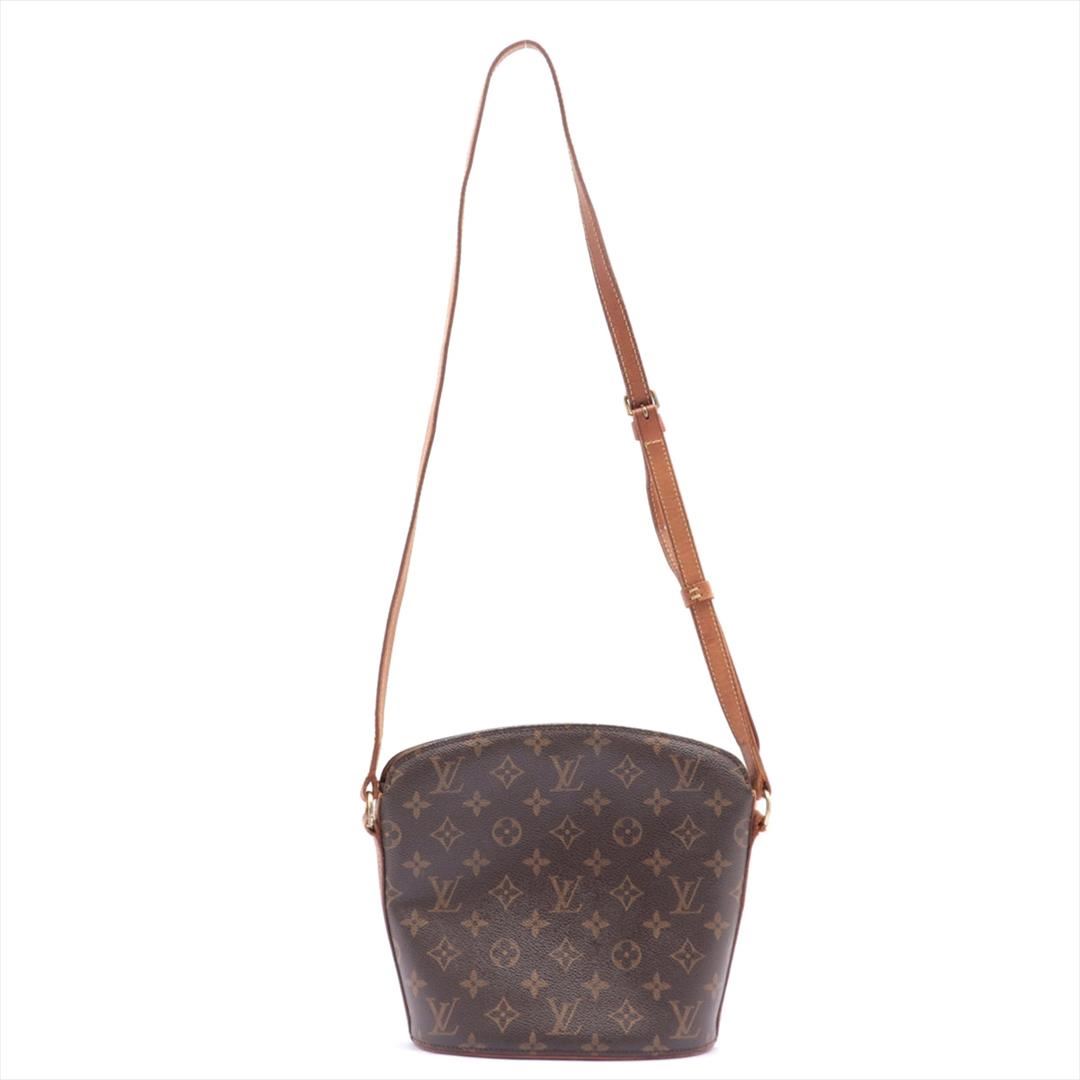 Brown and tan monogram coated canvas Louis Vuitton Drouot bag with brass hardware, tan vachetta leather trim, single adjustable shoulder strap, brown Taiga leather interior, single slit pocket at interior wall and zip closure at top. 6 9.75"x4"8.