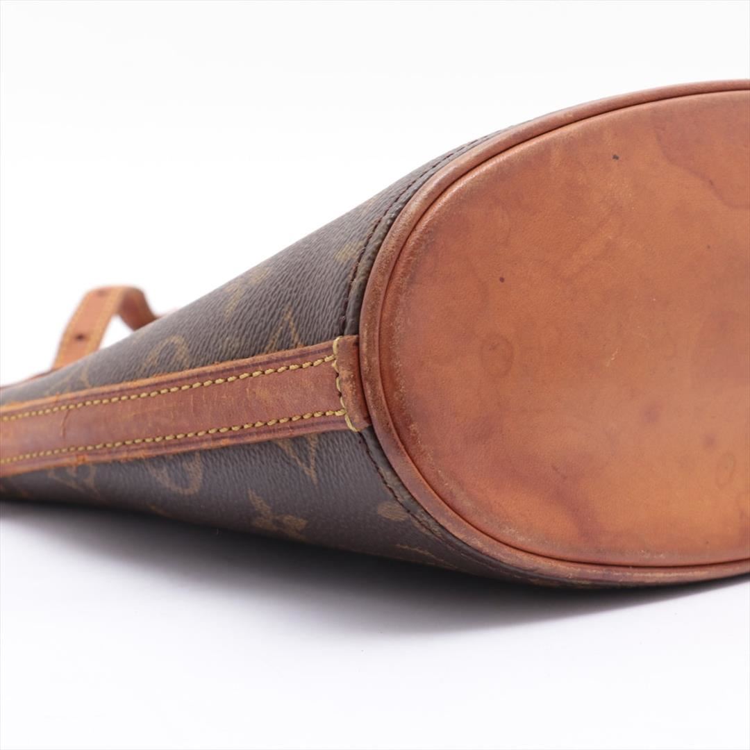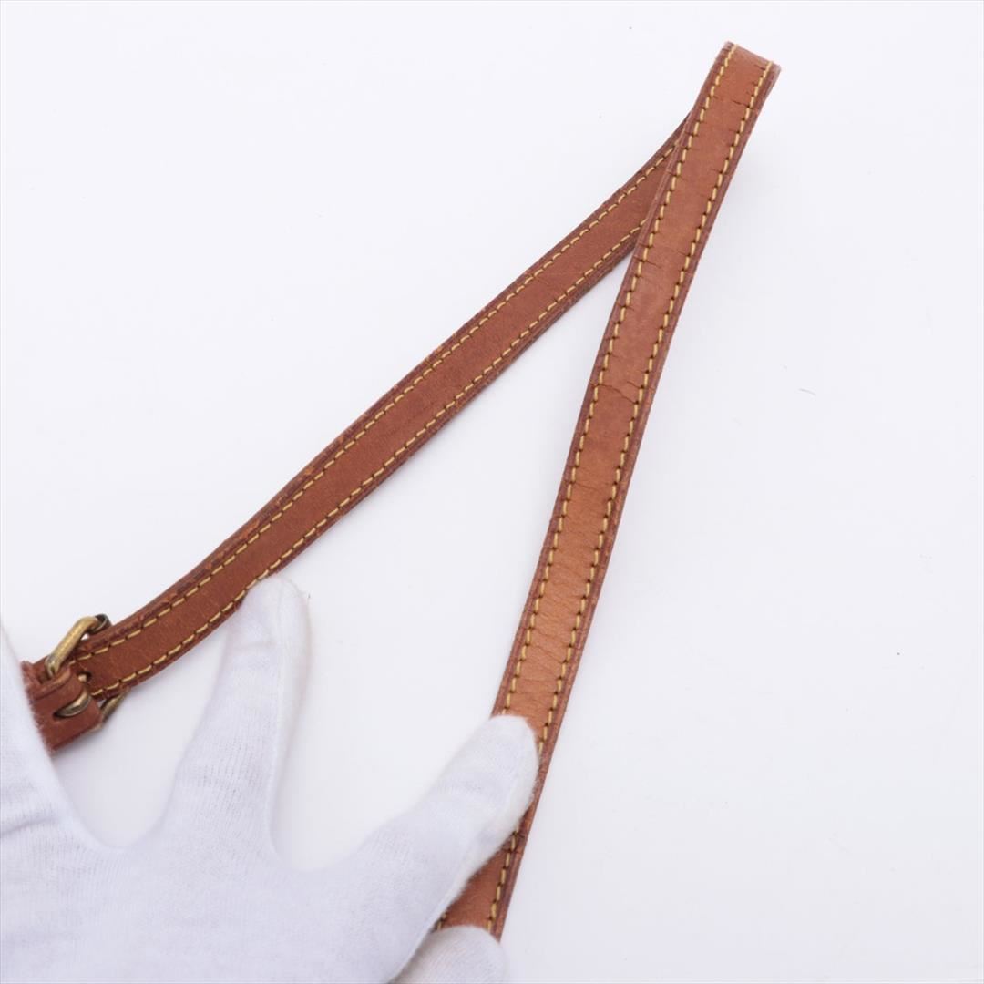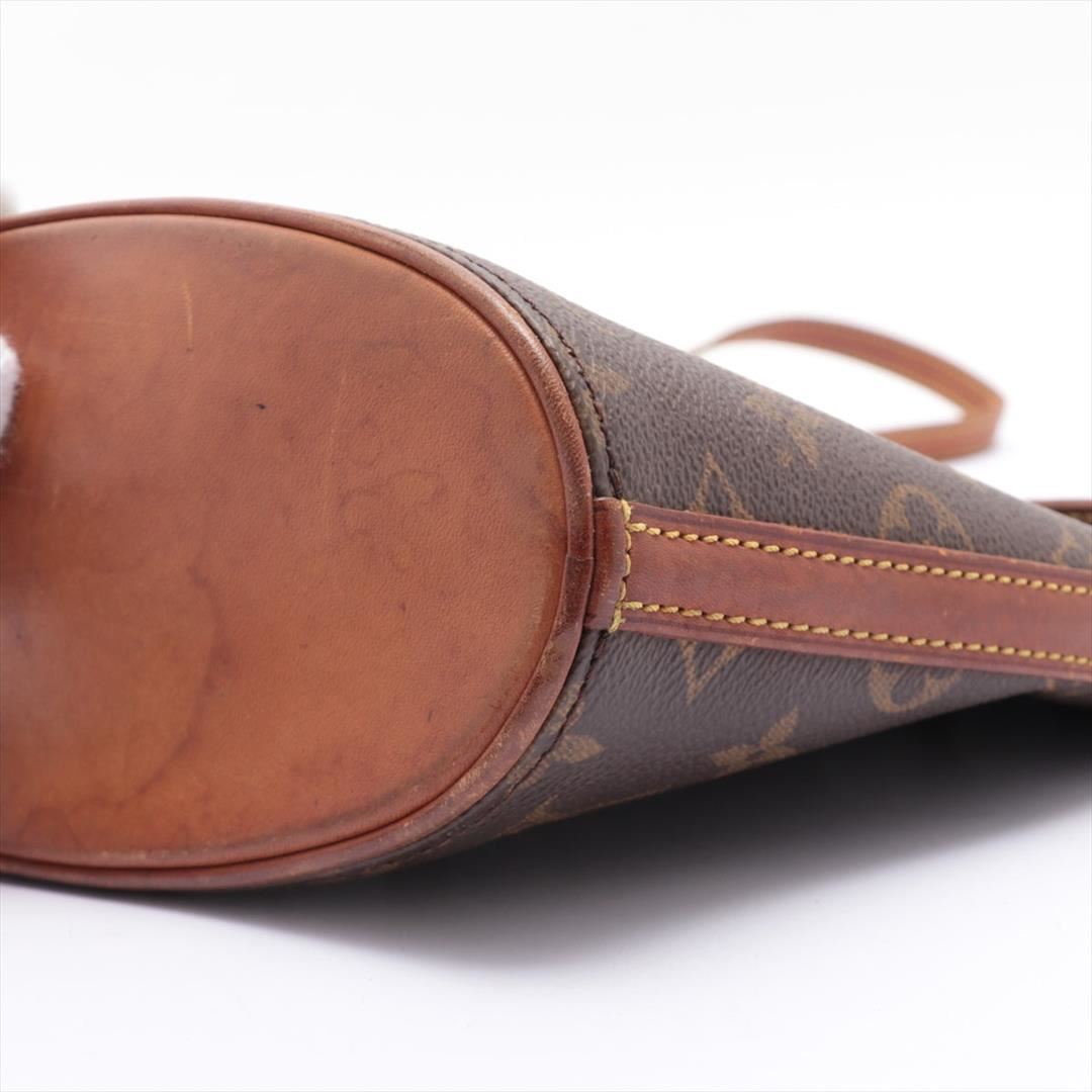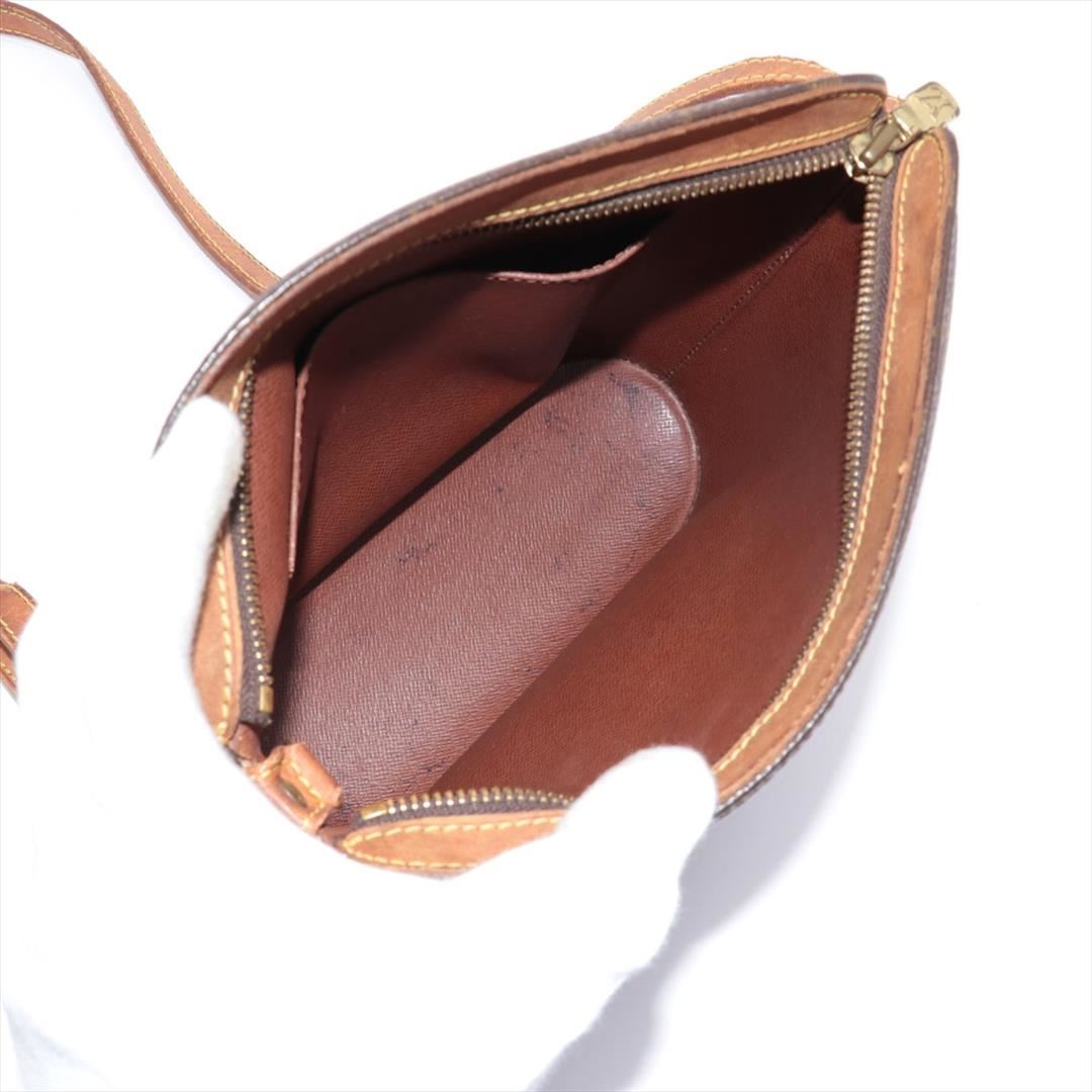 Brown and tan monogram coated canvas Louis Vuitton Drouot bag with brass hardware, tan vachetta leather trim, single adjustable shoulder strap, brown Taiga leather interior, single slit pocket at interior wall and zip closure at top. 6 9.75"x4"8.