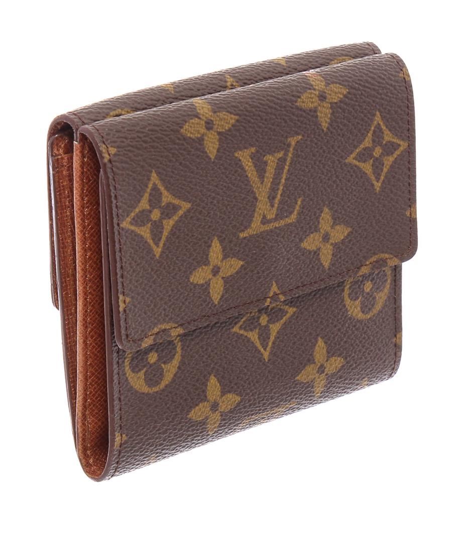 Brown and tan monogram coated canvas Louis Vuitton Elise compact wallet with brass hardware, cinnamon Taiga leather lining, dual compartments at exterior featuring snap closure, dual bill compartments at interior walls, single card slot and snap closure at exterior back.