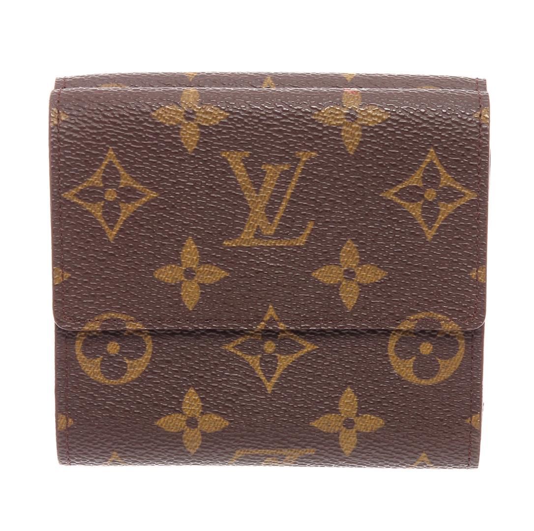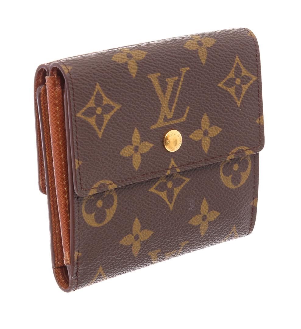 Brown and tan monogram coated canvas Louis Vuitton Elise compact wallet with brass hardware, cinnamon Taiga leather lining, dual compartments at exterior featuring snap closure, dual bill compartments at interior walls, single card slot and snap closure at exterior back.