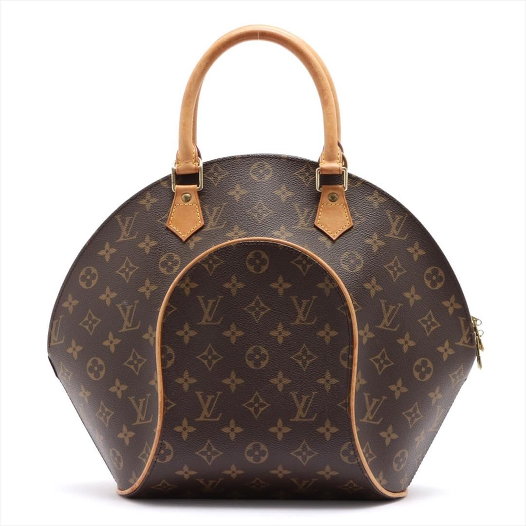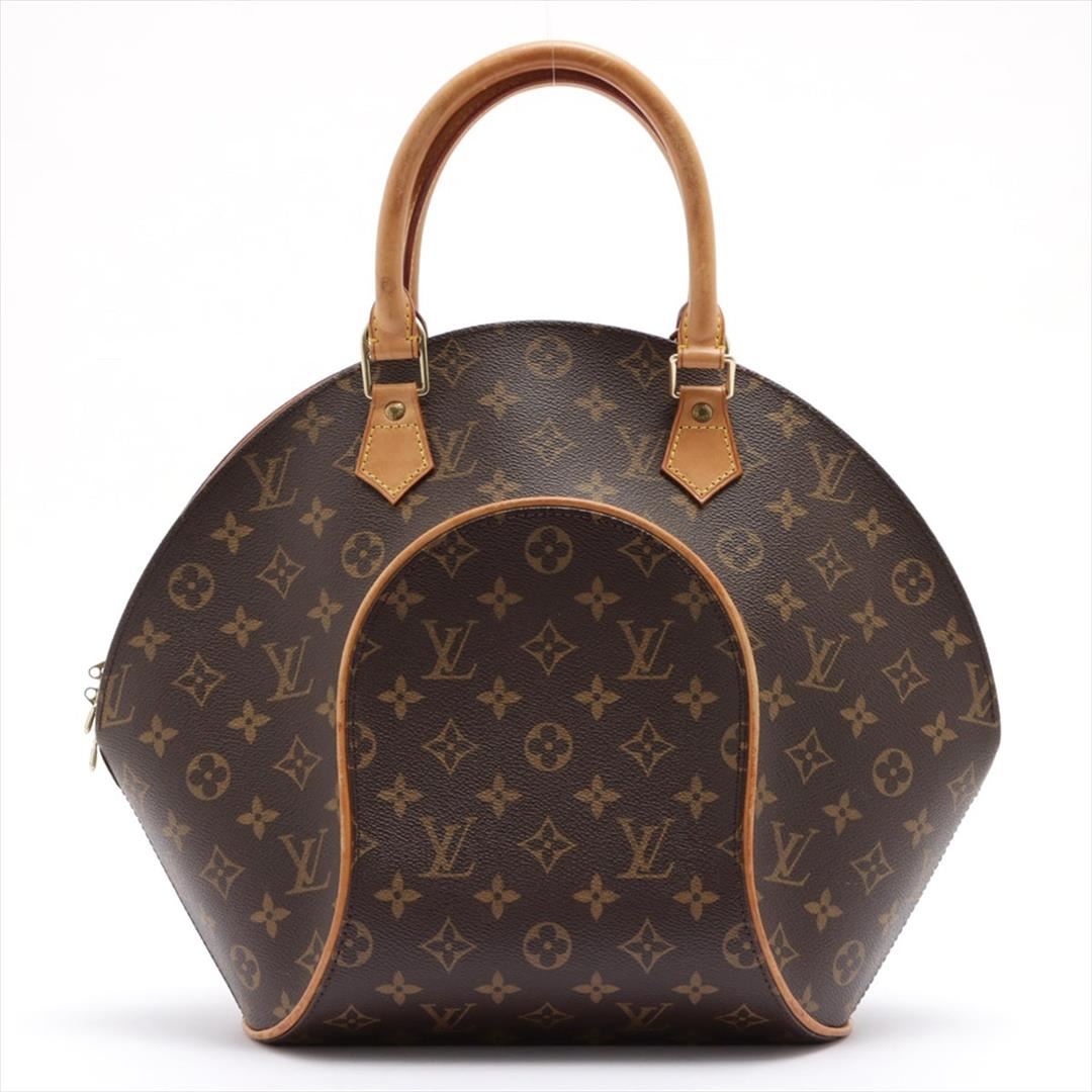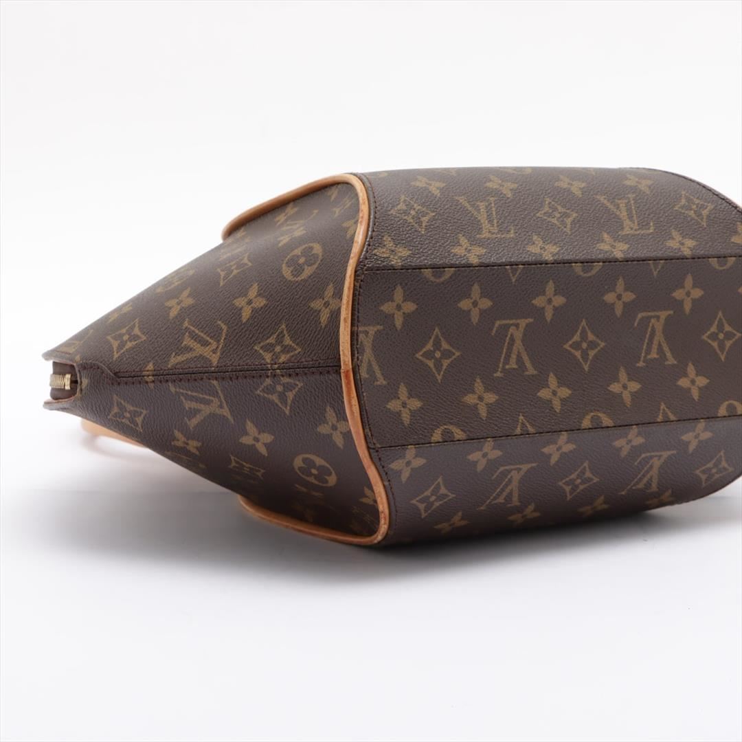 Brown and tan monogram coated canvas Louis Vuitton Monogram Ellipse MM with brass hardware, tan vachetta leather accents, dual rolled top handles, brown canvas lining, single pocket at interior wall and two-way zip closure at top. 6 10"x3"x12"xBag
