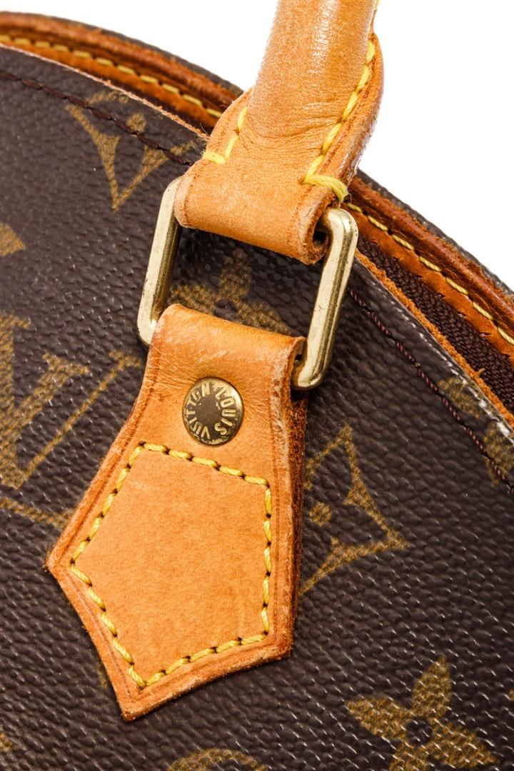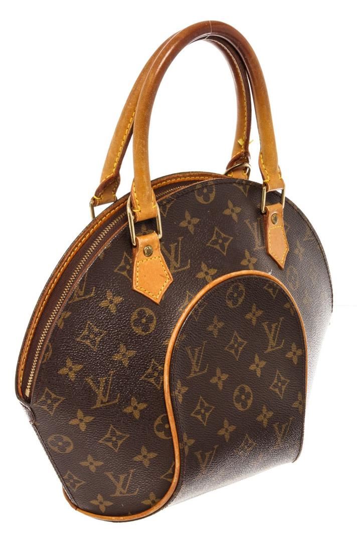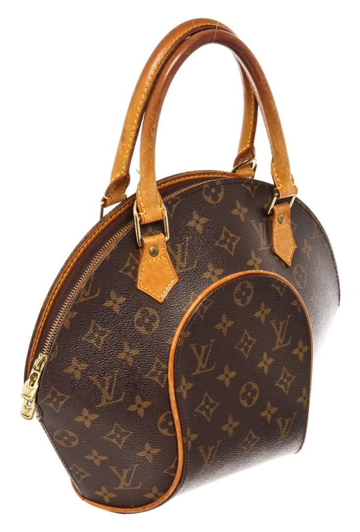 Brown and tan monogram coated canvas Louis Vuitton Ellipse PM with brass hardware, tan vachetta leather trim, dual rolled handles, brown canvas lining, single slit pocket at interior wall and zip closure at top.