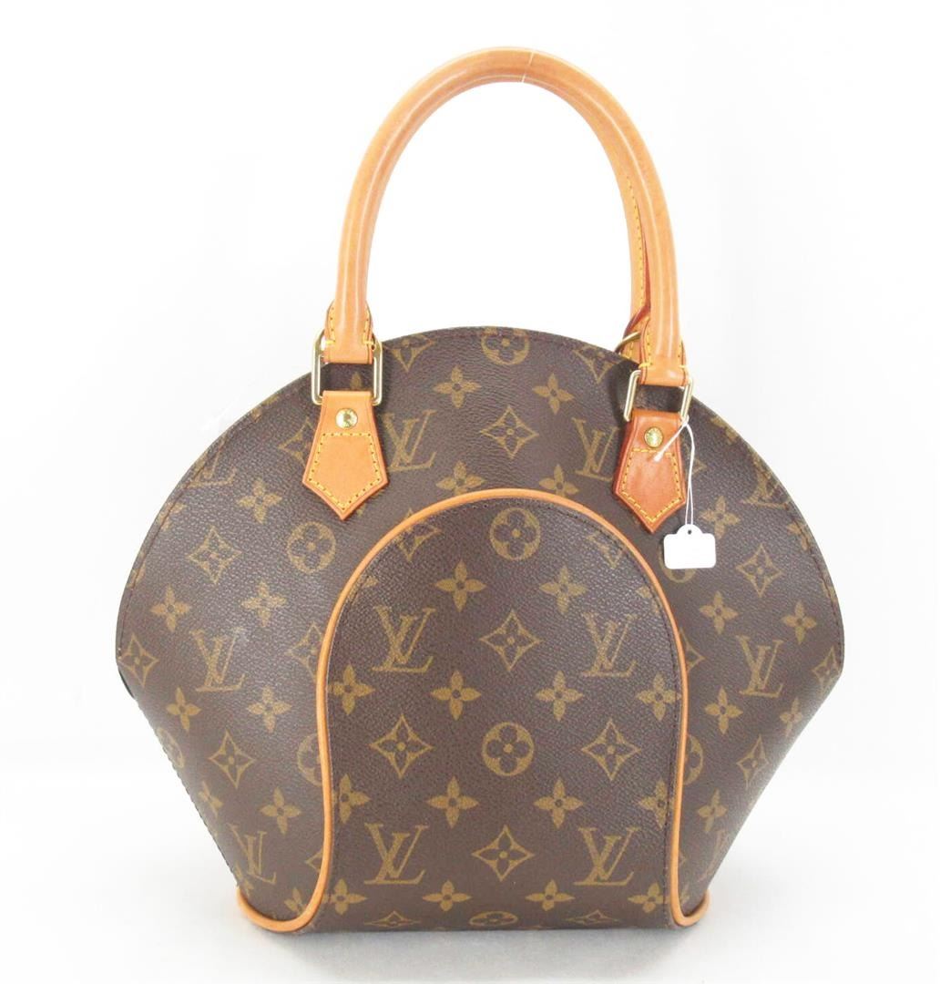 One Louis Vuitton Brown Monogram Canvas Leather Ellipse PM Handbag. Item is sold AS-IS. All available information is listed in the description and shown in the photo. Brown and tan monogram coated canvas Louis Vuitton Ellipse PM with gold-tone hardware, tan vachetta leather trim, dual rolled handles, brown canvas lining, single slit pocket at interior wall and zip closure at top. Height: 10" Width: 13.25" Depth: 2.5" Handle Drop: 4"