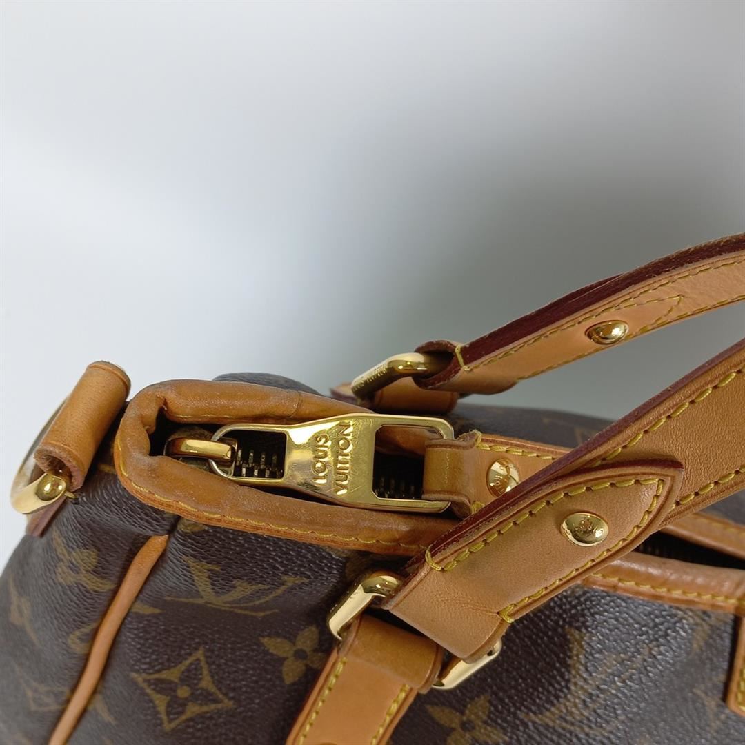 Brown monogram coated canvas Estrela MM shoulder bag with tan Vachetta leather trim, gold-tone hardware, beige Alcantara lining, one large and two small interior flat pockets, dual flat leather handles, a detachable adjustable leather shoulder strap and z