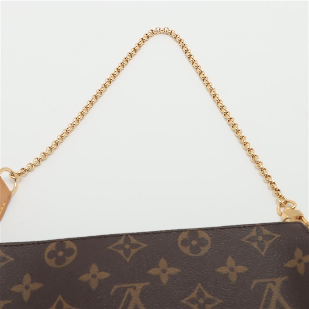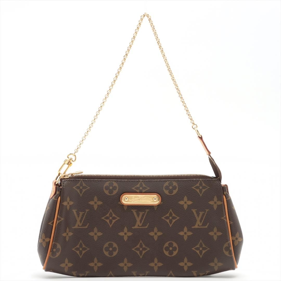 Brown and tan monogram coated canvas Louis Vuitton Pochette Eva shoulder bag with gold-tone hardware, tan vachetta leather trim, convertible chain-link handle, brown woven canvas lining and zip closure at top. 9.75"x1.5"x5.5"xBag Drop:8"/24.7cmx3.8cmx13.