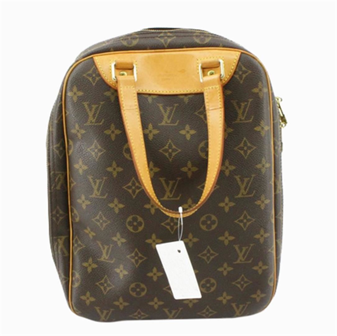 Brown and tan monogram coated canvas Louis Vuitton Excursion bag with gold-tone hardware, tan vachetta leather trim, dual flat top handles, beige canvas lining, single interior wall pocket and two-way zip-around closure. 9.5"x4.75"x12.5"xBag Drop:5"/24