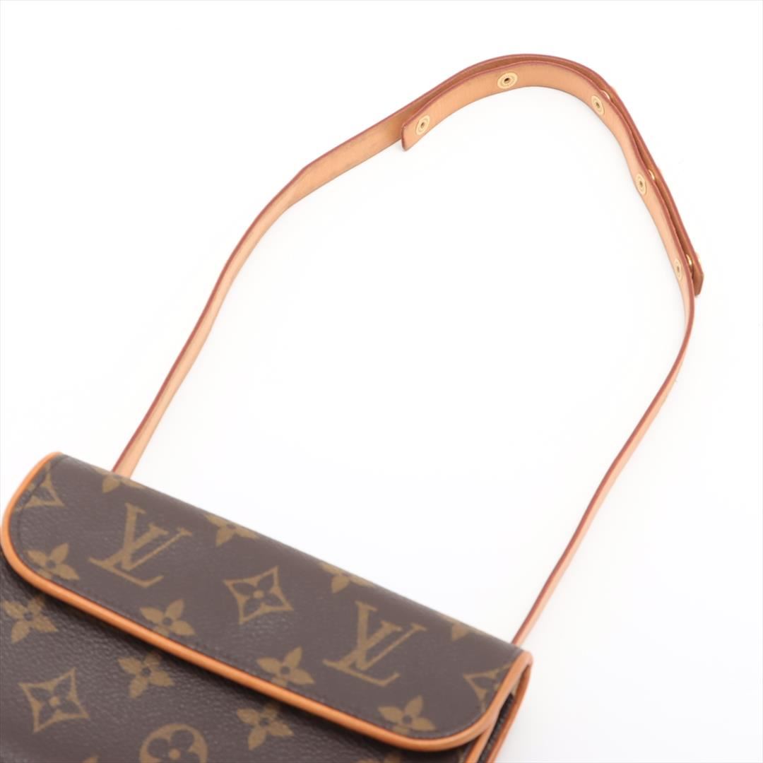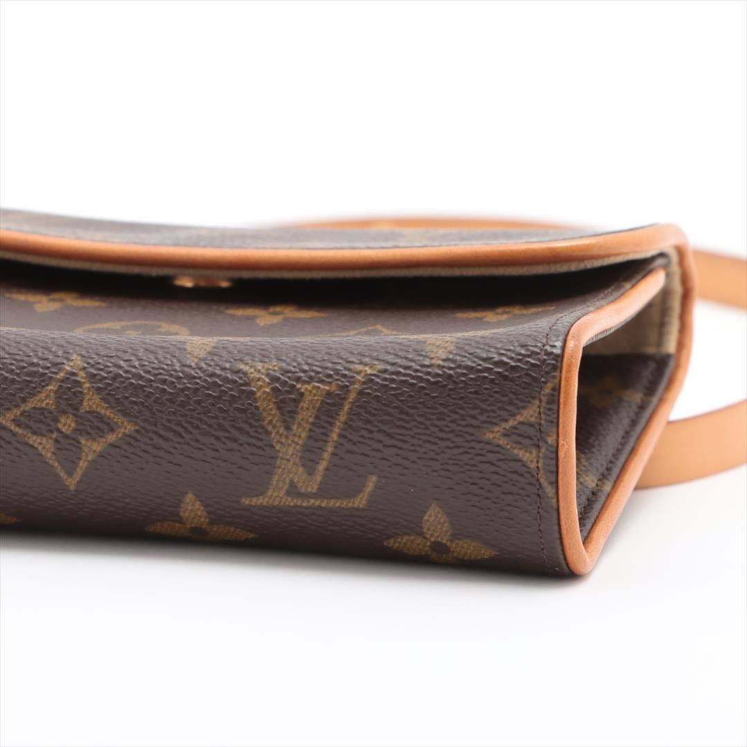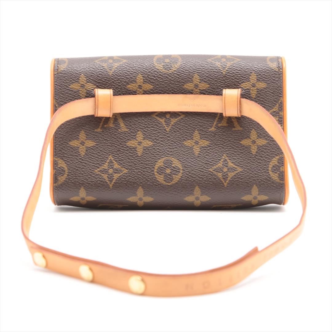 Brown and tan monogram coated canvas Louis Vuitton Pochette Florentine waist bag with gold-tone hardware, tan vachetta leather trim, optional waist strap with snap closure, beige Alcantara lining and flap with magnetic snap closure at front. 6.5"x1.5"x