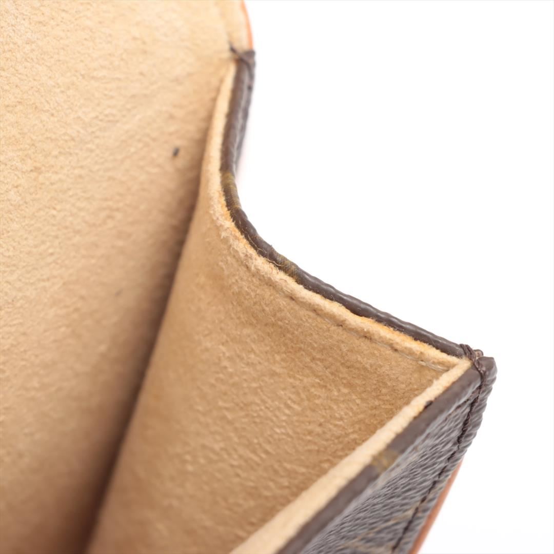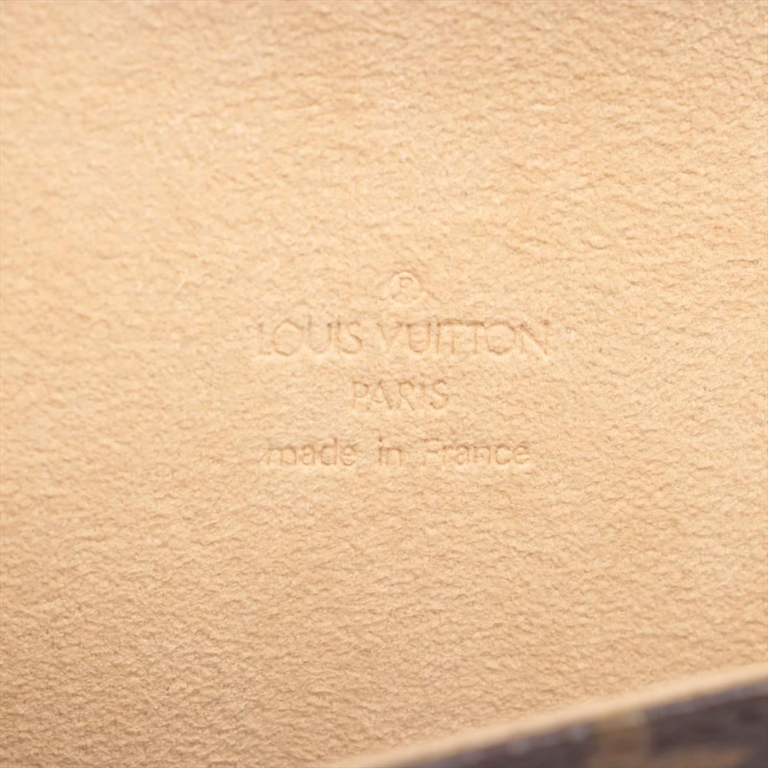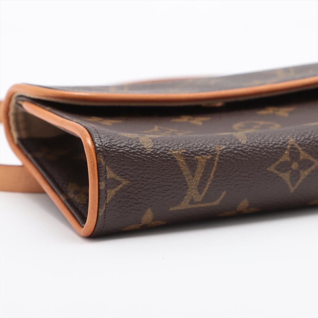 Brown and tan monogram coated canvas Louis Vuitton Pochette Florentine waist bag with gold-tone hardware, tan vachetta leather trim, optional waist strap with snap closure, beige Alcantara lining and flap with magnetic snap closure at front. 6.5"x1.5"x