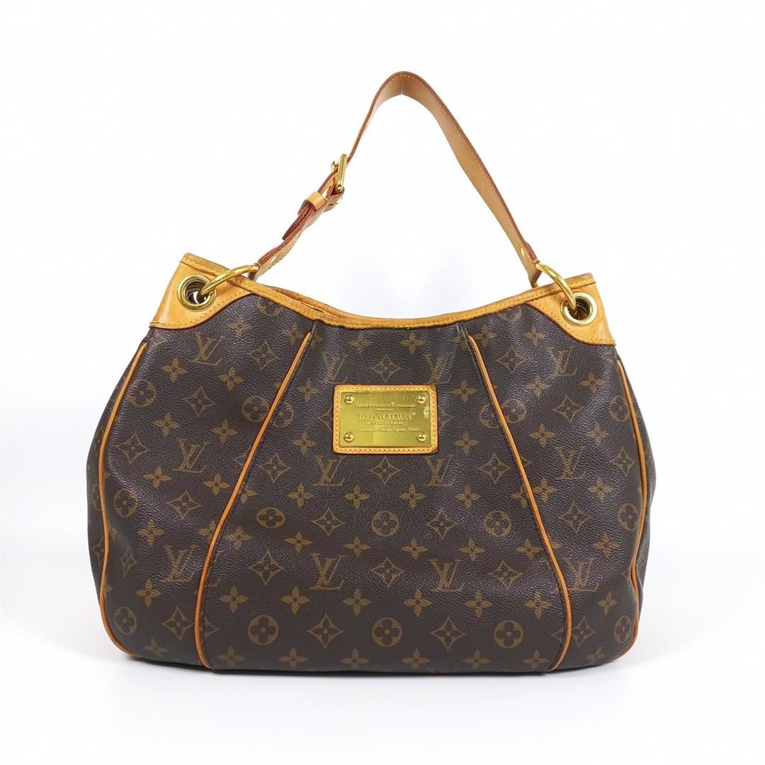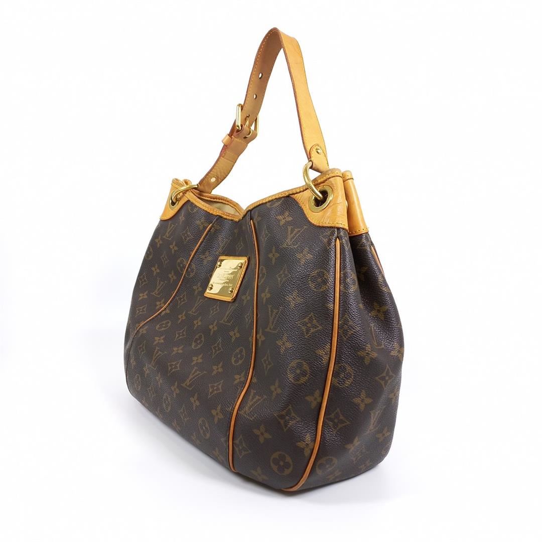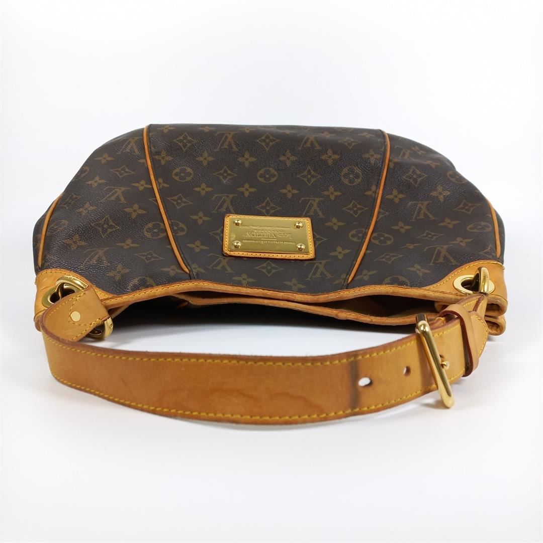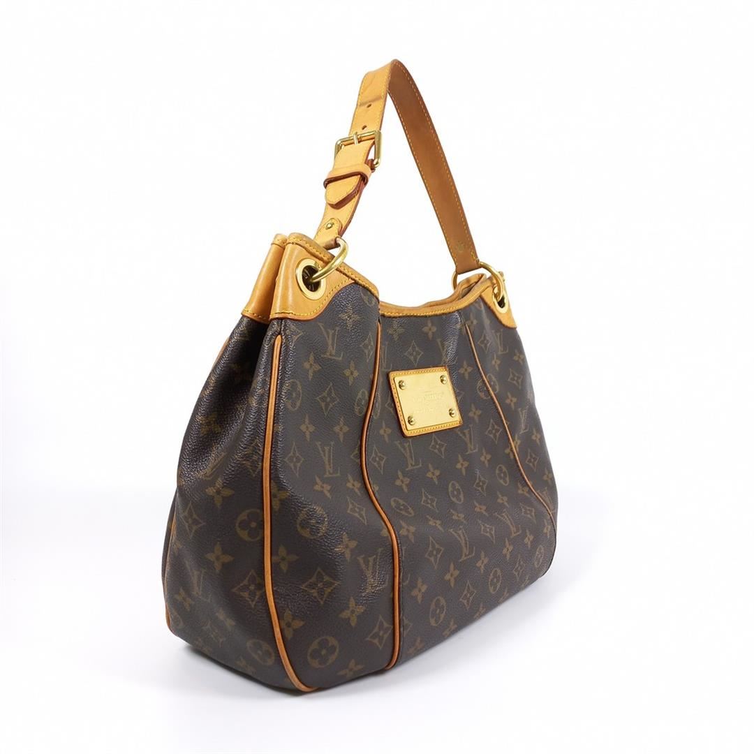 Brown and tan monogram coated canvas Louis Vuitton Galliera PM with gold-tone hardware, tan vachetta leather trim, single flat shoulder strap, logo placard at front face, beige Alcantara lining, single pocket at interior wall with flap and snap closure an