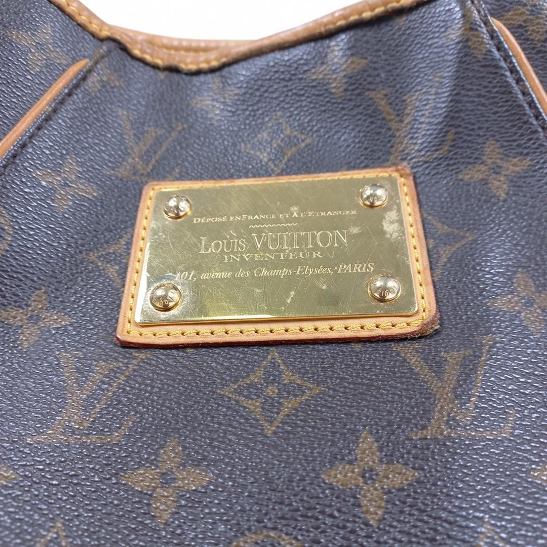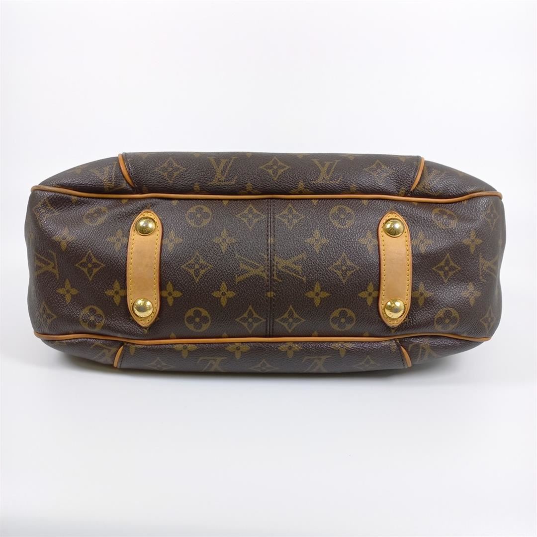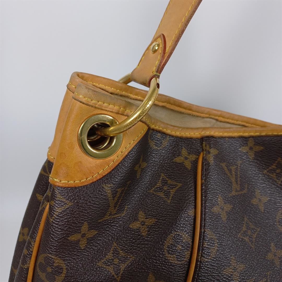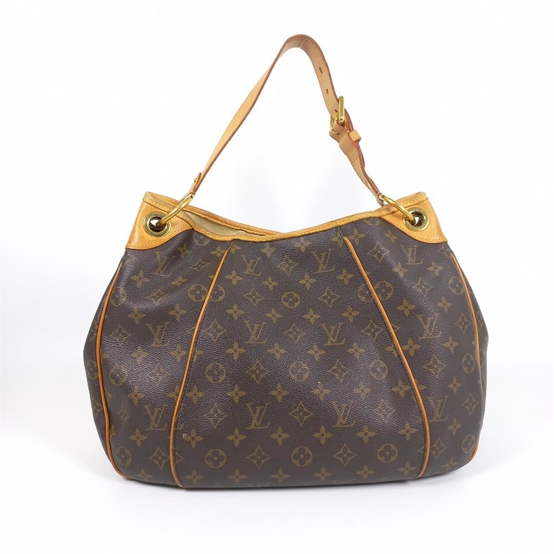 Brown and tan monogram coated canvas Louis Vuitton Galliera PM with gold-tone hardware, tan vachetta leather trim, single flat shoulder strap, logo placard at front face, beige Alcantara lining, single pocket at interior wall with flap and snap closure an