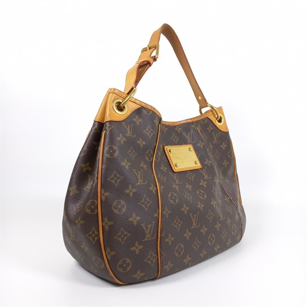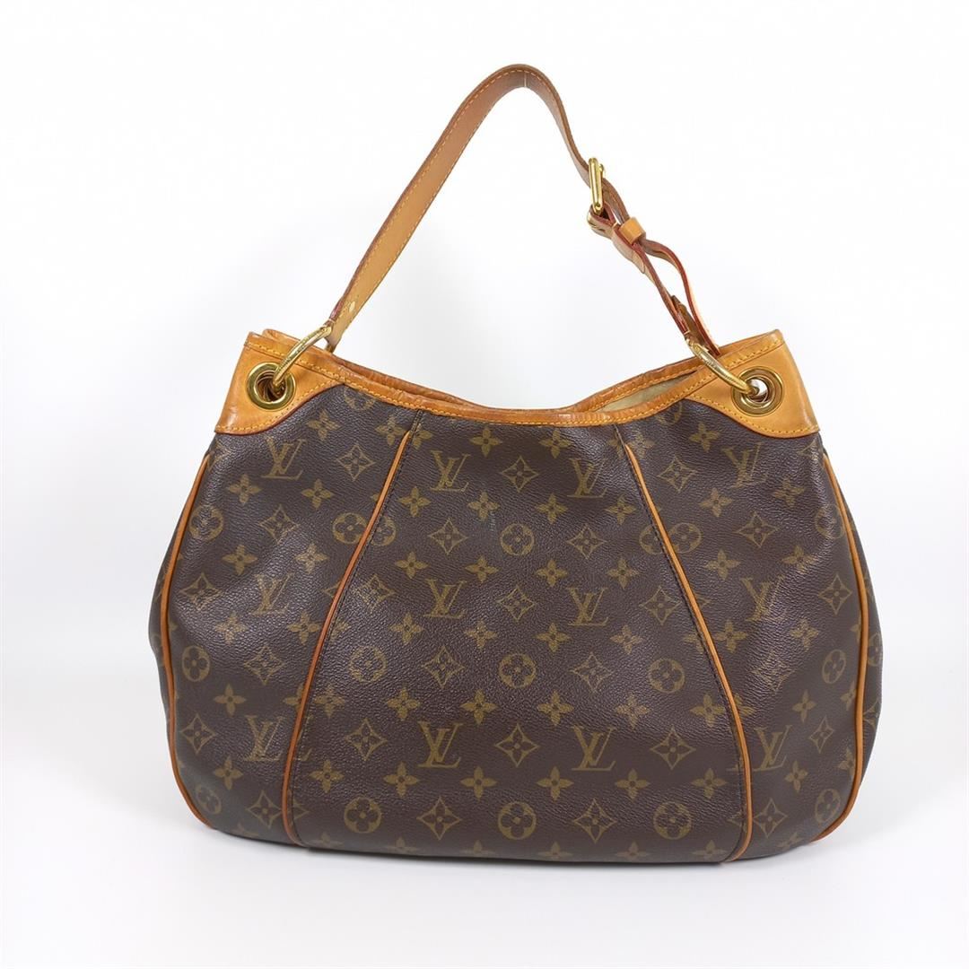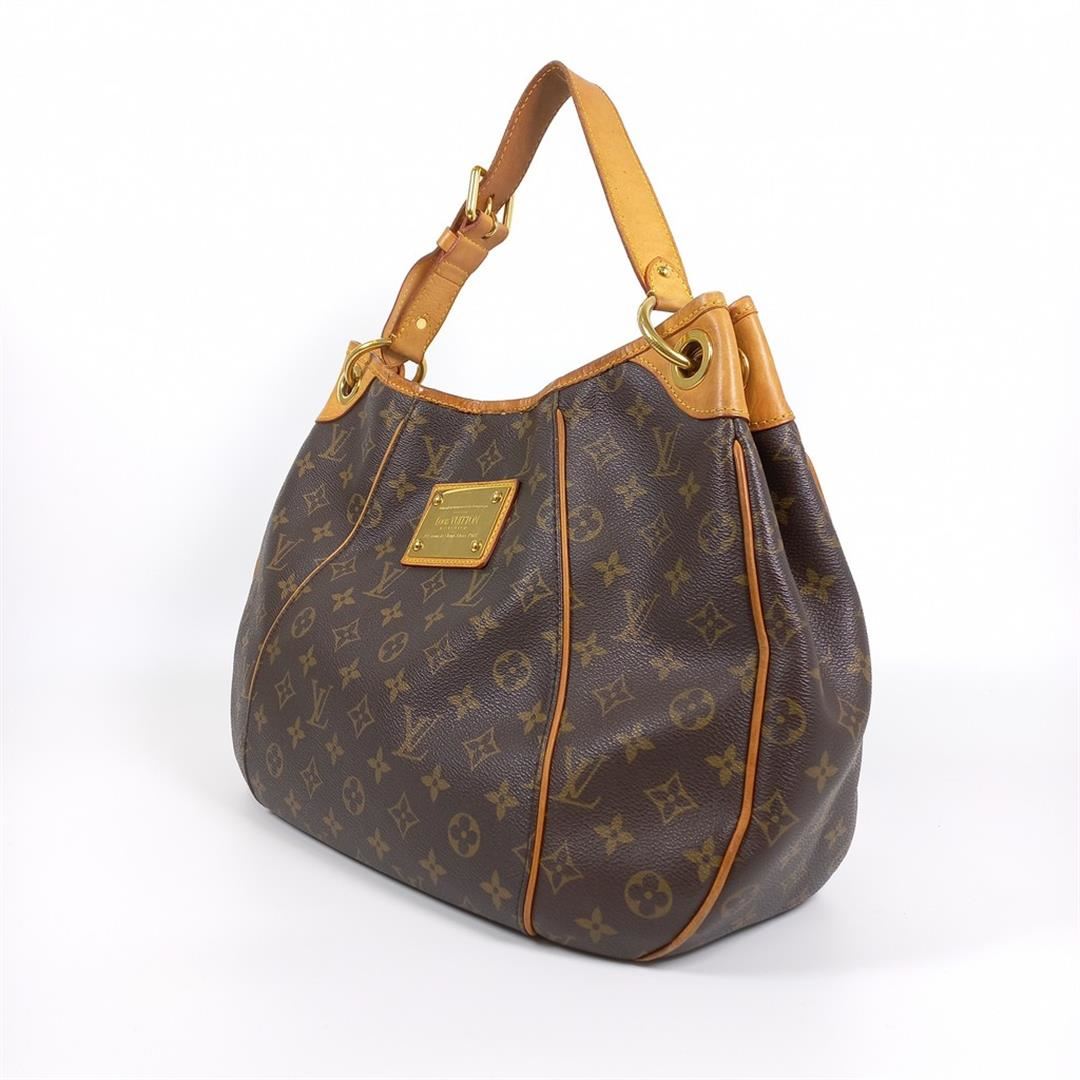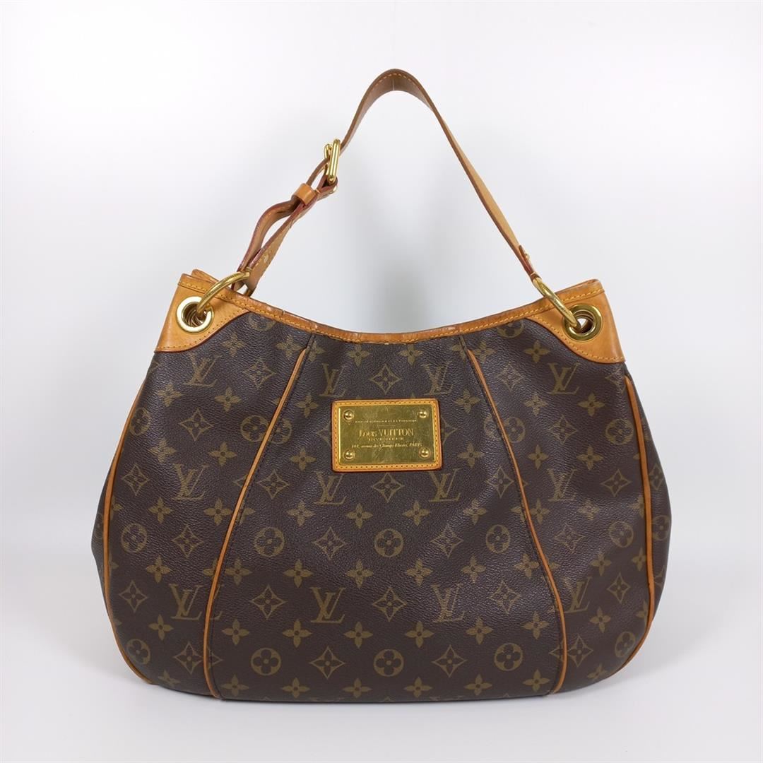 Brown and tan monogram coated canvas Louis Vuitton Galliera PM with gold-tone hardware, tan vachetta leather trim, single flat shoulder strap, logo placard at front face, beige Alcantara lining, single pocket at interior wall with flap and snap closure an