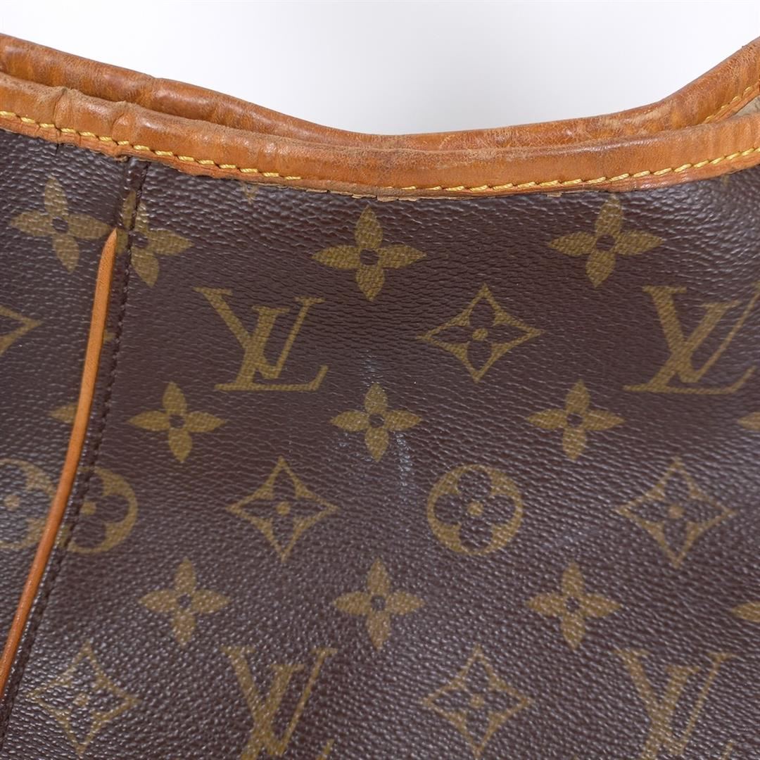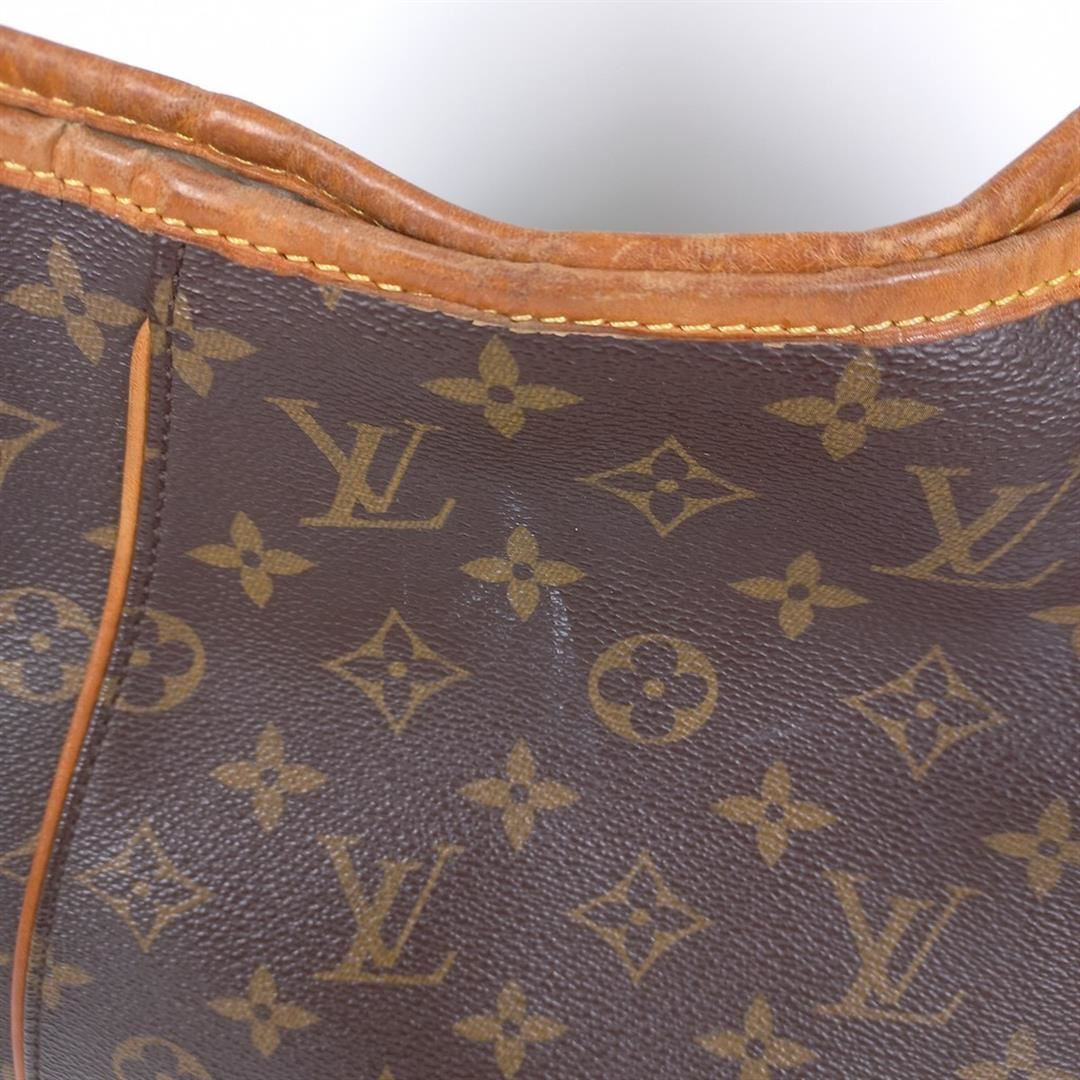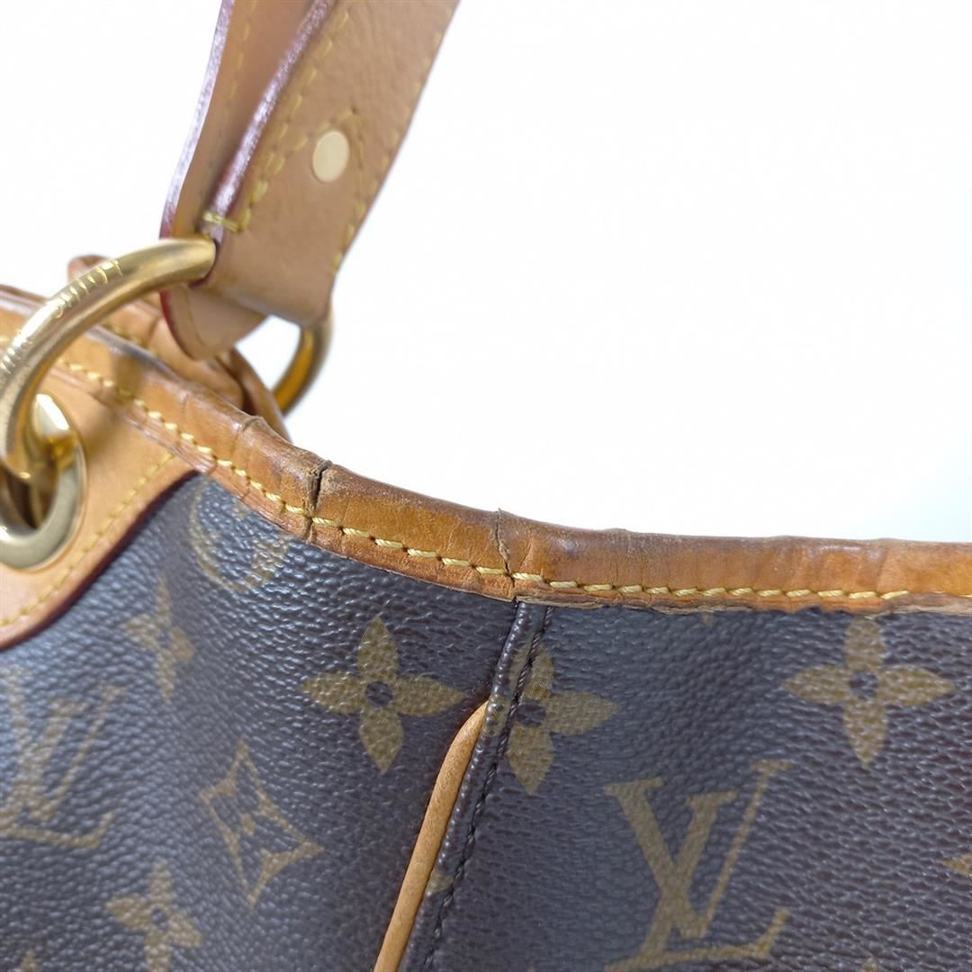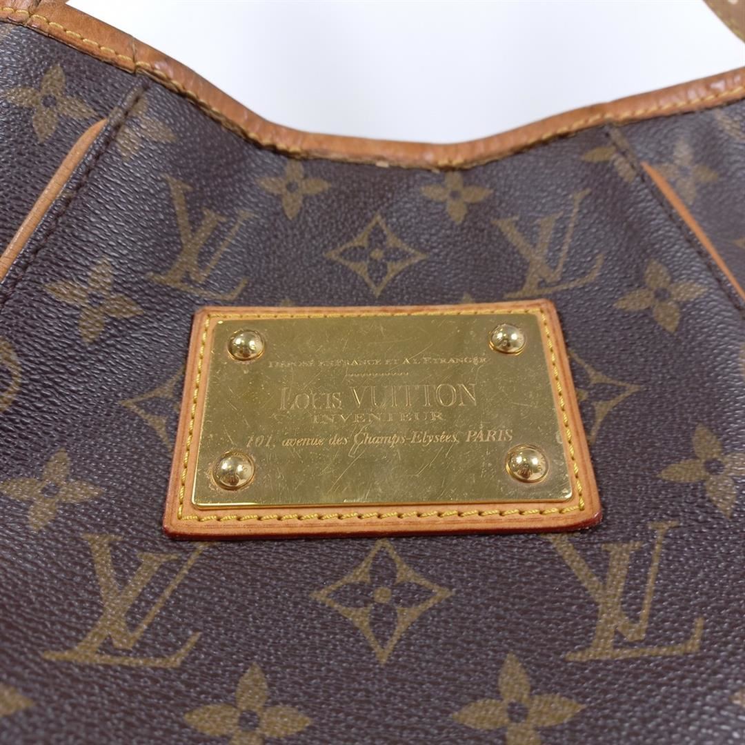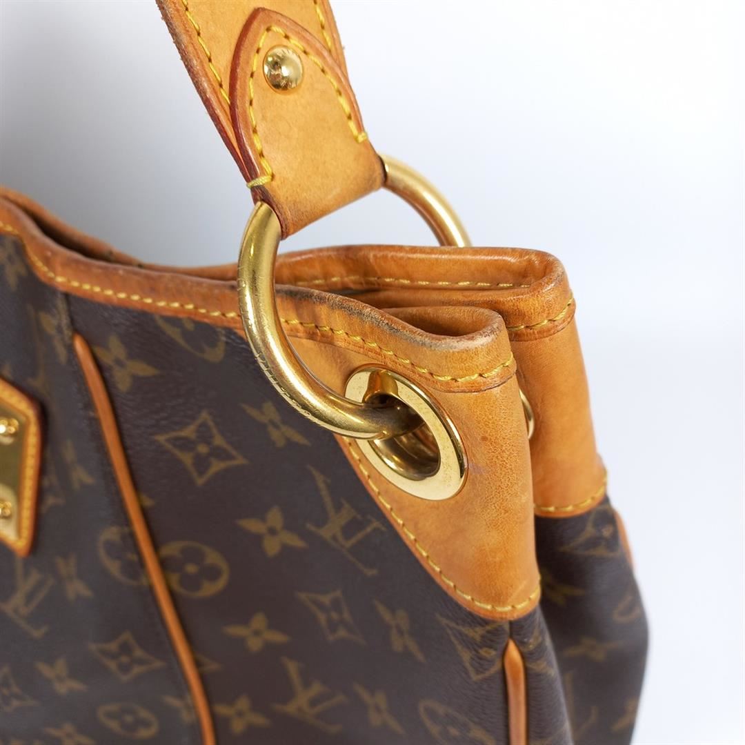 Brown and tan monogram coated canvas Louis Vuitton Galliera PM with gold-tone hardware, tan vachetta leather trim, single flat shoulder strap, logo placard at front face, beige Alcantara lining, single pocket at interior wall with flap and snap closure an