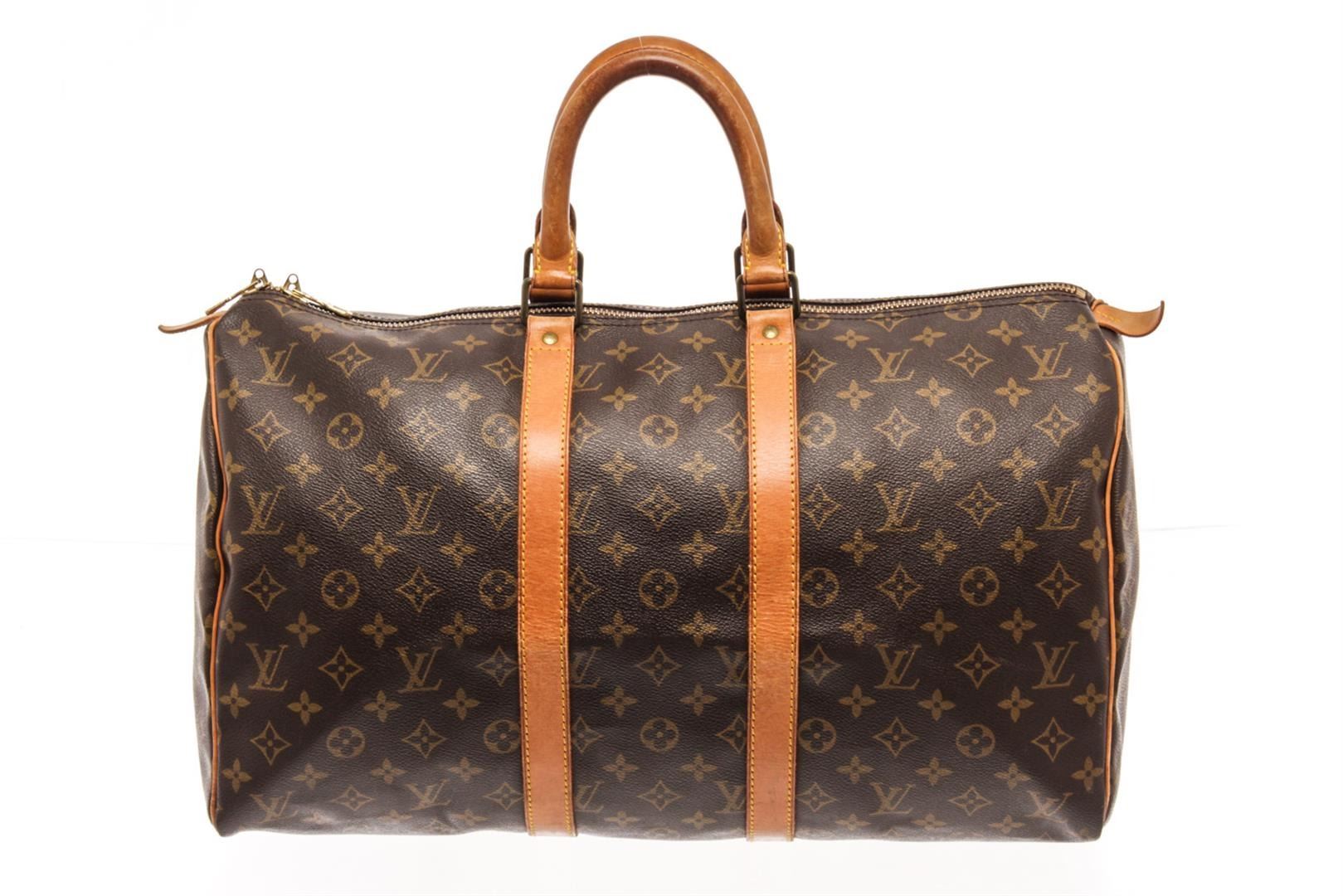 Louis Vuitton Brown Monogram Canvas Leather Keepall 45 Travel Bag. All available information is listed in the description and shown in the photos. Vintage Louis Vuitton brown monogram canvas Keepall 45 travel bag with gold-toned hardware, rolled leather handles, and top zipper closure. Height: 10.25" Width: 18" Depth: 7.75", Handle Drop: 4.5" / 26.03 x 45.72 x 19.68 Cm