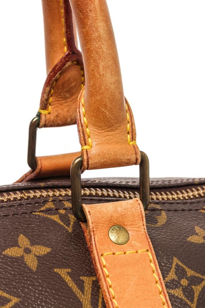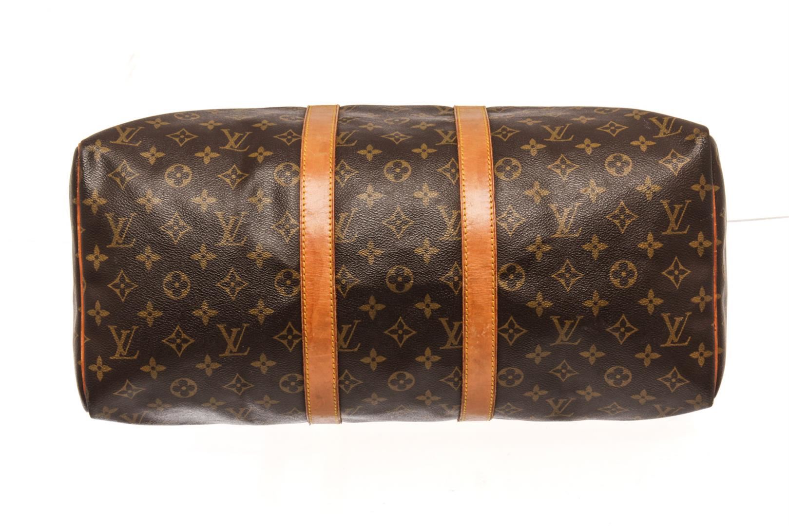 Louis Vuitton Brown Monogram Canvas Leather Keepall 45 Travel Bag. All available information is listed in the description and shown in the photos. Vintage Louis Vuitton brown monogram canvas Keepall 45 travel bag with gold-toned hardware, rolled leather handles, and top zipper closure. Height: 10.25" Width: 18" Depth: 7.75", Handle Drop: 4.5" / 26.03 x 45.72 x 19.68 Cm