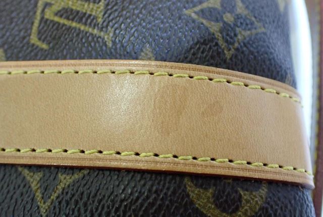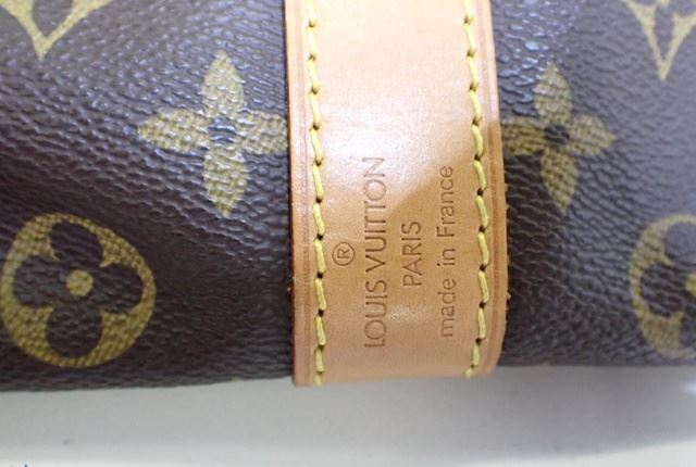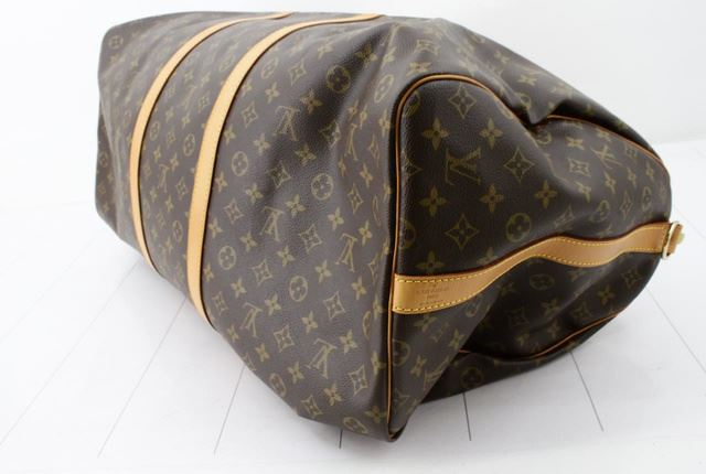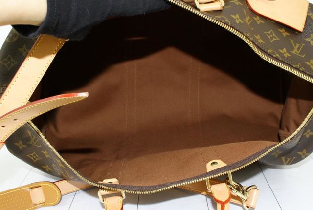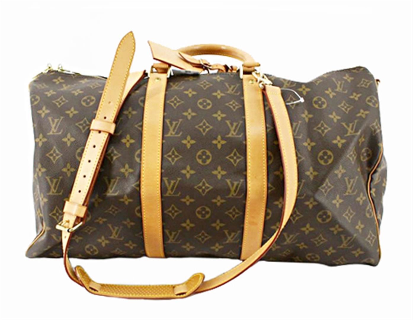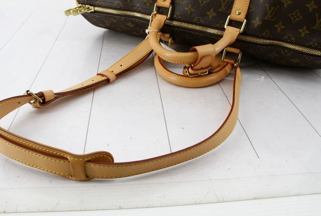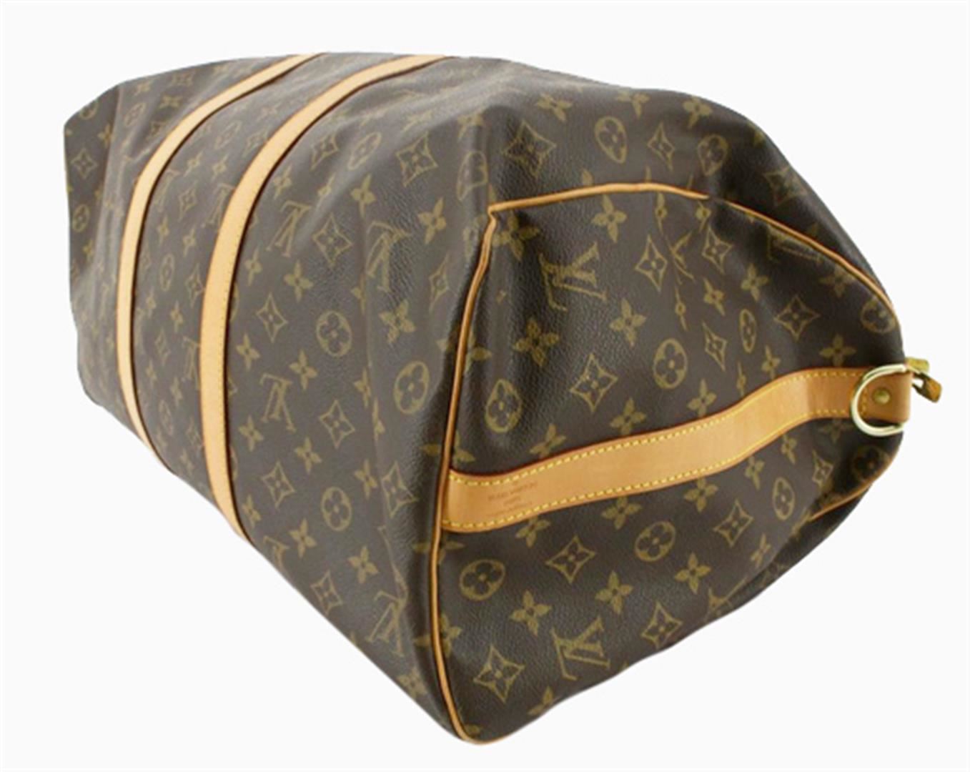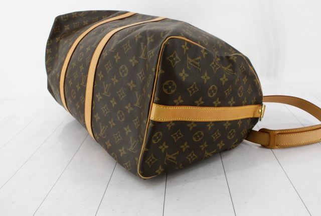 Brown and tan Monogram coated canvas Louis Vuitton Keepall Bandoulière 50 with gold-tone hardware, tan vachetta leather trim, dual rolled top handles, brown canvas lining, single interior compartment and two-way zip closure at top. 20"x8.5"x10.5"xStrap
