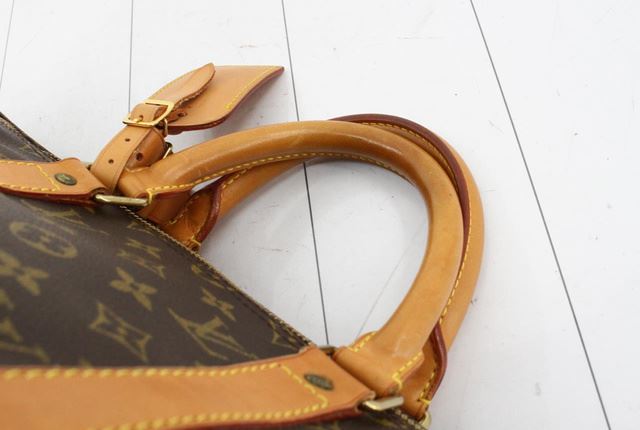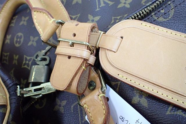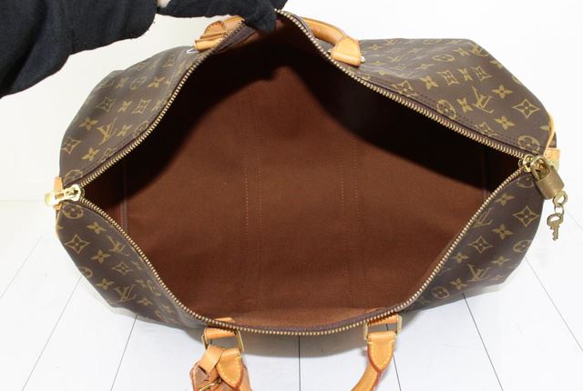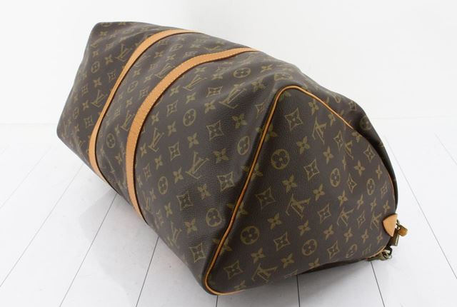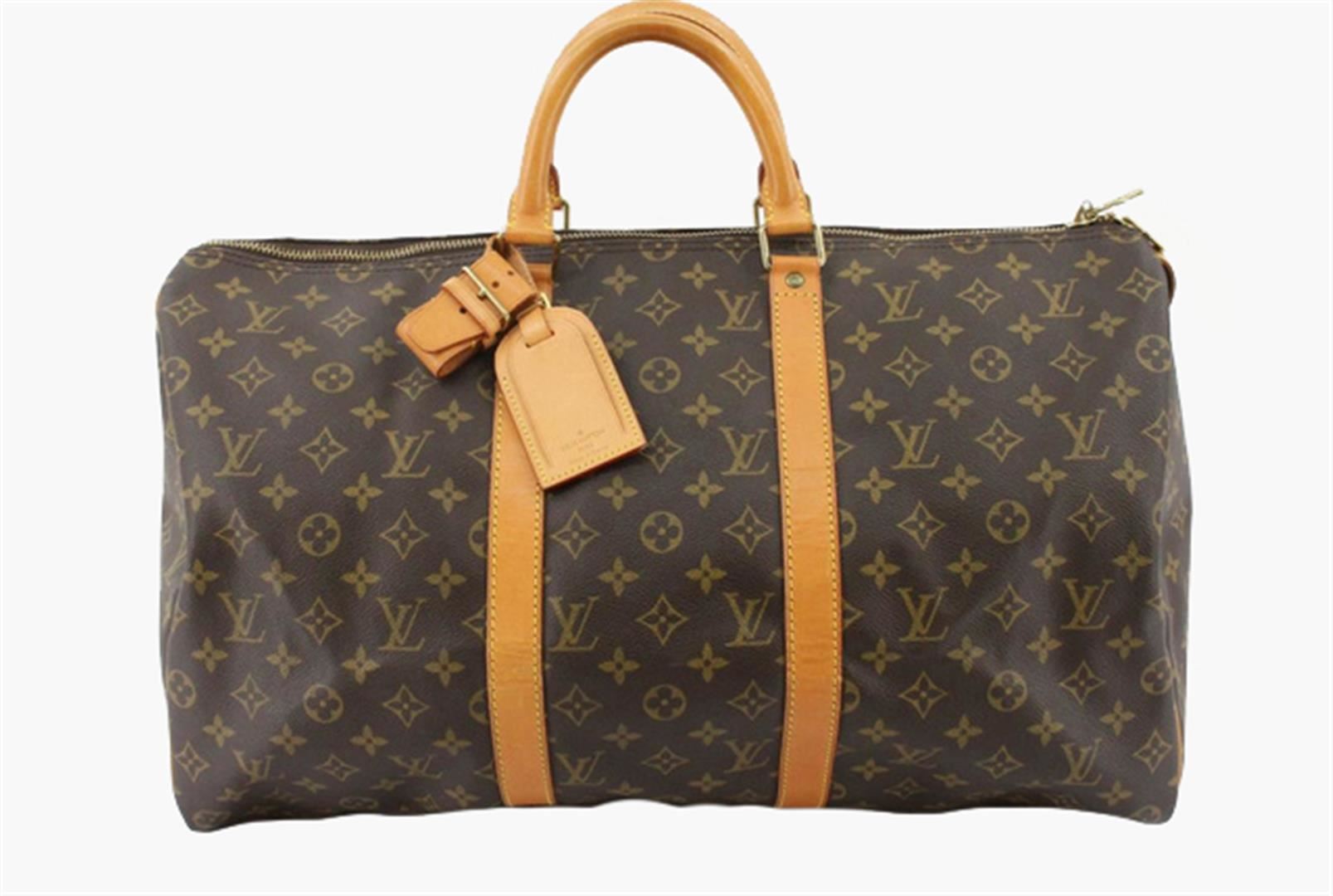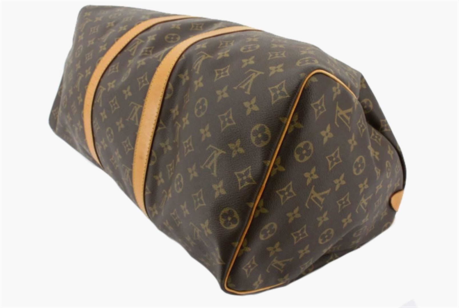 Brown and tan monogram coated canvas Louis Vuitton Keepall 50 with tan vachetta leather trim, gold-tone hardware, two rolled top handles, canvas interior lining and two-way zip closure at top. 20"x8.5"x10.5"xHandle Drop:4"/50.8cmx21.5cmx26.6cmxStrap Dr