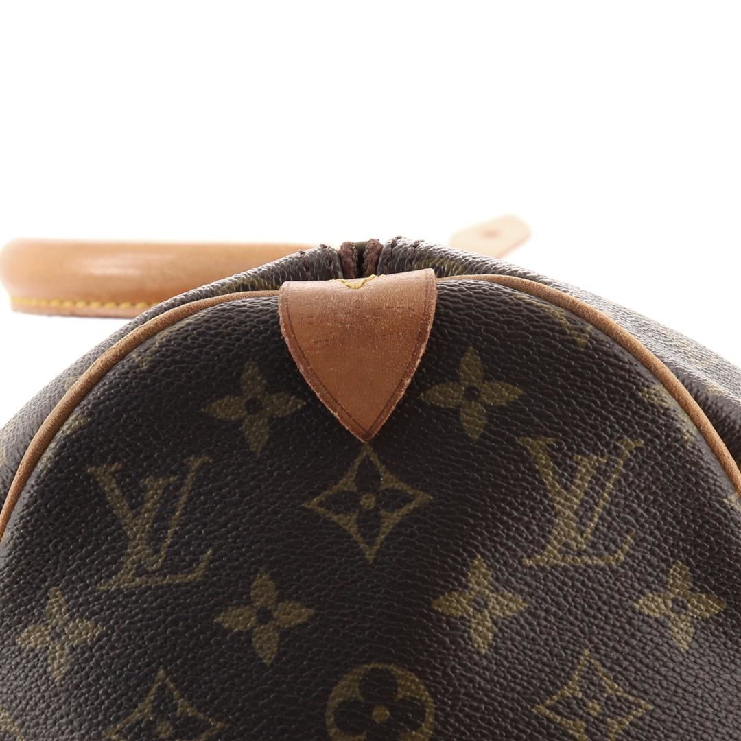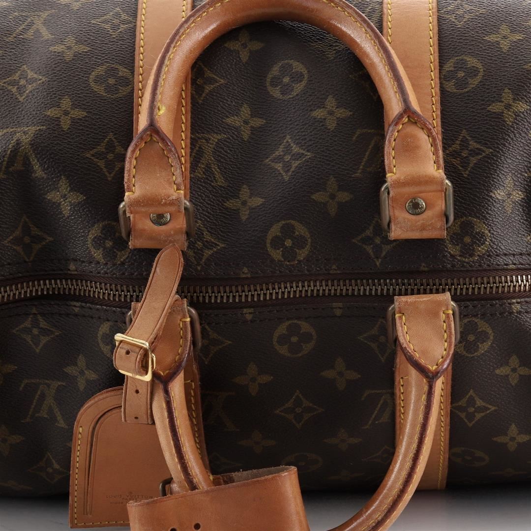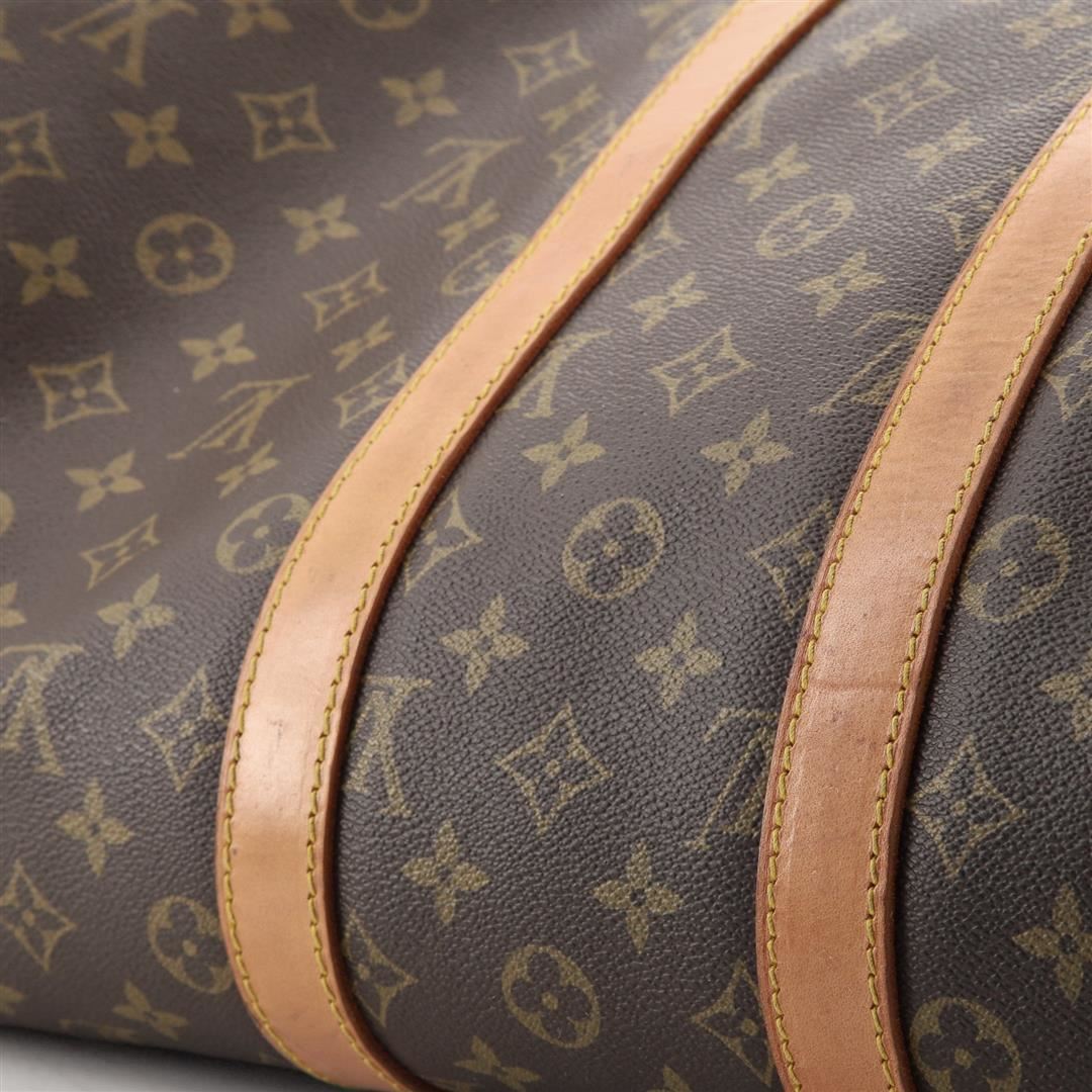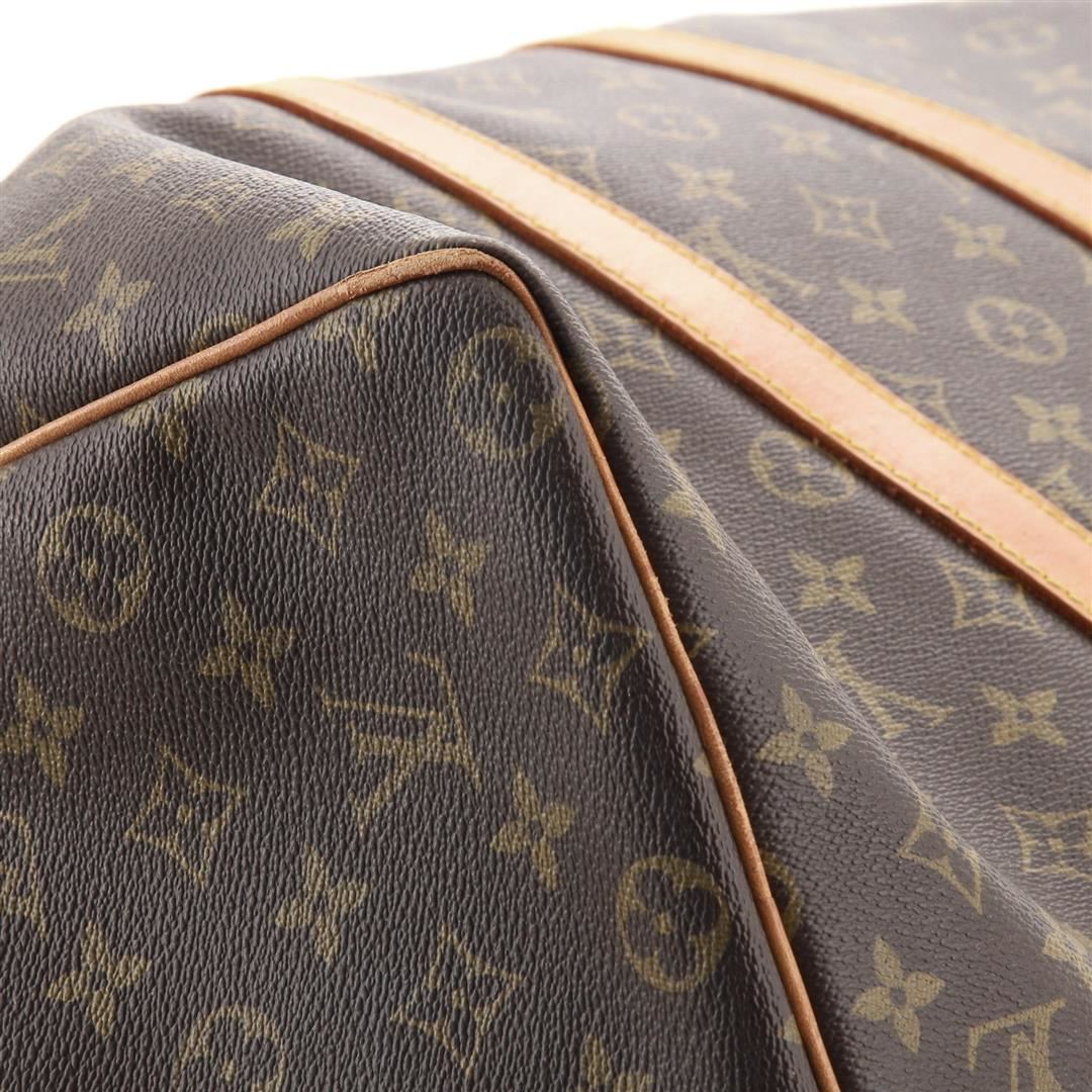 Louis Vuitton Brown Monogram Canvas Leather Keepall Duffle Bag Condition Details: Odor in interior. Creasing on exterior, heavy darkening, wear, scuffs and watermarks on leather trims and handles, cracking, splitting and fraying on handle wax edges. Mo