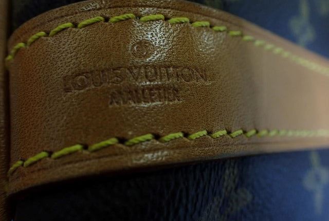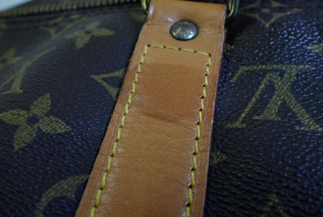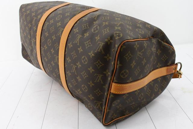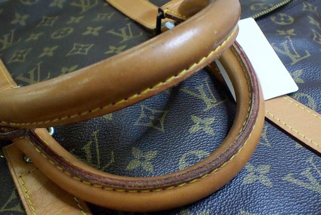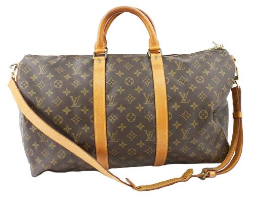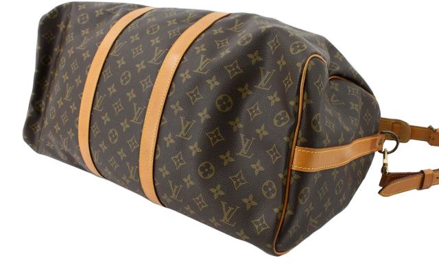 Brown and tan Monogram coated canvas Louis Vuitton Keepall Bandouliere with gold-tone hardware, tan vachetta leather trim, dual rolled top handles, brown canvas lining, single interior compartment and two-way zip closure at top. Detachable shoulder strap.